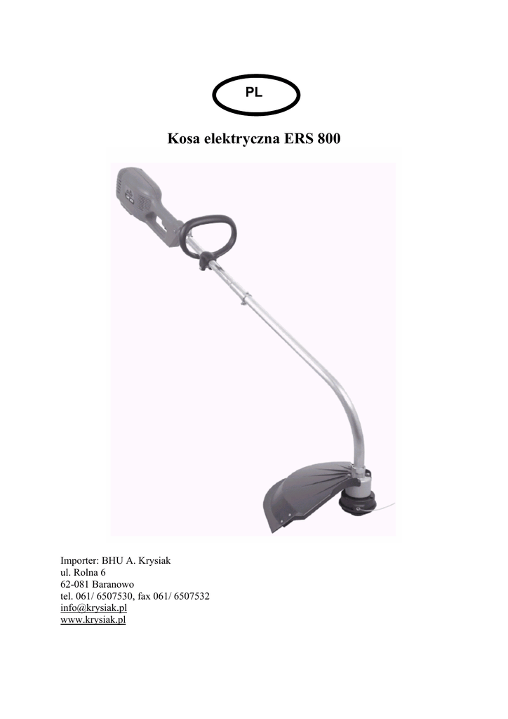 PL Kosa elektryczna ERS 800 Importer: BHU A. Krysiak ul. Rolna 6 62-081 Baranowo tel. 061/ 6507530, fax 061/ 6507532 [email protected] www.krysiak.pl Instrukcja obsługi Przed pierwszym uruchomieniem i rozpoczęciem użytkowania maszyny uważnie przeczytaj instrukcję obsługi – zapewni to bezpieczeństwo zarówno Tobie, jak i innym osobom. Starannie przechowuj instrukcję obsługi, by zapewnić sobie stały dostęp do zawartych w niej informacji. Spis treści Zasady bezpieczeństwa.................................................................................................3 Ogólne zasady bezpieczeństwa .................................................................................3 Symbole na urządzeniu..................................................................................................6 Opis działania.....................................................................................................................6 Opis ogólny .........................................................................................................................7 Instrukcja montażu ...........................................................................................................7 Obsługa kosy elektrycznej ............................................................................................8 Regulacja wysokości uchwytu .....................................................................................8 Zakładanie pasa naramiennego .................................................................................9 Włączanie i wyłączanie ..................................................................................................9 Przedłużanie żyłki tnącej .............................................................................................10 Wskazówki dotyczące przycinania ..........................................................................11 Konserwacja i oczyszczanie ......................................................................................12 Wymiana szpuli ...............................................................................................................12 Oczyszczanie ...................................................................................................................14 Przechowywanie .............................................................................................................14 Utylizacja i ochrona środowiska................................................................................14 Części zamienne.............................................................................................................14 Gwarancja .........................................................................................................................15 Dane techniczne .............................................................................................................15 2 Zasady bezpieczeństwa Ten rozdział zawiera podstawowe przepisy bezpieczeństwa, obowiązujące przy pracy z kosą elektryczną. Przy używaniu maszyny należy przestrzegać tych zasad bezpieczeństwa. Ogólne zasady bezpieczeństwa Przed rozpoczęciem pracy z urządzeniem spalinowym zapoznaj się dokładnie z wszystkimi jego elementami. Przećwicz sposób pracy z urządzeniem i poproś doświadczonego użytkownika lub specjalistę o wyjaśnienie funkcji i sposobu działania urządzenia oraz technik pracy. Upewnij się, że w razie nagłej potrzeby możesz natychmiast wyłączyć urządzenie. Nieprawidłowe użytkowanie urządzenia może prowadzić do ciężkich zranień. Praca z kosą elektryczną: • Urządzenie nie może być obsługiwane przez dzieci. Pracy z urządzeniem zabrania się ponadto osobom, które nie znają całej instrukcji obsługi. Prawo i przepisy lokalne mogą określać minimalny wiek użytkownika urządzenia. • Trzymaj urządzenie z daleka od ludzi – przede wszystkim dzieci – oraz zwierząt domowych. Jeżeli w pobliżu znajdują się ludzie (a przede wszystkim dzieci) czy zwierzęta domowe, przerwij pracę! Zawsze zachowuj wokół siebie odstęp bezpieczeństwa równy 5 m. Spod urządzenia mogą być wyrzucane kamyki i żwir, które mogą spowodować zranienie. • Podczas pracy zawsze noś praktyczne, ściśle przylegające ubranie robocze z długimi spodniami, które nie może się zaplątać w krzakach. Nie zakładaj szalika ani ozdób. • Używaj środków ochrony osobistej. Zawsze noś okulary ochronne, nauszniki z kapsułami ochronnymi, buty z twardą cholewą oraz rękawice ochronne (w miarę możliwości ze skóry chromowej). • Przy pracy zapewnij sobie stabilną postawę. Zachowaj szczególną ostrożność przy pracy na pochyłościach. • Nie pracuj z urządzeniem, jeżeli jesteś zmęczony albo jeżeli piłeś alkohol czy przyjmowałeś tabletki. Zawsze dostatecznie wcześnie rób przerwy na odpoczynek. 3 • Nie pracuj na deszczu, podczas złej pogody lub w wilgotnym otoczeniu. Pracuj wyłącznie przy dobrym oświetleniu. • Urządzenie jest przeznaczone do pracy oburęcznej. Kciuk i palce muszą mocno obejmować uchwyty. Nigdy nie pracuj jedną ręką. Zawsze używaj przy pracy pasa naramiennego. • Nie pracuj uszkodzonym, niekompletnym lub przebudowanym bez zgody producenta urządzeniem. Nigdy nie używaj urządzenia z uszkodzonym wyposażeniem ochronnym. Przed użyciem sprawdź bezpieczeństwo urządzenia, a szczególnie przewód zasilający prądem elektrycznym, włącznik-wyłącznik i osłonę ochronną. Element zabezpieczający i osobiste wyposażenie ochronne chronią zdrowie użytkownika oraz zdrowie innych osób i zapewniają prawidłową pracę urządzenia. • Przy włączaniu urządzenia oraz przy pracującym silniku trzymaj żyłkę tnącą z dala od wszelkich części ciała, a przede wszystkim od rąk i stóp. • Nie uruchamiaj urządzenia, gdy jest ono obrócone lub gdy nie znajduje się w pozycji roboczej. • Wyłącz silnik i 