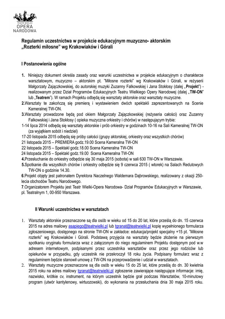 Regulamin uczestnictwa w projekcie edukacyjnym muzyczno- aktorskim „Rozterki miłosne” wg Krakowiaków i Górali I Postanowienia ogólne 1. Niniejszy dokument określa zasady oraz warunki uczestnictwa w projekcie edukacyjnym o charakterze warsztatowym, muzyczno – aktorskim pt. ”Miłosne rozterki” wg Krakowiaków i Górali, w reżyserii Małgorzaty Zajączkowskiej, do autorskiej muzyki Zuzanny Falkowskiej i Jana Stokłosy (dalej „ Projekt”) realizowanym przez Dział Programów Edukacyjnych Teatru Wielkiego Opery Narodowej (dalej „TW-ON” lub „Teatrem”). W ramach Projektu odbędą się warsztaty aktorskie oraz warsztaty muzyczne. 2.Warsztaty te zakończą się premierą i wystawieniem dwóch spektakli zaprezentowanych na Scenie Kameralnej TW-ON. 3.Warsztaty prowadzone będą pod okiem Małgorzaty Zajączkowskiej (reżyseria całości) oraz Zuzanny Falkowskiej i Jana Stokłosy ( opieka muzyczna orkiestry i chórów) w następującym trybie: 1-14 lipca 2014 odbędą się warsztaty aktorskie i prób orkiestry w godzinach 10-16 na Sali Kameralnej TW-ON (za wyjątkiem sobót i niedziel) 17-20 listopada 2015 odbędą się próby całości (grupy aktorskiej, orkiestry oraz wszystkich chórów) 21 listopada 2015 – PREMIERA godz.19.00 Scena Kameralna TW-ON 22 listopada 2015 – Spektakl godz.18.00 Scena Kameralna TW-ON 24 listopada 2015 – Spektakl godz.19.00 Scena Kameralna TW-ON 4.Przesłuchanie do orkiestry odbędzie się 30 maja 2015 (sobota) w sali 630 TW-ON w Warszawie. 5.Spotkanie dla wszystkich chórów i orkiestry odbędzie się 9 czerwca 2015 ( wtorek) na Salach Redutowych TW-ON o godzinie 14.30. 6.Projekt objęty jest patronatem Dyrektora Naczelnego Waldemara Dąbrowskiego, realizowany z okazji 250lecia obchodów Teatru Narodowego. 7.Organizatorem Projektu jest Teatr Wielki-Opera Narodowa- Dział Programów Edukacyjnych w Warszawie, pl. Teatralnym 1, 00-950 Warszawa. II Warunki uczestnictwa w warsztatach 1. Warsztaty aktorskie przeznaczone są dla osób w wieku od 15 do 20 lat, które prześlą do dn. 15 czerwca 2015 na adres mailowy [email protected] lub [email protected] kopię wypełnionego formularza zgłoszeniowego, dostępnego na stronie TW-ON w zakładce: edukacja/projekt specjalny +15 pt. ”Miłosne rozterki” wg Krakowiaków i Górali. Podstawą przyjęcia na warsztaty będzie złożenie na pierwszym spotkaniu oryginału formularza wraz z załączonym do niego regulaminem Projektu dostępnym pod w.w adresem internetowym, podpisanymi przez uczestnika warsztatów oraz przez jego rodziców lub opiekunów w przypadku, gdy uczestnik nie przekroczył 18 roku życia. Podpisany formularz wraz z regulaminem będzie stanowił umowę z TW-ON na przeprowadzenie i udział w warsztatach. 2. Warsztaty muzyczne przeznaczone są dla osób w wieku 15 do 25 lat, które prześlą do dn. 30 kwietnia 2015 roku na adres mailowy [email protected] zgłoszenie zawierające następujące informacje: imię, nazwisko, krótkie cv, instrument, na którym uczestnik będzie grał podczas Warsztatów, 10-minutowy program (utwór kantylenowy, wirtuozowski), do wykonania na przesłuchania dnia 30 maja 2015 roku. 3. 4. 5. 6. Podstawą przyjęcia na warsztaty będzie złożenie na spotkaniu w dniu 9 czerwca 2015 roku oryginału formularza wraz z załączonym do niego regulaminem Projektu, podpisanymi przez uczestnika warsztatów oraz przez jego rodziców lub opiekunów w przypadku, gdy uczestnik nie przekroczył 18 roku życia. Podpisany formularz wraz z regulaminem będzie stanowił umowę z TW-ON na przeprowadzenie i udział w warsztatach. Formularz wraz z regulaminem zostanie przekazany Uczestnikom w celu podpisania, podczas przesłuchania w dniu 30 kwietnia 2015 roku. O przyjęciu na Warsztaty decyduje kolejność zgłoszeń. Liczba miejsc jest ograniczona. Teatr nie pokrywa kosztów dojazdu oraz nie zapewnia wyżywienia. Uczestnicy Warsztatów są objęci ubezpieczeniem NNW. Udział w Warsztatach jest bezpłatny. III Wykorzystanie materiałów 1. Uczestnicy przenoszą na Teatr wszelkie prawa pokrewne do nieograniczonego w czasie i przestrzeni, w kraju i za granicą, korzystania i rozporządzania w całości lub we fragmentach artystycznymi wykonaniami Uczestników lub dowolnymi sekwencjami ruchu z udziałem Uczestników oraz głosu Uczestników podczas warsztatów, prób, premier oraz w spektaklach. 2. Przeniesienie praw następuje na cały czas ich trwania i Teatr ma prawo przenoszenia nabytych praw na osoby trzecie. 3. Przeniesienie obejmuje następujące pola eksploatacji: 1. wystawienie spektaklu z artystycznym wykonaniem Uczestników, 2. utrwalenie- rejestrację audiowizualną lub/i audialną warsztatów, prób, premier oraz spektakli z artystycznym wykonaniem Uczestników na dowolnym nośniku materialnym wraz z prawem do wielokrotnego nadawania zarejestrowanych artystycznych wykonań Uczestników we fragmentach za pomocą wizji lub fonii przewodowej lub bezprzewodowej przez stacje naziemne oraz za pośrednictwem satelity w tym transmisja na żywo, reemisja równoczesna i integralna przez stacje telewizyjne,w tym dla celów reklamy i promocji Teatru lub projektu, 3. publiczne odtwarzanie lub wyświetlanie materiału z zarejestrowanym artystycznym wykonaniem Uczestników, 4. umieszczenia zarejestrowanych artystycznych wykonań Uczestników na nośnikach audiowizualnych lub audialnych w zbiorach archiwalnych podmiotu dokonującego rejestracji oraz wykorzystywania poprzez nadanie fragmentów tych wykonań w programach monograficznych, kronikarskich i edukacyjnych, 5. prawo do zwielokrotnienia zarejestrowanego materiału z artystycznym wykonaniem Uczestników w nieograniczonej ilości, w dowolnej formie, w tym audiowizualnej, audialnej w każdym systemie, standardzie i formacie, na każdym nośniku, w tym w technice elektronicznej, cyfrowej, komputerowej oraz na kasetach, CD, DVD, 6. wprowadzenie do obrotu nośników z artystycznym wykonaniem Uczestników w nieograniczonej ilości na