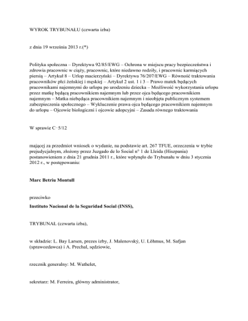 WYROK TRYBUNAŁU (czwarta izba) z dnia 19 września 2013 r.(*) Polityka społeczna – Dyrektywa 92/85/EWG – Ochrona w miejscu pracy bezpieczeństwa i zdrowia pracownic w ciąży, pracownic, które niedawno rodziły, i pracownic karmiących piersią – Artykuł 8 – Urlop macierzyński – Dyrektywa 76/207/EWG – Równość traktowania pracowników płci żeńskiej i męskiej – Artykuł 2 ust. 1 i 3 – Prawo matek będących pracownikami najemnymi do urlopu po urodzeniu dziecka – Możliwość wykorzystania urlopu przez matkę będącą pracownikiem najemnym lub przez ojca będącego pracownikiem najemnym – Matka niebędąca pracownikiem najemnym i nieobjęta publicznym systemem zabezpieczenia społecznego – Wykluczenie prawa ojca będącego pracownikiem najemnym do urlopu – Ojcowie biologiczni i ojcowie adopcyjni – Zasada równego traktowania W sprawie C‑5/12 mającej za przedmiot wniosek o wydanie, na podstawie art. 267 TFUE, orzeczenia w trybie prejudycjalnym, złożony przez Juzgado de lo Social n° 1 de Lleida (Hiszpania) postanowieniem z dnia 21 grudnia 2011 r., które wpłynęło do Trybunału w dniu 3 stycznia 2012 r., w postępowaniu: Marc Betriu Montull przeciwko Instituto Nacional de la Seguridad Social (INSS), TRYBUNAŁ (czwarta izba), w składzie: L. Bay Larsen, prezes izby, J. Malenovský, U. Lõhmus, M. Safjan (sprawozdawca) i A. Prechal, sędziowie, rzecznik generalny: M. Wathelet, sekretarz: M. Ferreira, główny administrator, uwzględniając pisemny etap postępowania i po przeprowadzeniu rozprawy w dniu 21 lutego 2013 r., rozważywszy uwagi przedstawione: – w imieniu Instituto Nacional de la Seguridad Social (INSS) przez P. Garcíę Pereę oraz A.R. Trilla Garcíę, działających w charakterze pełnomocników, – w imieniu rządu hiszpańskiego przez A. Rubia Gonzáleza, działającego w charakterze pełnomocnika, – w imieniu rządu polskiego przez B. Majczynę, J. Faldygę oraz A. Siwek, działających w charakterze pełnomocników, – w imieniu Komisji Europejskiej przez M. van Beeka, C. Gheorghiu oraz S. Pardo Quintillán, działających w charakterze pełnomocników, po zapoznaniu się z opinią rzecznika generalnego na posiedzeniu w dniu 11 kwietnia 2013 r., wydaje następujący Wyrok 1 Wniosek o wydanie orzeczenia w trybie prejudycjalnym dotyczy wykładni dyrektywy Rady 76/207/EWG z dnia 9 lutego 1976 r. w sprawie wprowadzenia w życie zasady równego traktowania kobiet i mężczyzn w zakresie dostępu do zatrudnienia, kształcenia i awansu zawodowego oraz warunków pracy (Dz.U. L 39, s. 40), dyrektywy Rady 96/34/WE z dnia 3 czerwca 1996 r. w sprawie porozumienia ramowego dotyczącego urlopu rodzicielskiego zawartego przez UNICE, CEEP oraz ETUC (Dz.U. L 145, s. 4), zmienionej dyrektywą Rady 97/75/WE z dnia 15 grudnia 1997 r. (Dz.U. 1998, L 10, s. 24) (zwanej dalej „dyrektywą 96/34”), oraz ustanowionej w prawie Unii zasady równego traktowania. 2 Wniosek ten został przedstawiony w ramach sporu między M. Betriu Montullem a Instituto Nacional de la Seguridad Social (INSS) (krajowym instytutem zabezpieczeń społecznych) w przedmiocie odmowy przyznania M. Betriu Montullowi świadczenia z tytułu macierzyństwa ze względu na nieobjęcie matki jego dziecka publicznym systemem zabezpieczenia społecznego. Ramy prawne Prawo międzynarodowe 3 Zgodnie z art. 10 ust. 2 Międzynarodowego paktu praw gospodarczych, społecznych i kulturalnych, przyjętego przez Zgromadzenie Ogólne Narodów Zjednoczonych w dniu 16 grudnia 1966 r., który to pakt wszedł w życie w dniu 3 stycznia 1976 r.: „Szczególną opieką należy otoczyć matki w rozsądnym okresie przed i po urodzeniu dziecka. W tym czasie pracujące matki powinny otrzymywać płatny urlop lub urlop z zapewnieniem odpowiednich świadczeń z tytułu zabezpieczenia społecznego”. Prawo Unii Dyrektywa 76/207 4 Dyrektywa 76/207, zmieniona dyrektywą 2002/73/WE Parlamentu Europejskiego i Rady z dnia 23 września 2002 r. (Dz.U. L 269, s. 15), została uchylona, ze skutkiem od dnia 15 sierpnia 2009 r., przez dyrektywę 2006/54/WE Parlamentu Europejskiego i Rady z dnia 5 lipca 2006 r. w sprawie wprowadzenia w życie zasady równości szans oraz równego traktowania kobiet i mężczyzn w dziedzinie zatrudnienia i pracy (Dz.U. L 204, s. 23). Jednakże ze względu na czas zajścia okoliczności faktycznych w postępowaniu głównym zastosowanie do niego znajdują nadal przepisy dyrektywy 76/207 w jej pierwotnym brzmieniu. 5 Artykuł 1 ust. 1 dyrektywy 76/207 stanowił: „Niniejsza dyrektywa stawia sobie za cel wprowadzenie w życie w państwach członkowskich zasady równego traktowania kobiet i mężczyzn w zakresie dostępu do zatrudnienia, w tym awansu i kształcenia zawodowego, jak również warunków pracy oraz, w sytuacjach przewidzianych w ust. 2, zabezpieczenia społecznego. W dalszej części zasada ta będzie określana mianem »zasady równego traktowania«”. 6 Artykuł 2 ust. 1 i 3 tej dyrektywy miał następujące brzmienie: „1. Do celów następujących postanowień zasada równego traktowania oznacza brak jakiejkolwiek bezpośredniej lub pośredniej dyskryminacji ze względu na płeć, przez odniesienie w szczególności do stanu cywilnego lub rodzinnego. […] 3. Niniejsza dyrektywa nie narusza przepisów dotyczących ochrony kobiet, zwłaszcza jeśli chodzi o ciążę i macierzyństwo”. 7 Artykuł 5 omawianej dyrektywy przewidywał: „1. Stosowanie zasady równego traktowania w zakresie warunków pracy, w tym warunków wypowiedzenia, pociąga za sobą konieczność zapewnienia mężczyznom i kobietom takich samych warunków, bez dyskryminacji ze względu na płeć. 2. Państwa członkowskie podejmują niezbędne środki w celu zapewnienia, aby: a) przepisy ustawowe, wykonawcze i administracyjne, sprzeczne z zasadą równego traktowania, zostały uchylone; b) przepisy sprzeczne z zasadą równego traktowania, zawarte w układach zbiorowych lub w indywidualnych umowach 