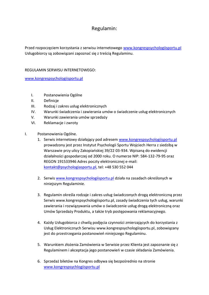 Regulamin: Przed rozpoczęciem korzystania z serwisu internetowego www.kongrespsychologiisportu.pl Usługobiorcy są zobowiązani zapoznać się z treścią Regulaminu. REGULAMIN SERWISU INTERNETOWEGO: www.kongrespsychologiisportu.pl I. II. III. IV. V. VI. I. Postanowienia Ogólne Definicje Rodzaj i zakres usług elektronicznych Warunki świadczenia i zawierania umów o świadczenie usług elektronicznych Warunki zawierania umów sprzedaży Reklamacje i zwroty Postanowienia Ogólne. 1. Serwis internetowy działający pod adresem www.kongrespsychologiisportu.pl prowadzony jest przez Instytut Psychologii Sportu Wojciech Herra z siedzibą w Warszawie przy ulicy Zakopiańskiej 39/22 03-934. Wpisaną do ewidencji działalności gospodarczej od 2000 roku. O numerze NIP: 584-132-79-95 oraz REGON 191533946 Adres poczty elektronicznej e-mail: [email protected], tel: +48 530 552 044 2. Serwis www.kongrespsychologiisportu.pl działa na zasadach określonych w niniejszym Regulaminie. 3. Regulamin określa rodzaje i zakres usług świadczonych drogą elektroniczną przez Serwis www.kongrespsychologiisportu.pl, zasady świadczenia tych usług, warunki zawierania i rozwiązywania umów o świadczenie usług drogą elektroniczną oraz Umów Sprzedaży Produktu, a także tryb postępowania reklamacyjnego. 4. Każdy Usługobiorca z chwilą podjęcia czynności zmierzających do korzystania z Usług Elektronicznych Serwisu www.kongrespsychologiisportu.pl, zobowiązany jest do przestrzegania postanowień niniejszego Regulaminu. 5. Warunkiem złożenia Zamówienia w Serwisie przez Klienta jest zapoznanie się z Regulaminem i akceptacja jego postanowień w czasie składania Zamówienia. 6. Sprzedaż biletów na Kongres odbywa się bezpośrednio na stronie www.kongrespsychlogiisportu.pl 7. Oferowane Bilety są nowe, wolne od wad fizycznych i prawnych oraz zostały legalnie wprowadzone na rynek polski. 8. W sprawach nieuregulowanych w niniejszym Regulaminie mają zastosowanie przepisy a. Ustawy o świadczeniu usług drogą elektroniczną z dnia 18 lipca 2002 r. (Dz. U. Nr 144, poz. 1204 ze zm.), b. Ustawy o prawach konsumenta z dnia 30 maja 2014 r. (Dz. U. 2014 poz. 827), c. Ustawy Kodeks cywilny z dnia 23 kwietnia 1964 r. (Dz. U. nr 16, poz. 93 ze zm.) oraz inne właściwe przepisy prawa polskiego. II. Definicje. 1. Dzień Roboczy - jeden dzień od poniedziałku do piątku z wyłączeniem dni ustawowo wolnych od pracy. 2. FORMULARZ ZAMÓWIENIA – formularz dostępny na stronie internetowej www.kongrespsychologiisportu.pl umożliwiający złożenie Zamówienia. 3. KLIENT – Usługobiorca, który zamierza zawrzeć lub zawarł Umowę Sprzedaży z Usługodawcą. 4. KONSUMENT - osoba fizyczna, która dokonuje z przedsiębiorcą czynności prawnej niezwiązanej bezpośrednio z jej działalnością gospodarczą lub zawodową. 5. NEWSLETTER – usługa Elektroniczna pozwalająca Usługobiorcy na subskrybowanie i otrzymywanie na podany przez Usługobiorcę adres e-mail bezpłatnych informacji pochodzących od Usługodawcy, dotyczących Produktów dostępnych w Serwisie 6. REGULAMIN - niniejszy regulamin Serwisu. 7. SERWIS - serwis internetowy Usługodawcy działający pod adresem www.kongrespsychologiisportu.pl 8. UMOWA SPRZEDAŻY – Umowa Sprzedaży Produktu zawarta między Klientem, a Sprzedawcą za pośrednictwem Serwisu. 9. USŁUGOBIORCA – osoba fizyczna, osoba prawna albo jednostka organizacyjna nieposiadająca osobowości prawnej, której ustawa przyznaje zdolność prawną korzystająca z Usługi Elektronicznej. 10. USŁUGODAWCA, SPRZEDAWCA – Instytut Psychologii Sportu Wojciech Herra z siedzibą w Warszawie przy ulicy Zakopiańskiej 39/22 03-934. O numerze NIP: 584132-79-95 oraz REGON 191533946 11. USŁUGA ELEKTRONICZNA – usługa świadczona drogą elektroniczną przez Usługodawcę na rzecz Usługobiorcy za pośrednictwem Serwisu. 12. ZAMÓWIENIE - oświadczenie woli Klienta stanowiące ofertę zawarcia Umowy Sprzedaży. III. Rodzaj i zakres usług elektronicznych. 1. Usługodawca umożliwia za pośrednictwem Serwisu korzystanie z Usług Elektronicznych takich jak: a. Zawarcie umów sprzedaży Produktu 2. Świadczenie Usług na rzecz Usługobiorców w Serwisie odbywa się na warunkach określonych w Regulaminie. 3. Usługodawca ma prawo do zamieszczania na stronie Serwisu treści reklamowych. Treści te, stanowią integralną część Serwisu i prezentowanych w nim materiałów IV. Warunki świadczenia i zawierania umów o świadczenie usług elektronicznych. 1. Świadczenie Usługi Elektronicznej określonej w rozdziale III pkt. 1 lit. a) Regulaminu przez Usługodawcę jest płatne, a wszelkie prowizje i opłaty są wliczone w cenę biletu. Serwis zastrzega sobie prawo do wprowadzenia odpłatności poszczególnych kategorii biletów, o czym Usługobiorca będzie każdorazowo informowany w procesie składania Zamówienia. 2. Okres na jaki umowa zostaje zawarta: a. umowa o świadczenie Usługi Elektronicznej polegającej na umożliwieniu złożenia Zamówienia w Serwisie zawierana jest na czas oznaczony i ulega rozwiązaniu z chwilą złożenia Zamówienia albo zaprzestania jego składania przez Usługobiorcę 3. Wymagania techniczne niezbędne do współpracy z systemem teleinformatycznym, którym posługuje się Usługodawca: a. komputer z dostępem do Internetu, b. dostęp do poczty elektronicznej, c. przeglądarka internetowa, d. włączenie w przeglądarce internetowej Cookies oraz Javascript. 4. Usługobiorca zobowiązany jest do korzystania z Serwisu w sposób zgodny z prawem i dobrymi obyczajami mając na uwadze poszanowanie dóbr osobistych i praw własności intelektualnej osób trzecich. 5. Usługobiorca zobowiązany jest do wprowadzania danych zgodnych ze stanem faktycznym. 6. Usługobiorcę obowiązuje zakaz dostarczania treści o charakterze bezprawnym. V. Warunki zawierania umów sprzedaży. 1.Cena biletu uwidoczniona na stronie internetowej Serwisu podana jest w złotych polskich (PLN) 