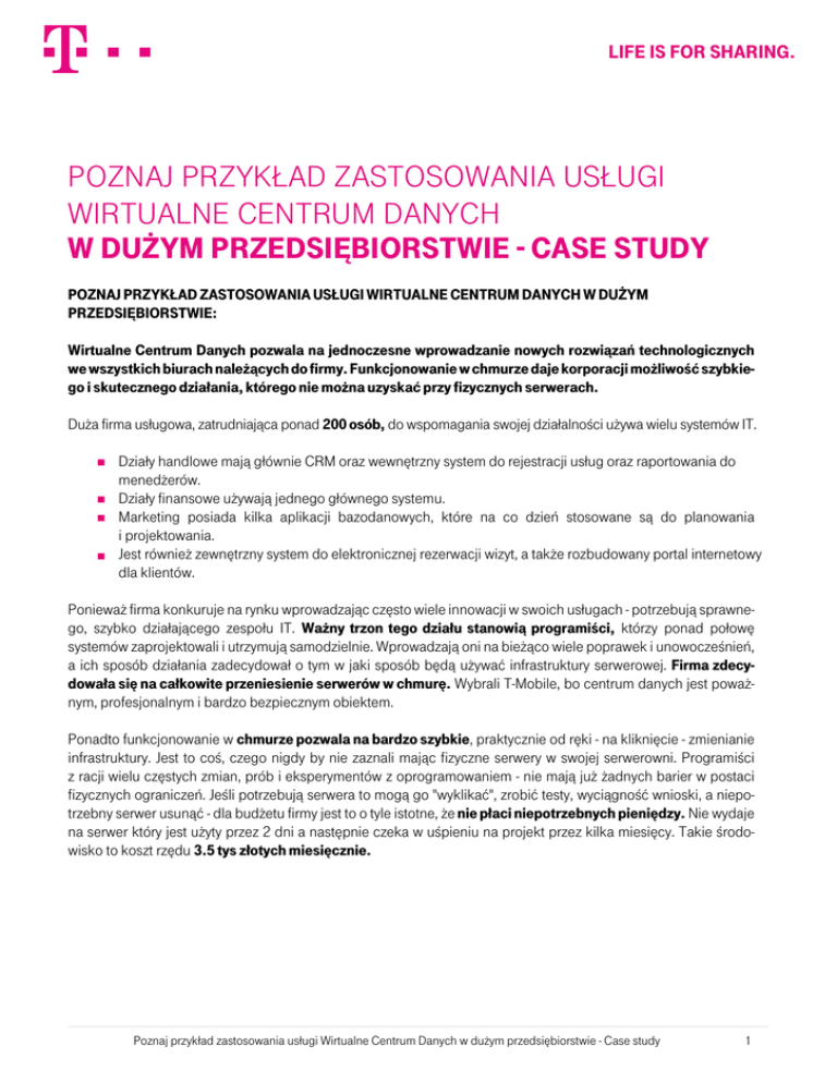 life is for sharing. poznaj przykład zastosowania usługi wirtualne centrum danych w dużym przedsiębiorstwie - case study POZNAJ PRZYKŁAD ZASTOSOWANIA USŁUGI WIRTUALNE CENTRUM DANYCH W DUŻYM PRZEDSIĘBIORSTWIE: Wirtualne Centrum Danych pozwala na jednoczesne wprowadzanie nowych rozwiązań technologicznych we wszystkich biurach należących do firmy. Funkcjonowanie w chmurze daje korporacji możliwość szybkiego i skutecznego działania, którego nie można uzyskać przy fizycznych serwerach. Duża firma usługowa, zatrudniająca ponad 200 osób, do wspomagania swojej działalności używa wielu systemów IT. Działy handlowe mają głównie CRM oraz wewnętrzny system do rejestracji usług oraz raportowania do menedżerów. Działy finansowe używają jednego głównego systemu. Marketing posiada kilka aplikacji bazodanowych, które na co dzień stosowane są do planowania i projektowania. Jest również zewnętrzny system do elektronicznej rezerwacji wizyt, a także rozbudowany portal internetowy dla klientów. Ponieważ firma konkuruje na rynku wprowadzając często wiele innowacji w swoich usługach - potrzebują sprawnego, szybko działającego zespołu IT. Ważny trzon tego działu stanowią programiści, którzy ponad połowę systemów zaprojektowali i utrzymują samodzielnie. Wprowadzają oni na bieżąco wiele poprawek i unowocześnień, a ich sposób działania zadecydował o tym w jaki sposób będą używać infrastruktury serwerowej. Firma zdecydowała się na całkowite przeniesienie serwerów w chmurę. Wybrali T-Mobile, bo centrum danych jest poważnym, profesjonalnym i bardzo bezpiecznym obiektem. Ponadto funkcjonowanie w chmurze pozwala na bardzo szybkie, praktycznie od ręki - na kliknięcie - zmienianie infrastruktury. Jest to coś, czego nigdy by nie zaznali mając fizyczne serwery w swojej serwerowni. Programiści z racji wielu częstych zmian, prób i eksperymentów z oprogramowaniem - nie mają już żadnych barier w postaci fizycznych ograniczeń. Jeśli potrzebują serwera to mogą go "wyklikać", zrobić testy, wyciągność wnioski, a niepotrzebny serwer usunąć - dla budżetu firmy jest to o tyle istotne, że nie płaci niepotrzebnych pieniędzy. Nie wydaje na serwer który jest użyty przez 2 dni a następnie czeka w uśpieniu na projekt przez kilka miesięcy. Takie środowisko to koszt rzędu 3.5 tys złotych miesięcznie. Poznaj przykład zastosowania usługi Wirtualne Centrum Danych w dużym przedsiębiorstwie - Case study 1
