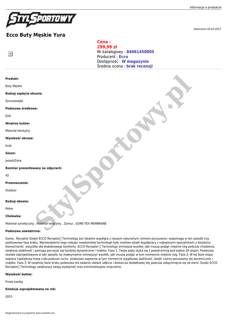 Informacje o produkcie Utworzono 02-03-2017 Ecco Buty Męskie Yura Cena : 299,99 zł Nr katalogowy : 84061450805 Producent : Ecco Dostępność : W magazynie Średnia ocena : brak recenzji Produkt: pl Buty Męskie Rodzaj zapięcia obuwia: y. Sznurowadła Podeszwa środkowa: Wnętrze butów: Materiał tekstylny Wysokość obcasa: brak Sezon: Jesień/Zima 42 Przeznaczenie: Outdoor Pełne Cholewka: St y Rodzaj obuwia: lS p Rozmiar prezentowany na zdjęciach: or to w EVA Materiał syntetyczny , Materiał tekstylny , Zamsz , GORE-TEX MEMBRANE Podeszwa zewnętrzna: Guma , Receptor Dzięki ECCO Receptor Technology but idealnie współgra z naszym naturalnym rytmem poruszania i wspomaga w ten sposób trzy podstawowe fazy kroku. Wprowadzenie tego rodzaju nowatorskiej technologii było możliwe dzięki współpracy z najlepszymi specjalistami z dziedziny biomechaniki wszystko dla dodatkowego komfortu. ECCO Receptor Technology zmniejsza wysiłek, jaki muszą podjąć mięśnie nóg podczas chodzenia, zwiększa stabilność i pomaga poruszać się bardziej dynamicznie i miękko. Faza 1: Twoja pięta styka się z powierzchnią pod kątem 20 stopni. Podeszwa została zaprojektowana w taki sposób, by maksymalnie zmniejszyć wysiłek, jaki muszą podjąć w tym momencie mięśnie nóg. Faza 2: W tej fazie stopa wspiera największą masę ciała podczas ruchu podeszwa zapewnia w tym momencie wyjątkową stabilność, dzięki czemu poruszamy się dynamicznie i miękko. Faza 3: W ostatniej fazie kroku podeszwa ma zadanie ułatwić odbicie i dostarcza dodatkowej siły podczas odepchnięcia się od ziemi. Dzięki ECCO Receptor Technology zwiększysz swoją wydajność oraz zminimalizujesz zmęczenie. Wysokość butów: Przed kostkę Kolekcja zaprojektowana na rok: 2015 Wygenerowano w programie www.oscGold.com Kolor: Niebieski i jego odcienie Dodatkowy opis: Załóż te sportowe buty na miejskie ulice lub na wyprawę do lasu pasują do każdego środowiska. Są to lekkie buty turystyczne używane przez alpinistów w początkowych etapach wspinaczki, stąd wiesz już, że są odpowiednie na niemal każdą przygodę, choć zostały wykonany z miękkiego i elastycznego zamszu dla uzyskania całodniowego komfortu. Technologia RECEPTOR zapewnia dynamiczną i naturalną postawę podczas chodzenia, a przyczepność jest zawsze zachowana dzięki chropowatej podeszwie z gumy. Eleganckie obuwie sportowe, które pasje zarówno na ulice miejskie, jak i na szlak Dłuższe sznurowadła pozwalają na dokładne dopasowanie Wstawka na języku zapobiega dostawaniu się kamieni i brudu do środka obuwia Nigdy nie zwalniaj kroku dzięki dynamicznej technologii RECEPTOR Podeszwa środkowa z PU i gumowa podeszwa zewnętrzna zapewniają całodniową amortyzację i przyczepność Materiał: Synthetic/Cow Suede & Textile lining Wyjmowane wkładki buty turystyczne 84061450805 St y lS p Rozmiar: 41, 42, 43, 44, 45, 46, 47, 48. or to w Dostępne opcje Ecco Buty Męskie Yura y. pl Wskazówki użycia: