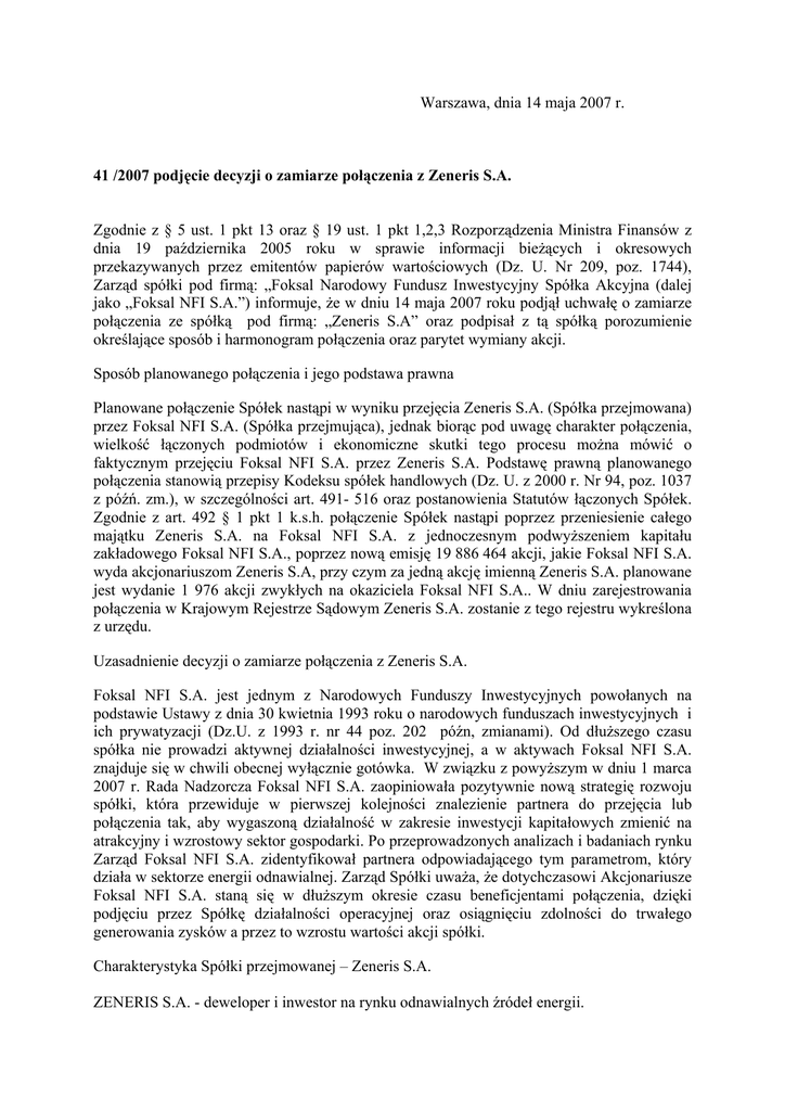 Warszawa, dnia 14 maja 2007 r. 41 /2007 podjęcie decyzji o zamiarze połączenia z Zeneris S.A. Zgodnie z § 5 ust. 1 pkt 13 oraz § 19 ust. 1 pkt 1,2,3 Rozporządzenia Ministra Finansów z dnia 19 października 2005 roku w sprawie informacji bieżących i okresowych przekazywanych przez emitentów papierów wartościowych (Dz. U. Nr 209, poz. 1744), Zarząd spółki pod firmą: „Foksal Narodowy Fundusz Inwestycyjny Spółka Akcyjna (dalej jako „Foksal NFI S.A.”) informuje, że w dniu 14 maja 2007 roku podjął uchwałę o zamiarze połączenia ze spółką pod firmą: „Zeneris S.A” oraz podpisał z tą spółką porozumienie określające sposób i harmonogram połączenia oraz parytet wymiany akcji. Sposób planowanego połączenia i jego podstawa prawna Planowane połączenie Spółek nastąpi w wyniku przejęcia Zeneris S.A. (Spółka przejmowana) przez Foksal NFI S.A. (Spółka przejmująca), jednak biorąc pod uwagę charakter połączenia, wielkość łączonych podmiotów i ekonomiczne skutki tego procesu można mówić o faktycznym przejęciu Foksal NFI S.A. przez Zeneris S.A. Podstawę prawną planowanego połączenia stanowią przepisy Kodeksu spółek handlowych (Dz. U. z 2000 r. Nr 94, poz. 1037 z późń. zm.), w szczególności art. 491- 516 oraz postanowienia Statutów łączonych Spółek. Zgodnie z art. 492 § 1 pkt 1 k.s.h. połączenie Spółek nastąpi poprzez przeniesienie całego majątku Zeneris S.A. na Foksal NFI S.A. z jednoczesnym podwyższeniem kapitału zakładowego Foksal NFI S.A., poprzez nową emisję 19 886 464 akcji, jakie Foksal NFI S.A. wyda akcjonariuszom Zeneris S.A, przy czym za jedną akcję imienną Zeneris S.A. planowane jest wydanie 1 976 akcji zwykłych na okaziciela Foksal NFI S.A.. W dniu zarejestrowania połączenia w Krajowym Rejestrze Sądowym Zeneris S.A. zostanie z tego rejestru wykreślona z urzędu. Uzasadnienie decyzji o zamiarze połączenia z Zeneris S.A. Foksal NFI S.A. jest jednym z Narodowych Funduszy Inwestycyjnych powołanych na podstawie Ustawy z dnia 30 kwietnia 1993 roku o narodowych funduszach inwestycyjnych i ich prywatyzacji (Dz.U. z 1993 r. nr 44 poz. 202 późn, zmianami). Od dłuższego czasu spółka nie prowadzi aktywnej działalności inwestycyjnej, a w aktywach Foksal NFI S.A. znajduje się w chwili obecnej wyłącznie gotówka. W związku z powyższym w dniu 1 marca 2007 r. Rada Nadzorcza Foksal NFI S.A. zaopiniowała pozytywnie nową strategię rozwoju spółki, która przewiduje w pierwszej kolejności znalezienie partnera do przejęcia lub połączenia tak, aby wygaszoną działalność w zakresie inwestycji kapitałowych zmienić na atrakcyjny i wzrostowy sektor gospodarki. Po przeprowadzonych analizach i badaniach rynku Zarząd Foksal NFI S.A. zidentyfikował partnera odpowiadającego tym parametrom, który działa w sektorze energii odnawialnej. Zarząd Spółki uważa, że dotychczasowi Akcjonariusze Foksal NFI S.A. staną się w dłuższym okresie czasu beneficjentami połączenia, dzięki podjęciu przez Spółkę działalności operacyjnej oraz osiągnięciu zdolności do trwałego generowania zysków a przez to wzrostu wartości akcji spółki. Charakterystyka Spółki przejmowanej – Zeneris S.A. ZENERIS S.A. - deweloper i inwestor na rynku odnawialnych źródeł energii. ZENERIS S.A. jest spółką z ponad 10-letnią historią. Firma rozwija obecnie działalność inwestycyjną i deweloperską na rynku odnawialnych źródeł energii (OZE). Rynek ten jest wspierany przez prawo unijne, ustawodawstwo polskie i rozwija się w tempie, co najmniej kilkunastu procent rocznie. Spółka jest zarejestrowana w Poznaniu, przy ul. Paderewskiego 8, wpisana do rejestru przedsiębiorców prowadzonego przez Sąd Rejonowy w Poznaniu, XXI Wydział Gospodarczy Krajowego Rejestru Sądowego pod numerem 0000019842, REGON 630369789, posiada numer identyfikacji podatkowej NIP 678-00-38-842 oraz kapitał zakładowy w wysokości 10 064 000 zł. Akcje ZENERIS S.A. w 79,5 % należą do BB Investment Sp. z o.o., pozostałe 20,5% jest w rękach osób fizycznych. ZENERIS S.A. jest spółką powołaną do inwestycji w odnawialne źródła energii (OZE). Podstawowym przedmiotem działalności jest wyszukiwanie, przygotowywanie oraz finansowanie projektów inwestycyjnych na tym rynku. Spółka finansuje projekty zarówno poprzez obejmowanie udziałów kapitałowych, jak i organizowanie finansowania (dłużnego i dotacje). Po uruchomieniu projektów na rynku OZE spółka zarządza tymi przedsięwzięciami. Działalność jest prowadzona głównie w oparciu o spółki celowe, w których udziały ma ZENERIS S.A. Spółka oferuje również usługi o charakterze: - eksperta przygotowującego oraz weryfikującego studia wykonalności i biznesplany w segmencie OZE, - generalnego wykonawcy instalacji biogazowych (biogazowni rolniczych i utylizacyjnych), - podmiotu oferującego wsparcie naukowe w zakresie prowadzenia badań laboratoryjnych na potrzeby projektów OZE, w szczególności fermentacji metanowej (biogaz) i optymalizacji instalacji biogazowych. Spółka dotychczas koncentrowała swoje działania na pozyskaniu projektów, nastawionych w głównej mierze na produkcji energii elektrycznej z : - biomasy stałej, - biogazu uzyskanego z fermentacji odpadów roślinnych i zwierzęcych, - w elektrowniach wodnych. Równolegle ZENERIS S.A. prowadzi działania weryfikujące nowe technologie w zakresie produkcji ciepła i energii elektrycznej, ze szczególnym uwzględnieniem technologii biogazowych i biomasowych. Spółka wykorzystując swoje dziesięcioletnie doświadczenie samodzielnie zajmuje się organizowaniem finansowania przedsięwzięć energetycznych z wykorzystaniem środków pomocowych: funduszy strukturalnych, preferencyjnych kredytów celowych oraz grantów. Obecnie Spółka jako deweloper i inwestor realizuje przedsięwzięcia: - projekt inwestycyjny w sektorze produkcji energii elektrycznej i ciepła z biomasy stałej, 
