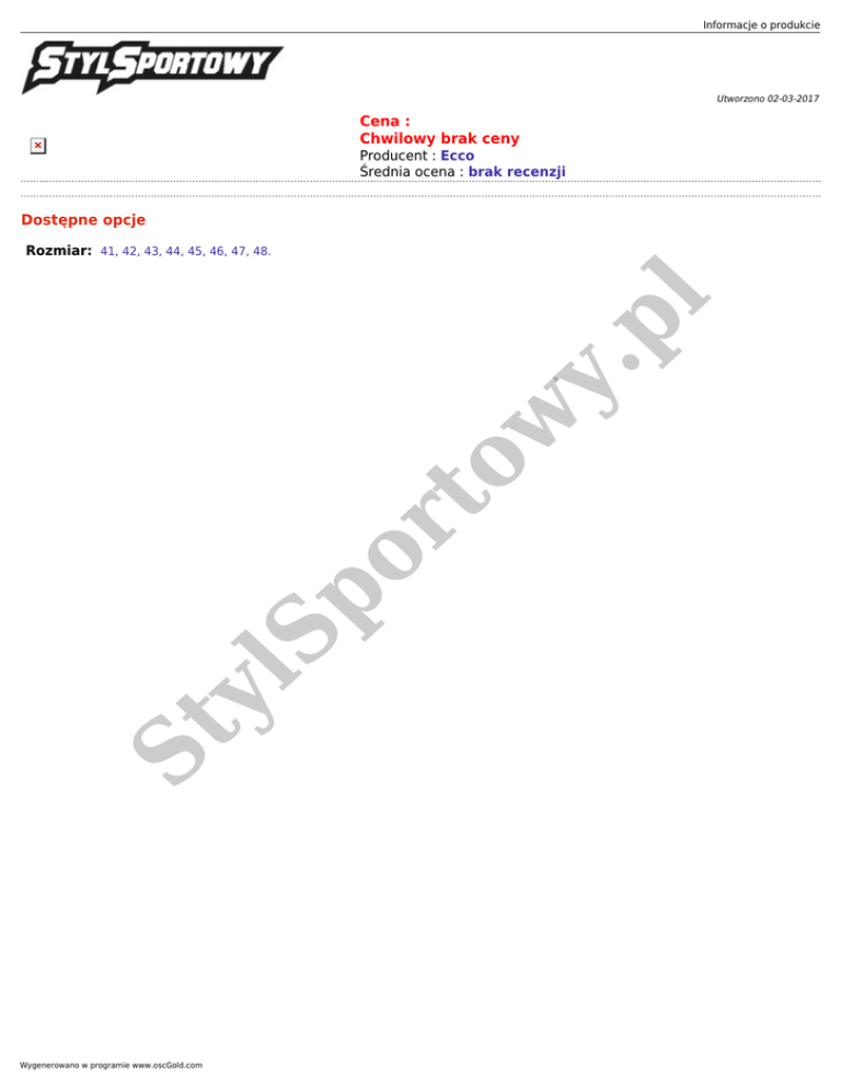 Informacje o produkcie Utworzono 02-03-2017 Cena : Chwilowy brak ceny Producent : Ecco Średnia ocena : brak recenzji Dostępne opcje St y lS p or to w y. pl Rozmiar: 41, 42, 43, 44, 45, 46, 47, 48. Wygenerowano w programie www.oscGold.com