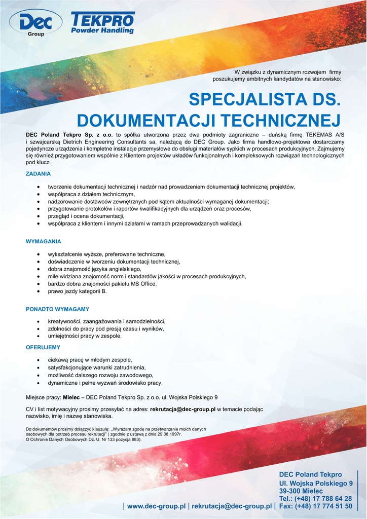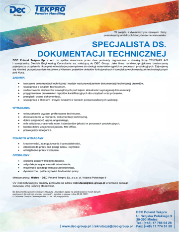W związku z dynamicznym rozwojem firmy poszukujemy ambitnych kandydatów na stanowisko: SPECJALISTA DS. DOKUMENTACJI TECHNICZNEJ DEC Poland Tekpro Sp. z o.o. to spółka utworzona przez dwa podmioty zagraniczne – duńską firmę TEKEMAS A/S i szwajcarską Dietrich Engineering Consultants sa, należącą do DEC Group. Jako firma handlowo-projektowa dostarczamy pojedyncze urządzenia i kompletne instalacje przemysłowe do obsługi materiałów sypkich w procesach produkcyjnych. Zajmujemy się również przygotowaniem wspólnie z Klientem projektów układów funkcjonalnych i kompleksowych rozwiązań technologicznych pod klucz. ZADANIA tworzenie dokumentacji technicznej i nadzór nad prowadzeniem dokumentacji technicznej projektów, współpraca z działem technicznym, nadzorowanie dostawców zewnętrznych pod kątem aktualności wymaganej dokumentacji; przygotowanie protokołów i raportów kwalifikacyjnych dla urządzeń oraz procesów, przegląd i ocena dokumentacji, współpraca z klientem i innymi działami w ramach przeprowadzanych walidacji. WYMAGANIA wykształcenie wyższe, preferowane techniczne, doświadczenie w tworzeniu dokumentacji technicznej, dobra znajomość języka angielskiego, mile widziana znajomość norm i standardów jakości w procesach produkcyjnych, bardzo dobra znajomości pakietu MS Office. prawo jazdy kategorii B. PONADTO WYMAGAMY kreatywności, zaangażowania i samodzielności, zdolności do pracy pod presją czasu i wyników, umiejętności pracy w zespole. OFERUJEMY ciekawą pracę w młodym zespole, satysfakcjonujące warunki zatrudnienia, możliwość dalszego rozwoju zawodowego, dynamiczne i pełne wyzwań środowisko pracy. Miejsce pracy: Mielec – DEC Poland Tekpro Sp. z o.o. ul. Wojska Polskiego 9 CV i list motywacyjny prosimy przesyłać na adres: [email protected] w temacie podając nazwisko, imię i nazwę stanowiska. Do dokumentów prosimy dołączyć klauzulę: ,,Wyrażam zgodę na przetwarzanie moich danych osobowych dla potrzeb procesu rekrutacji” ( zgodnie z ustawą z dnia 29.08.1997r. O Ochronie Danych Osobowych Dz. U. Nr 133 pozycja 883).
