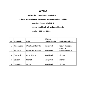 WYKAZ członków Obwodowej Komisji Nr 1 Wybory uzupełniające do Senatu Rzeczypospolitej Polskiej siedziba: Zespół Szkół Nr 1 adres: Sulejówek ul. Idzikowskiego 2a telefon: 022 783 35 58 Lp. Nazwisko Imię Miejsce zamieszkania Pełniona funkcja 1 Przewuska Wiesława Henryka Sulejówek 2 Kaczorek Agnieszka Bożena Sulejówek Przewodnicząca Zastępca przewodniczącej 3 Sakowski Artur Adam Sulejówek Członek 4 Szalach Michał Sulejówek Członek 5 Stefaniuk Iwona Sulejówek Członek WYKAZ członków Obwodowej Komisji Nr 2 Wybory uzupełniające do Senatu Rzeczypospolitej Polskiej siedziba: Zespół Szkół Nr 1 adres: Sulejówek ul. Idzikowskiego 2a telefon: 022 783 35 58 Lp. Nazwisko Imię Miejsce zamieszkania Pełniona funkcja Przewodnicząca 1 Zaperta Joanna Dorota Sulejówek 2 Jakubczak Danuta Sulejówek Zastępca przewodniczącej 3 Lubecka Małgorzata Sulejówek Członek 4 Małkiewicz Tomasz Robert Sulejówek Członek 5 Stefaniuk Dariusz Jan Sulejówek Członek WYKAZ członków Obwodowej Komisji Nr 3 Wybory uzupełniające do Senatu Rzeczypospolitej Polskiej siedziba: Zespół Szkół Nr 2 adres: Sulejówek ul. Okuniewska 2 telefon: 022 783 11 97 Lp. Nazwisko Pełniona funkcja Imię Miejsce zamieszkania 1 Zalewski Jacek Janusz Sulejówek 2 Cielecka Zofia Sulejówek Przewodniczący Zastępca przewodniczącego 3 Nowacka Pelagia Barbara Sulejówek Członek 4 Szatański Jerzy Bogdan Sulejówek Członek 5 Wysocka Halina Sabina Sulejówek Członek WYKAZ członków Obwodowej Komisji Nr 4 Wybory uzupełniające do Senatu Rzeczypospolitej Polskiej siedziba: Szkoła Podstawowa Nr 3 adres: Sulejówek ul. Głowackiego 47 telefon: 022 783 50 19 Lp. Nazwisko Imię Miejsce zamieszkania Pełniona funkcja 1 Goźliński Artur Jarosław Sulejówek 2 Sakowicz Kacper Krzysztof Sulejówek Przewodniczący Zastępca przewodniczącego 3 Kołodko Janusz Zbigniew Sulejówek Członek 4 Makowski Cezary Mirosław Sulejówek Członek 5 Morawska Hanna Sulejówek Członek WYKAZ członków Obwodowej Komisji Nr 5 Wybory uzupełniające do Senatu Rzeczypospolitej Polskiej siedziba: Szkoła Podstawowa Nr 3 adres: Sulejówek ul. Głowackiego 47 telefon: 022 783 50 19 Lp. Nazwisko Imię Miejsce zamieszkania Pełniona funkcja 1 Gruzińska Grażyna Irena Sulejówek 2 Garbuliński Adam Grzegorz Sulejówek Przewodnicząca Zastępca przewodniczącej 3 Czeredys Sławomir Sulejówek Członek 4 Morawska Małgorzata Sulejówek Członek 5 Raczkowski Michał Piotr Sulejówek Członek WYKAZ członków Obwodowej Komisji Nr 6 Wybory uzupełniające do Senatu Rzeczypospolitej Polskiej siedziba: Gimnazjum Nr 2 adres: Sulejówek ul. Narutowicza 10 telefon: 022 783 50 57 Lp. Nazwisko Imię Miejsce zamieszkania Pełniona funkcja 1 Zyskowska Joanna Maria Sulejówek 2 Pawłowska Mirosława Małgorzata Sulejówek Przewodnicząca Zastępca przewodniczącej 3 Górska Magdalena Sulejówek Członek 4 Krawczyk Julia Teresa Sulejówek Członek 5 Stefaniak Tomasz Paweł Sulejówek Członek WYKAZ członków Obwodowej Komisji Nr 7 Wybory uzupełniające do Senatu Rzeczypospolitej Polskiej siedziba: Gimnazjum Nr 2 adres: Sulejówek ul. Narutowicza 10 telefon: 022 783 50 57 Nazwisko Imię Miejsce zamieszkania 1 Malinowska Renata Aneta Sulejówek 2 Lesińska Jolanta Sulejówek Przewodnicząca Zastępca przewodniczącej 3 Bujakowska Izabela Joanna Sulejówek Członek 4 Galińska Renata Małgorzata Sulejówek Członek 5 Szynkiewicz Izabella Sulejówek Członek Lp. Pełniona Funkcja WYKAZ członków Obwodowej Komisji Nr 8 Wybory uzupełniające do Senatu Rzeczypospolitej Polskiej siedziba: Zespół Szkół Ponadgimnazjalnych adres: Sulejówek ul. Paderewskiego 29 telefon: 022 783 10 09 Nazwisko Imię Miejsce zamieszkania 1 Karczewska Marta Sulejówek 2 Pazio Grażyna Sulejówek Przewodnicząca Zastępca przewodniczącej 3 Laskowski Dariusz Sulejówek Członek 4 Wąsowska Marlena Sulejówek Członek 6 Welter Elżbieta Maria Sulejówek Członek Lp. Pełniona funkcja WYKAZ członków Obwodowej Komisji Nr 9 Wybory uzupełniające do Senatu Rzeczypospolitej Polskiej siedziba: Zespół Szkół Ponadgimnazjalnych adres: Sulejówek ul. Paderewskiego 29 telefon: 022 783 10 09 Lp. 1 Nazwisko Imię Miejsce zamieszkania Kikolski Kamil Konrad Sulejówek Pełniona funkcja Przewodniczący 2 Zaboklicka Barbara Sulejówek Zastępca przewodniczącego 3 Chciński Marcin Sulejówek Członek 4 Janiak Kamil Sulejówek Członek 5 Siwińska Elżbieta Sulejówek Członek