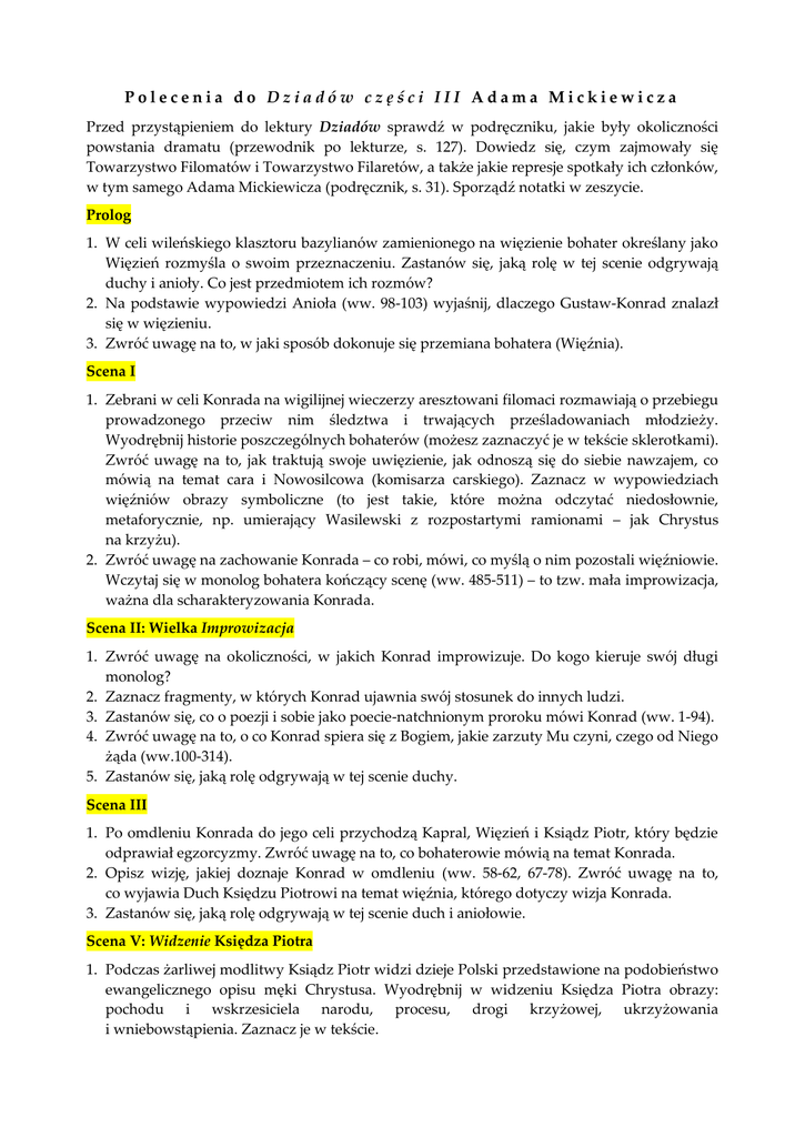 Polecenia do Dziadów części III Adama Mickiewicza Przed przystąpieniem do lektury Dziadów sprawdź w podręczniku, jakie były okoliczności powstania dramatu (przewodnik po lekturze, s. 127). Dowiedz się, czym zajmowały się Towarzystwo Filomatów i Towarzystwo Filaretów, a także jakie represje spotkały ich członków, w tym samego Adama Mickiewicza (podręcznik, s. 31). Sporządź notatki w zeszycie. Prolog 1. W celi wileńskiego klasztoru bazylianów zamienionego na więzienie bohater określany jako Więzień rozmyśla o swoim przeznaczeniu. Zastanów się, jaką rolę w tej scenie odgrywają duchy i anioły. Co jest przedmiotem ich rozmów? 2. Na podstawie wypowiedzi Anioła (ww. 98-103) wyjaśnij, dlaczego Gustaw-Konrad znalazł się w więzieniu. 3. Zwróć uwagę na to, w jaki sposób dokonuje się przemiana bohatera (Więźnia). Scena I 1. Zebrani w celi Konrada na wigilijnej wieczerzy aresztowani filomaci rozmawiają o przebiegu prowadzonego przeciw nim śledztwa i trwających prześladowaniach młodzieży. Wyodrębnij historie poszczególnych bohaterów (możesz zaznaczyć je w tekście sklerotkami). Zwróć uwagę na to, jak traktują swoje uwięzienie, jak odnoszą się do siebie nawzajem, co mówią na temat cara i Nowosilcowa (komisarza carskiego). Zaznacz w wypowiedziach więźniów obrazy symboliczne (to jest takie, które można odczytać niedosłownie, metaforycznie, np. umierający Wasilewski z rozpostartymi ramionami – jak Chrystus na krzyżu). 2. Zwróć uwagę na zachowanie Konrada – co robi, mówi, co myślą o nim pozostali więźniowie. Wczytaj się w monolog bohatera kończący scenę (ww. 485-511) – to tzw. mała improwizacja, ważna dla scharakteryzowania Konrada. Scena II: Wielka Improwizacja 1. Zwróć uwagę na okoliczności, w jakich Konrad improwizuje. Do kogo kieruje swój długi monolog? 2. Zaznacz fragmenty, w których Konrad ujawnia swój stosunek do innych ludzi. 3. Zastanów się, co o poezji i sobie jako poecie-natchnionym proroku mówi Konrad (ww. 1-94). 4. Zwróć uwagę na to, o co Konrad spiera się z Bogiem, jakie zarzuty Mu czyni, czego od Niego żąda (ww.100-314). 5. Zastanów się, jaką rolę odgrywają w tej scenie duchy. Scena III 1. Po omdleniu Konrada do jego celi przychodzą Kapral, Więzień i Ksiądz Piotr, który będzie odprawiał egzorcyzmy. Zwróć uwagę na to, co bohaterowie mówią na temat Konrada. 2. Opisz wizję, jakiej doznaje Konrad w omdleniu (ww. 58-62, 67-78). Zwróć uwagę na to, co wyjawia Duch Księdzu Piotrowi na temat więźnia, którego dotyczy wizja Konrada. 3. Zastanów się, jaką rolę odgrywają w tej scenie duch i aniołowie. Scena V: Widzenie Księdza Piotra 1. Podczas żarliwej modlitwy Ksiądz Piotr widzi dzieje Polski przedstawione na podobieństwo ewangelicznego opisu męki Chrystusa. Wyodrębnij w widzeniu Księdza Piotra obrazy: pochodu i wskrzesiciela narodu, procesu, drogi krzyżowej, ukrzyżowania i wniebowstąpienia. Zaznacz je w tekście. Scena VI 1. Zastanów się, jaką rolę odgrywają w tej scenie diabły. 2. Pijany Nowosilcow (Senator) śni koszmary – wyodrębnij obrazy senne i zastanów się, czego boi się Senator. Scena VII: Salon warszawski 1. Zwróć uwagę na to, kto należy do „towarzystwa przy drzwiach”, a kto do „towarzystwa stolikowego”. 2. Zaznacz na marginesie tekstu problematykę rozmów toczonych w warszawskim salonie. Zastanów się, czy oba towarzystwa podobnie komentują zdarzenia, mają jedno zdanie na te same tematy? 3. Streść historię Cichowskiego, o której opowiada Adolf. 4. Zastanów się nad wymową słów Wysockiego w finale sceny. Scena VIII: Pan Senator 1. Zwróć uwagę na to, jakie metody zastraszania narodu polskiego stosuje Senator (Nowosilcow). 2. Wyjaśnij, w jaki sposób Senator załatwił sprawę Rollisona. Kto był jego doradcą w tej sprawie? 3. Zbierz argumentację do stworzenia portretu Senatora – zwróć uwagę zarówno na zachowanie i działania Senatora, jak i wypowiedzi gości na balu. 4. Opisz wydarzenia, które zakłócają przebieg balu u Senatora. 5. Scenę kończy przypadkowe spotkanie Konrada i Księdza Piotra. Jaką przyszłość zapowiada Ksiądz Piotr Konradowi? Scena IX: Noc dziadów 1. Akcja przenosi się w cmentarną scenerię II części Dziadów (znasz tę lekturę z gimnazjum). Rozpoznaj w przywoływanych duchach bohaterów Dziadów części III. 2. Zastanów się, czyjego ducha pragnie zobaczyć Kobieta. Co mówi o nim Guślarz? UWAGA: Jeżeli nie zrozumiesz niektórych fragmentów dramatu, sprawdź przypisy wydawcy i objaśnienia [poety] dołączone do utworu.