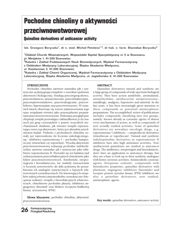 Pochodne chinoliny o aktywnoci przeciwnowotworowej Nr 6/2007 Quinoline derivatives of anticancer activity lek. Grzegorz Boryczka1, dr n. med. Micha³ Petelenz1,2, dr hab. n. farm. Stanis³aw Boryczka3 1 Oddzia³ Chorób Wewnêtrznych, Wojewódzki Szpital Specjalistyczny nr 5 w Sosnowcu, pl. Medyków 1, 41-200 Sosnowiec 2 Katedra i Zak³ad Podstawowych Nauk Biomedycznych, Wydzia³ Farmaceutyczny z Oddzia³em Medycyny Laboratoryjnej, l¹ska Akademia Medyczna, ul. Kasztanowa 3, 41-200 Sosnowiec 3 Katedra i Zak³ad Chemii Organicznej, Wydzia³ Farmaceutyczny z Oddzia³em Medycyny Laboratoryjnej, l¹ska Akademia Medyczna, ul. Jagielloñska 4, 41-200 Sosnowiec STRESZCZENIE Pochodne chinoliny zarówno naturalne jak i syntetyczne są dużą grupą związków o szerokim spektrum aktywności biologicznej. Działają przeciwgorączkowo, przeciwzimniczo, antyarytmicznie, przeciwbakteryjnie, przeciwpierwotniakowo, przeciwalergicznie, przeciwbólowo, hipotensyjnie oraz przeciwwirusowo. W ostatnich latach obserwuje się wzrost zainteresowania tego typu związkami również jako potencjalnymi preparatami przeciwnowotworowymi. Dokonany przegląd prac obejmuje związki pozwalające zaklasyfikować je do znanych już grup cytostatyków o prawie wszystkich mechanizmach działania, jak również związki reprezentujące nowy typ aktywności, który jest aktualnie przedmiotem badań. Niektóre z pochodnych chinoliny zostały już wprowadzone do leczenia onkologicznego, np.: inhibitory topoizomerazy I – pochodne kamptotecyny (irinotekan czy topotekan). Wysoką aktywność przeciwnowotworową wykazują pochodne indolochinoliny zarówno naturalne jak i syntetyczne jako inhibitory topoizomerazy II. Prowadzi się też badania nad wykorzystaniem przeciwbakteryjnych chinolonów jako leków przeciwnowotworowych. Antybiotyki, streptonygryna i lavendamycyna, nie znalazły zastosowania w leczeniu nowotworów, ale dały podstawę do poszukiwania ich analogów syntetycznych o lepszych właściwościach cytotoksycznych. Do interesujących związków należą również antymetabolity cytotoksyczne (brequinar sodium), związki o bioredukcyjnych właściwościach, chinolinowe pochodne platyny, inhibitory angiogenezy (linomid) oraz blokery receptora białkowej kinazy tyrozynowej (PTK). Słowa kluczowe: pochodne chinoliny, aktywność przeciwnowotworowa $ Farmaceutyczny Przegl¹d Naukowy AB STRA CT ABSTRA STRACT Quinoline derivatives natural and synthetic are a large group of compounds of wide spectrum biological activity. They have action antifebrile, antimalarial, antiarrhythmic, antibacterial, antiprotozoonic, antiallergic, analgesic, hypotesive and antiviral. In the last years, it has been increasingly given attention to these compounds as potential antineoplastic preparations. The accomplished review of publications includes compounds classifying into two groups, namely: known already as cytostatic agents of almost every mechanisms of action, as well as compounds of new actually studied activities. Some of quinoline derivatives are nowadays oncologic drugs, e.g. topoisomerase I inhibitors – camptothecin derivatives (irinothecan or topothecan). Natural and synthetic indoloquinoline derivatives as topoisomerase II inhibitors have also high antitumor activities. Now antibacterial quinolones are studied as anticancer drugs. The antibiotics, streptonigrin and lavendamicin, don’t have an application to anticancer therapy, but they are a base to look up to their synthetic analogues with better cytotoxic activities. Antimetabolic cytotoxic agents (brequinar sodium), compounds with bioreductive properties, quinoline derivatives with platinum, angiogenic inhibitors (linomide) and receptor protein tyrosine kinase (PTK) inhibitors are also a quinoline derivatives, new studied, antineoplastic agents. Key words: quinoline derivatives, anticancer activity Nr 6/2007 Chinoliny zarówno pochodzenia naturalnego jak i syntetyczne stanowią dużą grupę związków, wśród których wiele wykazuje interesujące działanie biologiczne. Najstarszą pochodną chinoliny i przez wiele lat jedynym lekiem przeciwzimniczym była chinina, naturalny alkaloid wyodrębniony w roku 1820 z kory drzewa chinowego. Pierwszy, zachowany zapis dotyczący skutecznego leczenia chorej na zimnicę - żony hiszpańskiego wicekróla Peru - hrabiny Anny del Chinchon (stąd nazwa chinina na pamiątkę sławnej chorej) korą drzewa chinowego pochodzi z 1619 roku [1]. W kilka lat później misjonarze przywieźli sproszkowaną korę do Europy (nazwaną „korą Jezuitów”) i tutaj medykament ten stał się wkrótce najbardziej pożądanym środkiem przeciwko gorączce. Również obecnie syntetyczne pochodne 4-aminochinoliny (chlorochinolina, amodiachina, metylochlorochina), 8-aminochinoliny (primachina, pamachina, pentachina) oraz 4-chinolinometanolu (meflochina) są grupą leków najczęściej stosowanych w leczeniu malarii. Chinidyna, prawoskrętny izomer chininy, który jest nieomal całkowicie pozbawiony właściwości przeciwzimniczych, stosowana jest w leczeniu niemiarowości serca. Do związków o aktywności przeciwbakteryjnej i przeciwpierwotniakowej zalicza się też pochodne 8-hydroksychinoliny [2]. Najciekawszą zaś grupą leków przeciwbakteryjnych stały się fluorochinolony, w pełni syntetyczne pochodne 4-chinolonów [3]. Opisano także wiele innych chinolin wykazujących działanie przeciwalergiczne [4, 5], przeciwbólowe [6], hipotensyjne [7, 8], przeciwwirusowe [9, 10] i przeciwzimnicze [11]. W ostatnich latach obserwuje się zwiększone stosowanie chemioterapeutyków oraz wzrost zainteresowania nowymi pochodnymi chinoliny również jako potencjalnych preparatów przeciwnowotworowych. Poniżej przedstawiono przegląd prac dotyczących wykorzystywania w onkologii obecnie znanych jak i badanych, nowych chinolin o działaniu cytotoksycznym. Pochodne chinoliny o aktywnoci przeciwnowotworowej 1. Inhibitor Inhibitoryy topoizomerazy topoizomerazy.. Topo
