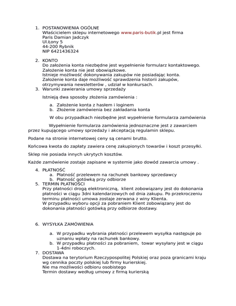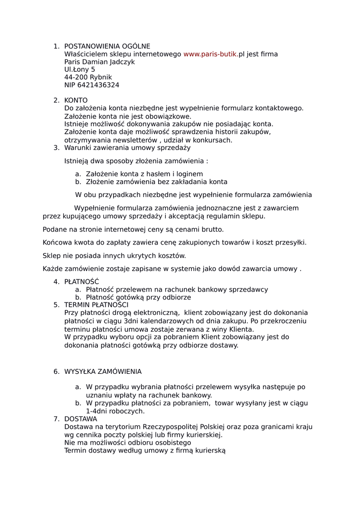 1. POSTANOWIENIA OGÓLNE Właścicielem sklepu internetowego www.paris-butik.pl jest firma Paris Damian Jadczyk Ul.Łony 5 44-200 Rybnik NIP 6421436324 2. KONTO Do założenia konta niezbędne jest wypełnienie formularz kontaktowego. Założenie konta nie jest obowiązkowe. Istnieje możliwość dokonywania zakupów nie posiadając konta. Założenie konta daje możliwość sprawdzenia historii zakupów, otrzymywania newsletterów , udział w konkursach. 3. Warunki zawierania umowy sprzedaży Istnieją dwa sposoby złożenia zamówienia : a. Założenie konta z hasłem i loginem b. Złożenie zamówienia bez zakładania konta W obu przypadkach niezbędne jest wypełnienie formularza zamówienia Wypełnienie formularza zamówienia jednoznaczne jest z zawarciem przez kupującego umowy sprzedaży i akceptacją regulamin sklepu. Podane na stronie internetowej ceny są cenami brutto. Końcowa kwota do zapłaty zawiera cenę zakupionych towarów i koszt przesyłki. Sklep nie posiada innych ukrytych kosztów. Każde zamówienie zostaje zapisane w systemie jako dowód zawarcia umowy . 4. PŁATNOŚĆ a. Płatność przelewem na rachunek bankowy sprzedawcy b. Płatność gotówką przy odbiorze 5. TERMIN PŁATNOŚCI Przy płatności drogą elektroniczną, klient zobowiązany jest do dokonania płatności w ciągu 3dni kalendarzowych od dnia zakupu. Po przekroczeniu terminu płatności umowa zostaje zerwana z winy Klienta. W przypadku wyboru opcji za pobraniem Klient zobowiązany jest do dokonania płatności gotówką przy odbiorze dostawy. 6. WYSYŁKA ZAMÓWIENIA a. W przypadku wybrania płatności przelewem wysyłka następuje po uznaniu wpłaty na rachunek bankowy. b. W przypadku płatności za pobraniem, towar wysyłany jest w ciągu 1-4dni roboczych. 7. DOSTAWA Dostawa na terytorium Rzeczypospolitej Polskiej oraz poza granicami kraju wg cennika poczty polskiej lub firmy kurierskiej. Nie ma możliwości odbioru osobistego Termin dostawy według umowy z firmą kurierską Klient ma obowiązek sprawdzenia przesyłki w obecności kuriera. W przypadku uszkodzenia przesyłki należy spisać protokół szkody i niezwłoczne powiadomienie o tym Sprzedawcy. 8. REKLAMACJE I ZWROTY Podstawą reklamacji lub zwrotu jest paragon. Reklamacje rozpatrywane są w ciągu 14dni od dnia otrzymania protokołu reklamacji . Podstawą wszczęcia procedury reklamacyjnej lub zwrotu jest prawidłowo wypełniony formularz oraz paragon. Klient ma prawo do odstąpienia od umowy w ciągu 14dni od zawarcia umowy. Oświadczenie o odstąpieniu od umowy należy wysłać drogą elektroniczną lub listem poleconym na adres firmy . Warunkiem zwrotu gotówki jest dostarczenie zwracanego towaru wraz z dowodem zakupu. . Towar zwracany nie może nosić śladów użytkowania. Musi posiadać komplet matek. 9. POSTANOWIENIA KOŃCOWE Sprzedawca zastrzega sobie prawo do dokonywania zmian regulaminu. W sprawach nie uregulowanych regulaminem mają zastosowanie powszechnie obowiązujące przepisy prawa polskiego.