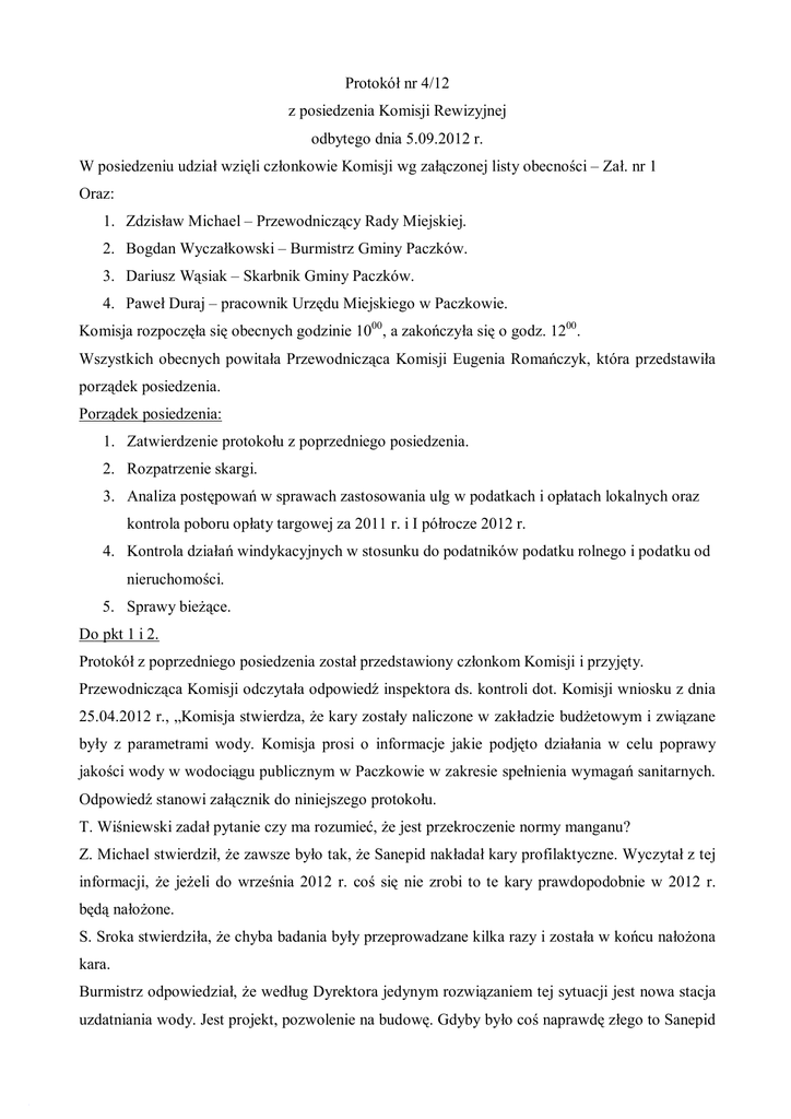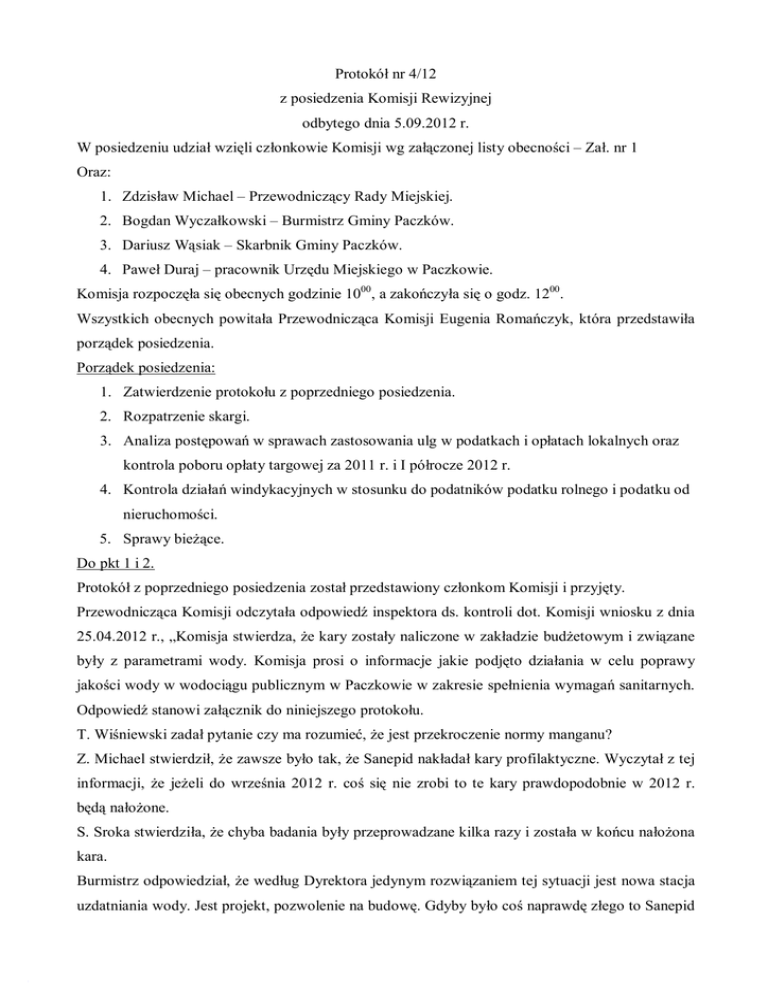 Protokół nr 4/12 z posiedzenia Komisji Rewizyjnej odbytego dnia 5.09.2012 r. W posiedzeniu udział wzięli członkowie Komisji wg załączonej listy obecności – Zał. nr 1 Oraz: 1. Zdzisław Michael – Przewodniczący Rady Miejskiej. 2. Bogdan Wyczałkowski – Burmistrz Gminy Paczków. 3. Dariusz Wąsiak – Skarbnik Gminy Paczków. 4. Paweł Duraj – pracownik Urzędu Miejskiego w Paczkowie. Komisja rozpoczęła się obecnych godzinie 1000, a zakończyła się o godz. 1200. Wszystkich obecnych powitała Przewodnicząca Komisji Eugenia Romańczyk, która przedstawiła porządek posiedzenia. Porządek posiedzenia: 1. Zatwierdzenie protokołu z poprzedniego posiedzenia. 2. Rozpatrzenie skargi. 3. Analiza postępowań w sprawach zastosowania ulg w podatkach i opłatach lokalnych oraz kontrola poboru opłaty targowej za 2011 r. i I półrocze 2012 r. 4. Kontrola działań windykacyjnych w stosunku do podatników podatku rolnego i podatku od nieruchomości. 5. Sprawy bieżące. Do pkt 1 i 2. Protokół z poprzedniego posiedzenia został przedstawiony członkom Komisji i przyjęty. Przewodnicząca Komisji odczytała odpowiedź inspektora ds. kontroli dot. Komisji wniosku z dnia 25.04.2012 r., „Komisja stwierdza, że kary zostały naliczone w zakładzie budżetowym i związane były z parametrami wody. Komisja prosi o informacje jakie podjęto działania w celu poprawy jakości wody w wodociągu publicznym w Paczkowie w zakresie spełnienia wymagań sanitarnych. Odpowiedź stanowi załącznik do niniejszego protokołu. T. Wiśniewski zadał pytanie czy ma rozumieć, że jest przekroczenie normy manganu? Z. Michael stwierdził, że zawsze było tak, że Sanepid nakładał kary profilaktyczne. Wyczytał z tej informacji, że jeżeli do września 2012 r. coś się nie zrobi to te kary prawdopodobnie w 2012 r. będą nałożone. S. Sroka stwierdziła, że chyba badania były przeprowadzane kilka razy i została w końcu nałożona kara. Burmistrz odpowiedział, że według Dyrektora jedynym rozwiązaniem tej sytuacji jest nowa stacja uzdatniania wody. Jest projekt, pozwolenie na budowę. Gdyby było coś naprawdę złego to Sanepid zamknąłby wodociągi. Projekt po to był robiony, żeby ten SUW zrobić. Próbowano wymienić złoże w filtrach, ale okazało się, że tego złoża nie można wymienić bez wyciągania filtrów na zewnątrz, a tego nie można zrobić bo trzeba by było rozbijać ścianę. Może gdy znajdzie się partnera po stronie czeskiej to będzie można pozyskiwać środki na SUW. Obecnie poszukują takiego partnera. Z. Michael zadał pytanie czy dokumentacja jest opracowana? Burmistrz odpowiedział, że tak. Przewodnicząca Komisji odczytała treść skargi na Burmistrza Gminy Paczków. Burmistrz przedstawił swoje stanowisko w sprawie złożonej skargi. Komisja w wyniku glosowania stwierdziła, że skarga jest bezzasadna. Następnie zostało sformułowane uzasadnienie do uchwały rozpatrującej skargę na Burmistrza Gminy Paczków. Przewodnicząca Komisji odczytała uzasadnienie w treści: „W dniu 18 czerwca 2012 r. do Urzędu Miejskiego w Paczkowie wpłynęła skarga na Burmistrza Gminy Paczków. Po rozpatrzeniu zarzutów zawartych w skardze, po wysłuchaniu wyjaśnień Burmistrza Gminy Paczków Komisja Rewizyjna dokonała oceny merytorycznej zarzutów podniesionych w skardze i stwierdziła, iż brak jest podstaw do uznania skargi za uzasadnioną. Na przedmiotowe mieszkanie zostały złożone dwa wnioski o zamianę. Przy czym skarżący złożył wniosek jako drugi. Potrzeby mieszkaniowe w Gminie Paczków są bardzo duże. Na liście osób oczekujących na najem mieszkania w momencie składania wniosku przez skarżącego były 53 rodziny. Dlatego postanowiono wolne mieszkanie po zmarłej osobie przyznać osobie będącej od 2007 r. na liście osób oczekujących na najem mieszkanie. Nadmienia się, że skarżący może zamienić mieszkanie z innym najemcą mieszkania komunalnego, jeżeli taka osoba wyrazi na to zgodę. W tym celu została sporządzona lista chętnych na zamianę mieszkania, która publikowana jest na oficjalnej stronie Urzędu Miejskiego w Paczkowie, gdzie skarżący został umieszczony. Biorąc powyższe pod uwagę. Po rozpatrzeniu sprawy w przedmiocie skargi, Rada Miejska w Paczkowie postanowiła podjąć uchwałę o uznaniu skargi za bezzasadną.” Do pkt 3. Przewodnicząca Komisji poprosiła o przedstawienie informacji na temat postępowań w sprawach zastosowania ulg w podatkach i opłatach lokalnych w 2011 r. i w I półroczu 2012 r. Burmistrz poinformował, że jeżeli chodzi o zwolnienia wynikające z uchwały to w 2011 r. było ich na kwotę 544.320 zł. w 2012 r. 437.590 zł. Zwolnienia przysługują szkołom, przedszkolom, ZWiK-owi, kościołom. Podmioty, którym przysługują zwolnienia są wymienione w uchwale. Część podatku dla ZWiK została umorzona, żeby nie było zbyt wysokiej stawki za wodę. P. Duraj poinformował, że jest też uchwała o pomocy przedsiębiorcom tworzącym nowe stanowiska pracy była tutaj kwota około 2.000 zł. Burmistrz poinformował, że informacje o umorzeniach do końca br. są tajemnicą skarbową. W przyszłym roku dane dot. obecnego roku nie będą już stanowiły tajemnicy. W 2011 r. wydano 88 decyzji z czego 73 pozytywne i 15 odmownych. Łączna ilość umorzeń była na kwotę 101.000 zł. W 2012 r. wydano 51 decyzji z tego 50 pozytywnych 1 odmowną i kwota 304.055 zł. Rolnicy pisali o umorzenia ze względu na wymarznięcie upraw. Dwa podmioty przez to, że ustalono wyższą stawkę podatku od środków transportowych chciało przenieść działalności do Otmuchowa. Po rozmowie umorzono taką kwotę, żeby ta stawka, którą by zapłacili w Otmuchowie była taka sama w Paczkowie. P. Duraj poinformował, że jeżeli chodzi o podatek od środków transportowych to przedsiębiorcy zmieniają miejsca zamieszkania tam gdzie stawki są najniższe. Z reguły stawki podatku w Gminie Paczków są niż