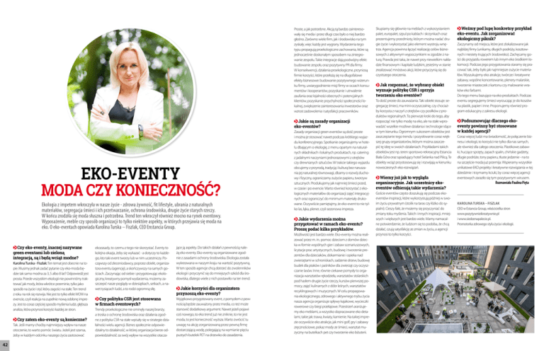 Proste, a jak potrzebne. Akcją tą bardzo zainteresowały się media i przez długi czas było o niej bardzo głośno. Zarówno wiele firm, jak i środowisko na tym zyskały, więc każdy jest wygrany. Wydarzenia tego typu propagują proekologiczne zachowania, które są jednocześnie doskonałym sposobem na zintegrowanie zespołu. Takie integracje dają podwójny efekt: budowanie zespołu oraz pozytywny PR dla firmy. W konsekwencji, działania proekologiczne, przyniosą firmie korzyści, które przełożą się na długofalowe efekty biznesowe: budowanie pozytywnego wizerunku firmy, uwiarygodnienie misji firmy w oczach konsumentów i kooperantów, pozyskanie i utrwalenie zaufania oraz lojalności obecnych i potencjalnych klientów, pozyskanie przychylności społeczności lokalnej, zwiększenie zainteresowania inwestorów oraz wzrost zadowolenia i satysfakcji pracowników. oJakie są zasady organizacji eko-eventów? Eko-eventy moda czy konieczność? Ekologia z impetem wkroczyła w nasze życie - zdrowa żywność, fit lifestyle, ubrania z naturalnych materiałów, segregacja śmieci i ich przetwarzanie, ochrona środowiska, drugie życie starych rzeczy. W końcu zrodziła się moda słuszna i potrzebna. Trend ten wkroczył również mocno na rynek eventowy. Wyposażenie, meble czy sposób organizacji to tylko niektóre aspekty, w których przejawia się moda na eko. O eko-eventach opowiada Karolina Turska – Fiszlak, CEO Enstancia Group. oCzy eko-eventy, inaczej nazywane green eventami lub zieloną integracją, są i będą wciąż modne? Karolina Turska - Fiszlak: Ten temat jest obecnie na topie. Musimy jednak zadać pytanie czy eko-moda będzie tak samo modna za 3, 5 albo 8 lat? Odpowiedź jest prosta. Przede wszystkim ekologii nie powinniśmy traktować jak mody, która wkrótce przeminie, tylko jako sposób na życie i styl, który zagości na stałe. Ten trend z roku na rok się rozwija. Nie jest to tylko efekt WOW na evencie, czyli reakcja na zupełnie nową odsłonę imprezy. Jest to coraz częściej sposób myślenia ludzi, głębsza analiza, która przynosi korzyści każdej ze stron. oCzy zatem eko-eventy są konieczne? Tak. Jeśli mamy choćby najmniejszy wpływ na nasze otoczenie, to warto pomóc światu. Jeżeli jest szansa, żeby w każdym odcinku naszego życia zastosować 42 ekozasady, to czemu z tego nie skorzystać. Eventy to kolejna okazja, żeby się wykazać - a dotyczy to każdego, kto taki event tworzy lub w nim uczestniczy. Począwszy od zleceniodawcy, poprzez obiekt, organizatora eventu (agencję), a skończywszy na samych gościach. Zaczynając od siebie i przygotowując ekologiczny, kreatywny pomysł wydarzenia, możemy zaszczepić nasze poglądy w dziesiątkach, setkach, a nawet tysiącach ludzi, a to rodzi ogromną siłę. jące ją aspekty. Do takich działań z pewnością należą eko-eventy. Eko-eventy są organizowane zgodnie z zasadami ochrony środowiska. Ekologia została wykreowana w naszym kraju na wartość pozytywną. W ten sposób agencje chcą dotrzeć do zwolenników ekologii i przyczynić się do mniejszych szkód dla środowiska, dlatego wiele z nich postawiło na ten trend. oCzy polityka CSR jest stosowana Wyjątkowo przygotowany event, z pomysłem z pewnością będzie zauważony przez media, co też może stanowić dodatkowy argument. Nawet jeżeli pojawi coś nowego, to eko trend już nie zniknie, to nie jest moda, to jest konieczność wyższa. Warto zwrócić tu uwagę na akcję zorganizowaną przez pewną firmę dostarczającą wodę, polegającą na wymianie pięciu pustych butelek PET na drzewko do zasadzenia. w firmach eventowych? Trendy proekologiczne nie ominęły naszej branży, a troska o ochronę środowiska oraz działania zgodne z polityka CSR na stałe wpisały się w strategie działalności wielu agencji. Biznes społecznie odpowiedzialny to działalność, w której organizacja bierze odpowiedzialność za swój wpływ na wszystkie otacza- oJakie korzyści dla organizatora przynoszą eko-eventy? Zasady organizacji green eventów są dość proste i można je stosować nawet podczas krótkiego wyjazdu konferencyjnego. Spotkanie organizujemy w hotelu dbającym o ekologię, z menu opartym na naturalnych składnikach i lokalnych produktach, np. catering z jadalnymi naczyniami jednorazowymi z otrębów czy drewnianych sztućców. W trakcie takiego wyjazdu obcujemy z przyrodą, tradycją i kulturą bez naruszania jej naturalnej równowagi, dbamy o rozwój duchowy i fizyczny, ograniczamy zużycie papieru, tworzyw sztucznych. Produkujemy jak najmniej śmieci przed, w czasie i po evencie. Warto również korzystać z ekologicznych materiałów do organizacji zajęć integracyjnych oraz ograniczyć do minimum materiały drukowane. Oczywiście pamiętajmy, że eko-event to nie tylko las, łąka, plener, czyli sezonowa impreza. oJakie wydarzenia można przygotować w ramach eko-eventu? Proszę podać kilka przykładów. Możliwości jest bardzo wiele. Eko-eventy można realizować przez m. in.: pomoc dzieciom z domów dziecka w formie wspólnych gier i zabaw scenariuszowych, licytacje prac artystycznych, budowę i tworzenie prezentów dla dzieciaków, dokarmianie i opieka nad zwierzętami w schroniskach, sadzenie drzew, budowę budek dla ptaków i paśników dla zwierząt czy oczyszczanie lasów. Inne, równie ciekawe pomysły to organizacja warsztatów rękodzieła, warsztatów stolarskich pod hasłem drugie życie rzeczy, kursów pierwszej pomocy, zajęć kulinarnych z dóbr leśnych, warsztatów recyklingowych i muzycznych. W celu propagowania ekologicznego, zdrowego i aktywnego trybu życia nasza agencja organizuje spływy kajakowe, wycieczki rowerowe czy biegi przełajowe. Przestrzeń aranżujemy eko meblami, a wszystko dopracowane eko detalami, takie jak: trawa, kwiaty, kamienie. Na takiej imprezie oczywiście eko atrakcje, jak mini golf, gry i zabawy zręcznościowe, pokaz mody ze śmieci, warsztat muzyczny na butelkach pe