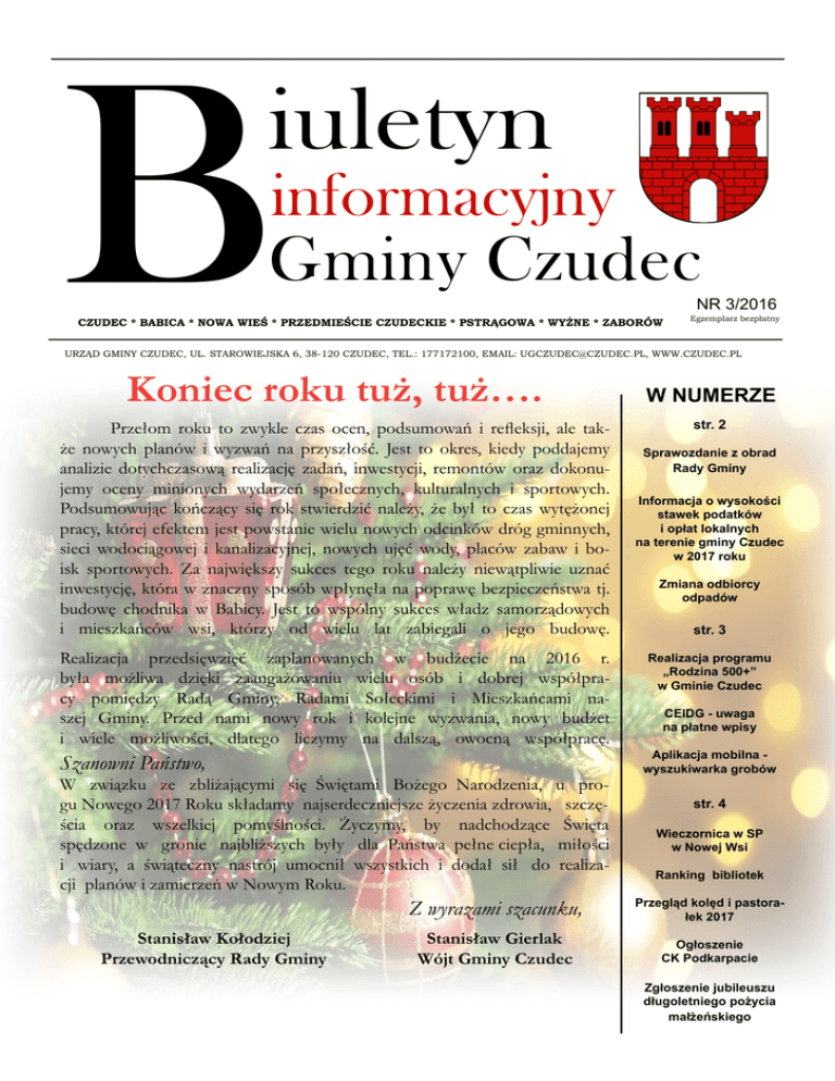 B iuletyn informacyjny Gminy Czudec NR 3/2016 CZUDEC * BABICA * NOWA WIEŚ * PRZEDMIEŚCIE CZUDECKIE * PSTRĄGOWA * WYŻNE * ZABORÓW Egzemplarz bezpłatny URZĄD GMINY CZUDEC, UL. STAROWIEJSKA 6, 38-120 CZUDEC, TEL.: 177172100, EMAIL: [email protected], WWW.CZUDEC.PL Koniec roku tuż, tuż…. Przełom roku to zwykle czas ocen, podsumowań i refleksji, ale także nowych planów i wyzwań na przyszłość. Jest to okres, kiedy poddajemy analizie dotychczasową realizację zadań, inwestycji, remontów oraz dokonujemy oceny minionych wydarzeń społecznych, kulturalnych i sportowych. Podsumowując kończący się rok stwierdzić należy, że był to czas wytężonej pracy, której efektem jest powstanie wielu nowych odcinków dróg gminnych, sieci wodociągowej i kanalizacyjnej, nowych ujęć wody, placów zabaw i boisk sportowych. Za największy sukces tego roku należy niewątpliwie uznać inwestycję, która w znaczny sposób wpłynęła na poprawę bezpieczeństwa tj. budowę chodnika w Babicy. Jest to wspólny sukces władz samorządowych i mieszkańców wsi, którzy od wielu lat zabiegali o jego budowę. Realizacja przedsięwzięć zaplanowanych w budżecie na 2016 r. była możliwa dzięki zaangażowaniu wielu osób i dobrej współpracy pomiędzy Radą Gminy, Radami Sołeckimi i Mieszkańcami naszej Gminy. Przed nami nowy rok i kolejne wyzwania, nowy budżet i wiele możliwości, dlatego liczymy na dalszą, owocną współpracę. Szanowni Państwo, W związku ze zbliżającymi się Świętami Bożego Narodzenia, u progu Nowego 2017 Roku składamy najserdeczniejsze życzenia zdrowia, szczęścia oraz wszelkiej pomyślności. Życzymy, by nadchodzące Święta spędzone w gronie najbliższych były dla Państwa pełne ciepła, miłości i wiary, a świąteczny nastrój umocnił wszystkich i dodał sił do realizacji planów i zamierzeń w Nowym Roku. Stanisław Kołodziej Przewodniczący Rady Gminy W NUMERZE str. 2 Sprawozdanie z obrad Rady Gminy Informacja o wysokości stawek podatków i opłat lokalnych na terenie gminy Czudec w 2017 roku Zmiana odbiorcy odpadów str. 3 Realizacja programu „Rodzina 500+” w Gminie Czudec CEIDG - uwaga na płatne wpisy Aplikacja mobilna wyszukiwarka grobów str. 4 Wieczornica w SP w Nowej Wsi Ranking bibliotek Z wyrazami szacunku, Przegląd kolęd i pastorałek 2017 Stanisław Gierlak Wójt Gminy Czudec Ogłoszenie CK Podkarpacie Zgłoszenie jubileuszu długoletniego pożycia małżeńskiego Sprawozdanie z obrad Rady Gminy W dniu 15 grudnia br. odbyła się XX zwyczajna Sesja Rady Gminy. Porządek obrad obejmował podjęcie szeregu ważnych uchwał, w tym głosowanie nad budżetem na rok 2017, wieloletnią prognozą finansową i planem pracy RG na rok następny. Sesja rozpoczęła się od sprawozdania z realizacji „Gminnego Programu Opieki nad Zabytkami na lata 2013-2016”. Następnie Przewodniczący poszczególnych komisji przedstawili sprawozdania z działalności i plany pracy na rok następny. Kolejnym punktem obrad było przyjęcie uchwał w następujących sprawach: - w sprawie uchwalenia planu pracy Rady Gminy na 2017 r., - w sprawie zatwierdzenia rocznego planu pracy Komisji Rewizyjnej, - w sprawie przyjęcia Gminnego Programu Profilaktyki i Rozwiązywania Problemów Alkoholowych na rok 2017, - w sprawie przyjęcia „założeń do planu zaopatrzenia w ciepło, energię elektryczną i paliwa gazowe dla Gminy Czudec na lata 2016-2026”, - w sprawie utworzenia oddziału przedszkolnego w Szkole Podstawowej im. Stanisława Konarskiego w Zaborowie, - 4 uchwały w sprawie wyrażenia zgody na nabycie działki w formie darowizny na własność gminy Czudec (3 uchwały dot. Pstrągowej i jedna Wyżnego) i 2 w sprawie wyrażenia zgody na zakup działek na własność gminy Czudec (Pstrągowa, Nowa Wieś), - w sprawie wyrażenia zgody na zawarcie porozumienia z Gminą Miastem Rzeszów (porozumienie z Izbą Wytrzeźwień w sprawie przyjmowania osób w stanie nietrzeźwości, dowiezionych z terenu Gminy), - w sprawie opłaty za zajęcie pasa drogowego, - w sprawie przekazania środków finansowych Komendzie Powiatowej Policji w Strzyżowie (dofinansowanie zakupu samochodów), - w sprawie udzielenia pomocy finansowej (pomoc dla powiatu na wykonanie chodnika przy drodze powiatowej nr 1815 R Pstrągowa- Nowa Wieś), - w sprawie wyrażenia zgody na prowadzenie przez Gminę Czudec działalności w zakresie telekomunikacji, - w sprawie zaciągnięcia zobowiązania w zakresie zadania o wartości przekraczającej granicę ustaloną corocznie przez radę gminy (lokalny program rewitalizacji), - w sprawie wprowadzenia zmian w Uchwale budżetowej Gminy Czudec na rok 2016 nr XII/96/2016 Rady Gminy Czudec z dnia 22 stycznia 2016 r., - w sprawie zmiany uchwały nr XII/97/2016 z dnia 22 stycznia 2016 r. w sprawie uchwalenia wieloletniej prognozy finansowej Gminy Czudec, - w sprawie zmiany uchwały XVIII/151/2016 z dnia 29 września 2016 r. w sprawie zaciągnięcia kredytu, - Uchwała Budżetowa Gminy Czudec na rok 2017 (o budżecie i zadaniach planowanych do realizacji napiszemy w kolejnym numerze biuletynu), - w sprawie uchwalenia wieloletniej prognozy finansowej Gminy Czudec. Na zakończenie obrad, w sprawach różnych radni zajęli się rozpatrzeniem pism od mieszkańców gminy, które wpłynęły do Rady w okresie od ostatniej sesji. Kończąc obrady Przewodniczący RG złożył obecnym życzenia świąteczne. Informacja o wysokości stawek podatków i opłat lokalnych na terenie gminy Czudec w 2017 roku gowej. Obniżono w niej maksymalną stawkę opłaty dziennej do kwoty 750,00 zł (było 758,47 zł). Pozostałe stawki nie uległy zmianie. Wysokość podatku rolnego uzależnoiona jest od ceny skupu żyta i na rok 2017 wynosić będzie: - 262,20 zł/1ha fizyczny – stawka przy gruntach niestanowiących gospodarstwa rolnego; - 131,10/1ha przeliczeniowy – stawka przy gospodarstwach rolnych. Teksty uchwał podatkowych dostępne są na stronie www.bip. czud