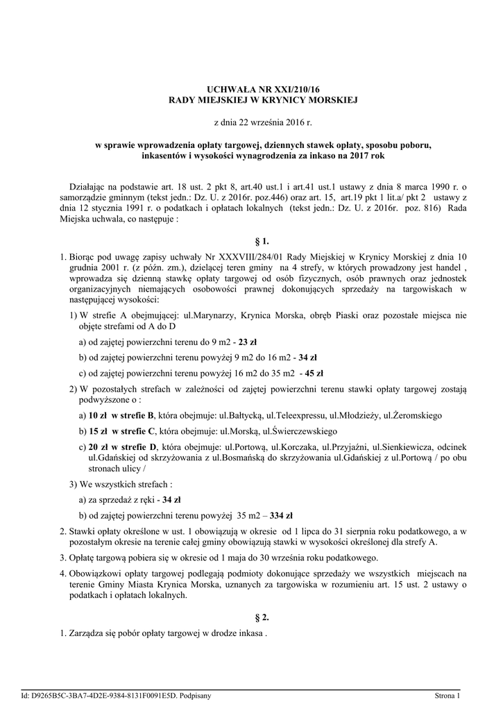 UCHWAŁA NR XXI/210/16 RADY MIEJSKIEJ W KRYNICY MORSKIEJ z dnia 22 września 2016 r. w sprawie wprowadzenia opłaty targowej, dziennych stawek opłaty, sposobu poboru, inkasentów i wysokości wynagrodzenia za inkaso na 2017 rok Działając na podstawie art. 18 ust. 2 pkt 8, art.40 ust.1 i art.41 ust.1 ustawy z dnia 8 marca 1990 r. o samorządzie gminnym (tekst jedn.: Dz. U. z 2016r. poz.446) oraz art. 15, art.19 pkt 1 lit.a/ pkt 2 ustawy z dnia 12 stycznia 1991 r. o podatkach i opłatach lokalnych (tekst jedn.: Dz. U. z 2016r. poz. 816) Rada Miejska uchwala, co następuje : § 1. 1. Biorąc pod uwagę zapisy uchwały Nr XXXVIII/284/01 Rady Miejskiej w Krynicy Morskiej z dnia 10 grudnia 2001 r. (z późn. zm.), dzielącej teren gminy na 4 strefy, w których prowadzony jest handel , wprowadza się dzienną stawkę opłaty targowej od osób fizycznych, osób prawnych oraz jednostek organizacyjnych niemających osobowości prawnej dokonujących sprzedaży na targowiskach w następującej wysokości: 1) W strefie A obejmującej: ul.Marynarzy, Krynica Morska, obręb Piaski oraz pozostałe miejsca nie objęte strefami od A do D a) od zajętej powierzchni terenu do 9 m2 - 23 zł b) od zajętej powierzchni terenu powyżej 9 m2 do 16 m2 - 34 zł c) od zajętej powierzchni terenu powyżej 16 m2 do 35 m2 - 45 zł 2) W pozostałych strefach w zależności od zajętej powierzchni terenu stawki opłaty targowej zostają podwyższone o : a) 10 zł w strefie B, która obejmuje: ul.Bałtycką, ul.Teleexpressu, ul.Młodzieży, ul.Żeromskiego b) 15 zł w strefie C, która obejmuje: ul.Morską, ul.Świerczewskiego c) 20 zł w strefie D, która obejmuje: ul.Portową, ul.Korczaka, ul.Przyjaźni, ul.Sienkiewicza, odcinek ul.Gdańskiej od skrzyżowania z ul.Bosmańską do skrzyżowania ul.Gdańskiej z ul.Portową / po obu stronach ulicy / 3) We wszystkich strefach : a) za sprzedaż z ręki - 34 zł b) od zajętej powierzchni terenu powyżej 35 m2 – 334 zł 2. Stawki opłaty określone w ust. 1 obowiązują w okresie od 1 lipca do 31 sierpnia roku podatkowego, a w pozostałym okresie na terenie całej gminy obowiązują stawki w wysokości określonej dla strefy A. 3. Opłatę targową pobiera się w okresie od 1 maja do 30 września roku podatkowego. 4. Obowiązkowi opłaty targowej podlegają podmioty dokonujące sprzedaży we wszystkich miejscach na terenie Gminy Miasta Krynica Morska, uznanych za targowiska w rozumieniu art. 15 ust. 2 ustawy o podatkach i opłatach lokalnych. § 2. 1. Zarządza się pobór opłaty targowej w drodze inkasa . Id: D9265B5C-3BA7-4D2E-9384-8131F0091E5D. Podpisany Strona 1 2. Wyznacza się Pana Tomasza Nowakowskiego na inkasenta opłaty targowej na terenie Gminy Miasta Krynica Morska. 3. Terminem płatności opłaty targowej jest dzień, w którym dokonywana jest sprzedaż. 4. Pobór opłaty targowej inkasent dokonuje na druku ścisłego zarachowania-kwitariuszu opłaty targowej, którego wzór stanowi załącznik do niniejszej uchwały. 5. Kwoty z zainkasowanej gotówki przyjmujący inkasa opłaty targowej będzie wpłacał do kasy Urzędu Miasta Krynica Morska po uprzednim rozliczeniu do 15-go i 30-ego każdego miesiąca. 6. Ustala się wynagrodzenie za inkaso opłaty targowej w wysokości 13% zainkasowanej kwoty. 7. Wynagrodzenie za inkaso płatne jest za okresy miesięczne. 8. Szczegółowe zasady poboru i rozliczanie opłaty targowej oraz wypłaty wynagrodzenia za inkaso określa każdorazowo umowa zawarta pomiędzy Burmistrzem Miasta Krynica Morska a inkasentem. § 3. Tracą moc: 1. Uchwała Nr XII/112/15 Rady Miejskiej w Krynicy Morskiej z dnia 26 listopada 2015r w sprawie wprowadzenia opłaty targowej, dziennych stawek opłaty, sposobu poboru, inkasentów i wysokości wynagrodzenia za inkaso na 2016 rok 2. Uchwała Nr XIV/141/16 Rady Miejskiej w Krynicy Morskiej z dnia 21 stycznia 2016r w sprawie zmiany uchwały dotyczącej wprowadzenia opłaty targowej, dziennych stawek opłaty, sposobu poboru, inkasentów i wysokości wynagrodzenia za inkaso na 2016 rok. § 4. Wykonanie uchwały powierza się Burmistrzowi Miasta Krynica Morska. § 5. Uchwała wchodzi w życie po upływie 14 dni od dnia ogłoszenia w Dzienniku Urzędowym Województwa Pomorskiego Przewodnicząca Rady Miejskiej Teresa Pawłowska Id: D9265B5C-3BA7-4D2E-9384-8131F0091E5D. Podpisany Strona 2 Załącznik do uchwały Nr XXI/210/16 z dnia 22 września 2016r. Pan/i ................................................................................ Seria ….........Nr........................... Adres ….................................................................................... …................................................................................... Nazwa należności – OPŁATA TARGOWA …....................... data pobrania zajęta powierzchnia oznaczenie strefy stawka Kwota pobranej opłaty pieczęć Słownie : …....................................................................................................................... Przewodnicząca Rady Miejskiej Teresa Pawłowska Id: D9265B5C-3BA7-4D2E-9384-8131F0091E5D. Podpisany Strona 1