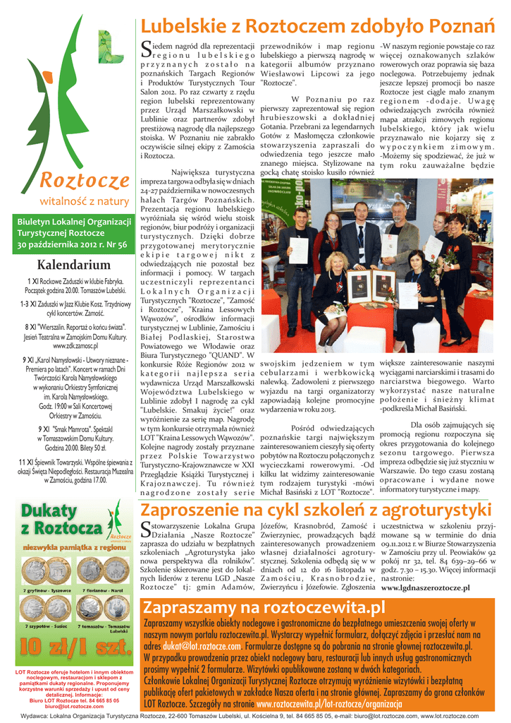 Lubelskie z Roztoczem zdobyło Poznań S iedem nagród dla reprezentacji regionu lubelskiego przyznanych zostało na poznańskich Targach Regionów i Produktów Turystycznych Tour Salon 2012. Po raz czwarty z rzędu region lubelski reprezentowany przez Urząd Marszałkowski w Lublinie oraz partnerów zdobył prestiżową nagrodę dla najlepszego stoiska. W Poznaniu nie zabrakło oczywiście silnej ekipy z Zamościa i Roztocza. przewodników i map regionu lubelskiego a pierwszą nagrodę w kategorii albumów przyznano Wiesławowi Lipcowi za jego "Roztocze". W Poznaniu po raz pierwszy zaprezentował się region hrubieszowski a dokładniej Gotania. Przebrani za legendarnych Gotów z Masłomęcza członkowie stowarzyszenia zapraszali do odwiedzenia tego jeszcze mało znanego miejsca. Stylizowane na Największa turystyczna gocką chatę stoisko kusiło również impreza targowa odbyła się w dniach 24-27 października w nowoczesnych halach Targów Poznańskich. Prezentacja regionu lubelskiego wyróżniała się wśród wielu stoisk Biuletyn Lokalnej Organizacji regionów, biur podróży i organizacji Turystycznej Roztocze turystycznych. Dzięki dobrze 30 października 2012 r. Nr 56 przygotowanej merytorycznie ekipie targowej nikt z odwiedzających nie pozostał bez informacji i pomocy. W targach 1 XI Rockowe Zaduszki w klubie Fabryka. u czestni czyli reprezentanci Początek godzina 20.00. Tomaszów Lubelski. Lokalnych Organizacji Turystycznych "Roztocze", "Zamość 1-3 XI Zaduszki w Jazz Klubie Kosz. Trzydniowy i Roztocze", "Kraina Lessowych cykl koncertów. Zamość. Wąwozów", ośrodków informacji 8 XI "Wierszalin. Reportaż o końcu świata". turystycznej w Lublinie, Zamościu i Białej Podlaskiej, Starostwa Jesień Teatralna w Zamojskim Domu Kultury. www.zdk.zamosc.pl Powiatowego we Włodawie oraz Biura Turystycznego "QUAND". W 9 XI „Karol Namysłowski - Utwory nieznane konkursie Róże Regionów 2012 w swojskim jedzeniem w tym Premiera po latach”. Koncert w ramach Dni k a t e g o r i i n a j l e p s z a s e r i a cebularzami i werbkowicką Twórczości Karola Namysłowskiego wydawnicza Urząd Marszałkowski nalewką. Zadowoleni z pierwszego w wykonaniu Orkiestry Symfonicznej Województwa Lubelskiego w wyjazdu na targi organizatorzy im. Karola Namysłowskiego. Lublinie zdobył I nagrodę za cykl zapowiadają kolejne promocyjne Godz. 19:00 w Sali Koncertowej "Lubelskie. Smakuj życie!" oraz wydarzenia w roku 2013. Orkiestry w Zamościu. wyróżnienie za serię map. Nagrodę Pośród odwiedzających w tym konkursie otrzymała również 9 XI "Smak Mamrota". Spektakl LOT "Kraina Lessowych Wąwozów". poznańskie targi największym w Tomaszowskim Domu Kultury. Kolejne nagrody zostały przyznane zainteresowaniem cieszyły się oferty Godzina 20.00. Bilety 50 zł. p r ze z Po l s k i e Towa r z ys t wo pobytów na Roztoczu połączonych z 11 XI Śpiewnik Towarzyski. Wspólne śpiewania z Turystyczno-Krajowznawcze w XXI wycieczkami rowerowymi. -Od okazji Święta Niepodległości. Restauracja Muzealna Przeglądzie Książki Turystycznej i kilku lat widzimy zainteresowanie w Zamościu, godzina 17.00. K ra j oz n awc ze j. Tu rów n i e ż tym rodzajem turystyki -mówi n a g r o d z o n e z o s t a ł y s e r i e Michał Basiński z LOT "Roztocze". Kalendarium -W naszym regionie powstaje co raz więcej oznakowanych szlaków rowerowych oraz poprawia się baza noclegowa. Potrzebujemy jednak jeszcze lepszej promocji bo nasze Roztocze jest ciągle mało znanym regionem -dodaje. Uwagę odwiedzających zwróciła również mapa atrakcji zimowych regionu lubelskiego, który jak wielu przyznawało nie kojarzy się z w ypoczynkiem zimow ym. -Możemy się spodziewać, że już w tym roku zauważalne będzie 51 większe zainteresowanie naszymi wyciągami narciarskimi i trasami do narciarstwa biegowego. Warto wykorzystać nasze naturalne położenie i śnieżny klimat -podkreśla Michał Basiński. Dla osób zajmujących się promocją regionu rozpoczyna się okres przygotowania do kolejnego sezonu targowego. Pierwsza impreza odbędzie się już styczniu w Warszawie. Do tego czasu zostaną opracowane i w ydane nowe informatory turystyczne i mapy. Zaproszenie na cykl szkoleń z agroturystyki S stowarzyszenie Lokalna Grupa Działania „Nasze Roztocze” zaprasza do udziału w bezpłatnych szkoleniach „Agroturystyka jako nowa perspektywa dla rolników”. Szkolenie skierowane jest do lokalnych liderów z terenu LGD „Nasze Roz tocze” tj: gmin Adamów, Józefów, Krasnobród, Zamość i Zwierzyniec, prowadzących bądź zainteresowanych prowadzeniem własnej działalności agroturystycznej. Szkolenia odbędą się w w dniach od 12 do 16 listopada w Zamościu, Krasnobrodzie, Zwierzyńcu i Józefowie. Zgłoszenia uczestnictwa w szkoleniu przyjmowane są w terminie do dnia 09.11.2012 r. w Biurze Stowarzyszenia w Zamościu przy ul. Peowiaków 92 pokój nr 32, tel. 84 639−29−66 w godz. 7.30 – 15.30. Więcej informacji na stronie: www.lgdnaszeroztocze.pl Zapraszamy na roztoczewita.pl LOT Roztocze oferuje hotelom i innym obiektom noclegowym, restauracjom i sklepom z pamiątkami dukaty regionalne. Proponujemy korzystne warunki sprzedaży i upust od ceny detalicznej. Informacje: Biuro LOT Roztocze tel. 84 665 85 05 [email protected] Zapraszamy wszystkie obiekty noclegowe i gastronomiczne do bezpłatnego umieszczenia swojej oferty w naszym nowym portalu roztoczewita.pl. Wystarczy wypełnić formularz, dołączyć zdjęcia i przesłać nam na adres [email protected]. Formularze dostępne są do pobrania na stronie głownej roztoczewita.pl. W przypadku prowadzenia przez obiekt noclegowy baru, restauracji lub innych usług gastronomicznych prosimy wypełnić 2 formularze. Wizytówki opublikowane zostaną w dwóch kategoriach. Członkowie Lokalnej Organizacji Turystycznej Roztocze otrzymują wyróżnienie wizytówki i bezpłatn¹ publikacjê ofert pakietowych w zakładce Nasza oferta i na stronie głównej. Z