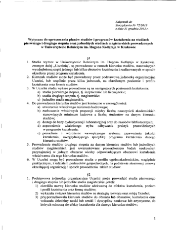 Załącznik do Zarządzenia Nr 72/2013 z dnia 31 grudnia 2013 r. Wytyczne do opracowania planów studiów i programów kształcenia na studiach pierwszego i drugiego stopnia oraz jednolitych studiach magisterskich prowadzonych w Uniwersytecie Rolniczym im. Hugona Kołłątaja w Krakowie §1 1. Studia wyższe w Uniwersytecie Rolniczym im. Hugona Kołłątaja w Krakowie, zwanym dalej „Uczelnią", są prowadzone w ramach kierunku studiów, stanowiących wyodrębnioną część jednego lub kilku obszarów kształcenia i realizowanych w sposób określony przez program kształcenia. 2. Kierunek studiów może być prowadzony przez podstawową jednostkę organizacyjną Uczelni, lub wspólnie przez kilka jednostek, na określonym poziomie i profilu kształcenia oraz formie studiów. 3. W Uczelni studia wyższe prowadzone są na następujących poziomach kształcenia: a) studia pierwszego stopnia, tj. inżynierskie lub licencjackie; b) studia drugiego stopnia, tj. magisterskie; c) jednolite studia magisterskie. 4. Do prowadzenia kierunku studiów jest konieczne w szczególności: a) utworzenie właściwego minimum kadrowego; b) zachowanie właściwych proporcji między liczbą nauczycieli akademickich stanowiących minimum kadrowe a liczbą studentów na danym kierunku studiów; c) dostęp do bazy dydaktycznej i laboratoryjnej oraz do zasobów bibliotecznych; d) zapewnienie właściwego trybu odbywania praktyk przewidzianych w programie kształcenia; e) posiadanie i wdrożenie wewnętrznego systemu zapewniania jakości kształcenia, uwzględniającego specyfikę programu kształcenia danego kierunku studiów. 5. Prowadzenie studiów drugiego stopnia na danym kierunku studiów lub jednolitych studiów magisterskich jest uwarunkowane prowadzeniem badań naukowych przynajmniej w jednym obszarze wiedzy odpowiadającym obszarowi kształcenia właściwemu dla tego kierunku studiów. 6. W Uczelni mogą być prowadzone studia o profilu ogólnoakademickim, względnie praktycznym, z udziałem podmiotów gospodarczych, na podstawie stosownej umowy określającej organizację i sposób prowadzenia takich studiów. §2 1. Podstawowa jednostka organizacyjna Uczelni może prowadzić studia pierwszego i drugiego stopnia lub jednolite studia magisterskie, jeżeli: 1) określiła nazwę kierunku studiów adekwatną do efektów kształcenia, poziom i profil kształcenia oraz formę studiów; 2) wykazała związek kierunku studiów ze strategią rozwoju oraz misją Uczelni; 3) przyporządkowała kierunek studiów do obszaru lub obszarów, kształcenia oraz wskazała dziedziny nauki lub sztuki i dyscypliny naukowe lub artystyczne, do których odnoszą się efekty kształcenia dla danego kierunku studiów; 2 4) posiada program kształcenia dla tego kierunku i poziomu kształcenia oraz dla określonego profilu lub profili kształcenia na tym kierunku. 2. W dokumentacji programu kształcenia uwzględnia się następującą strukturę opisu: 1) program kształcenia (poziom I); 2) efekty kształcenia (poziom II); 3) program studiów (poziom III), tj.:; a) plan studiów - semestralny układ przedmiotów/modułów, praktyk, prac dyplomowych wraz z liczbą pkt. ECTS i godzin zajęć przypisanych poszczególnym formom; b) programy przedmiotów opracowane w formie sylabusów. 3. Zasady określone w ust. 1 i 2 stosuje się odpowiednio do prowadzenia studiów pierwszego i drugiego stopnia lub jednolitych studiów magisterskich przez kilka jednostek wspólnie. §3 1. Program kształcenia dla określonego kierunku i poziomu oraz profilu kształcenia powinien uwzględniać: a) opis przyjętych w Uczelni (zatwierdzonych przez Senat na podstawie dokumentacji ujętej w §9) spójnych efektów kształcenia, zgodnych z Krajowymi Ramami Kwalifikacji dla Szkolnictwa Wyższego; b) program studiów, stanowiący opis procesu kształcenia prowadzącego do osiągnięcia efektów, wraz z przypisanymi do poszczególnych przedmiotów i/lub modułów tego procesu punktami ECTS. 2. Przez moduł kształcenia należy rozumieć szeroko rozumiany przedmiot lub grupę przedmiotów oraz ujętą w programie praktyką kierunkową, przygotowanie pracy dyplomowej, a także zbiór przedmiotów obowiązkowych dla określonej specjalności lub specjalizacji w ramach kierunku studiów, względnie zestaw przedmiotów wybranych przez studenta spośród przedmiotów należących do określonego, większego zbioru. 3. Efekty kształcenia stanowią zasób wiedzy, umiejętności oraz kompetencji personalnych i społecznych uzyskanych w procesie kształcenia przez studentów, przy czym: a) wiedza to zbiór powiązanych ze sobą faktów, zasad, teorii i doświadczeń wywodzących się z określonej dziedziny nauki i przyswojonych przez studenta; b) umiejętności to zdolność kreatywnego wykorzystania i stosowania wiedzy oraz wyćwiczonych sprawności do wykonywania zadań i rozwiązywania problemów; c) kompetencje personalne i społeczne to zdolność do autonomicznego i odpowiedzialnego wykonywania powierzonych zadań oraz umiejętność komunikowania się i współdziałania w ramach struktur zespołowych. Ujmują to, co student/słuchacz wie, rozumie i potrafi wykonać po zakończeniu procesu kształcenia. §4 1. Program studiów określa w szczególności przedmioty i/lub moduły kształcenia wraz z przypisanymi im efektami i treściami kształcenia oraz liczbą punktów ECTS. 2. Zasadniczym elementem programu studiów jest plan studiów, który powinien uwzględniać: 3 3. 4. a) formę studiów (stacjonarne lub niestacjonarne), liczbę semestrów i liczbę punktów ECTS konieczną dla uzyskania kwalifikacji odpowiadających poziomowi studiów; b) wykaz przedmiotów i/lub modułów, których zaliczenie jest wymagane dla ukończenia studiów na danym kierunku i poziomie kształcenia; c) semestralny wymiar godzin realizowanych w ramach wszystkich zaplanowanych form i typów zajęć oraz metod kształcenia; d) formę zaliczenia, stwierdzającą osiągnięcie efek