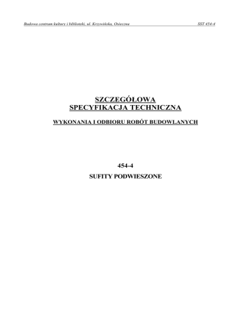 Budowa centrum kultury i biblioteki, ul. Krzywińska, Osieczna SST 454-4 SZCZEGÓŁOWA SPECYFIKACJA TECHNICZNA WYKONANIA I ODBIORU ROBÓT BUDOWLANYCH 454-4 SUFITY PODWIESZONE Budowa centrum kultury i biblioteki, ul. Krzywińska, Osieczna SST 454-4 SPIS TREŚCI 1. WSTĘP............................................................................................................................................ 3 1.1. Przedmiot SST .......................................................................................................................... 3 1.2. Zakres stosowania ..................................................................................................................... 3 1.3. Określenia podstawowe ............................................................................................................ 3 1.4. Zakres robót objętych SST........................................................................................................ 3 1.5. Ogólne wymagania dotyczące robót ......................................................................................... 3 2. MATERIAŁY ................................................................................................................................. 4 2.1. Wymagania ogólne ................................................................................................................... 4 2.2. Materiały potrzebne do wykonania robót ................................................................................. 4 3. SPRZĘT .......................................................................................................................................... 5 3.1. Wymagania ogólne ................................................................................................................... 5 3.2. Sprzęt do wykonywania robót................................................................................................... 5 4. TRANSPORT ................................................................................................................................. 5 4.1. Wymagania ogólne ................................................................................................................... 5 4.2. Transport materiałów ................................................................................................................ 5 4.3. Przechowywanie i składowanie materiałów ............................................................................. 5 5. WYKONANIE ROBÓT ................................................................................................................ 5 5.1. Wymagania ogólne ................................................................................................................... 5 5.2. Warunki przystąpienia do robót ................................................................................................ 6 5.3. Montaż okładzin z na rusztach stalowych na sufitach .............................................................. 6 6. KONTROLA JAKOŚCI ROBÓT ................................................................................................ 7 6.1. Wymagania ogólne ................................................................................................................... 7 6.2. Badania w czasie wykonywania robót ...................................................................................... 7 7. OBMIAR ROBÓT ......................................................................................................................... 8 8. ODBIÓR ROBÓT .......................................................................................................................... 8 8.1. Ogólne zasady odbioru robót. ................................................................................................... 8 8.2. Odbiór podłoży ......................................................................................................................... 8 8.3. Zgodność z dokumentacją ......................................................................................................... 8 8.4. Wymagania przy odbiorze ........................................................................................................ 8 9. PODSTAWA PŁATNOŚCI .......................................................................................................... 9 10. PRZEPISY ZWIĄZANE ............................................................................................................. 9 2 Budowa centrum kultury i biblioteki, ul. Krzywińska, Osieczna 454. SST 454-4 ROBOTY WYKOŃCZENIOWE 454-4 SUFITY PODWIESZONE 1. WSTĘP 1.1. Przedmiot SST Przedmiotem niniejszej szczegółowej specyfikacji technicznej są wymagania dotyczące wykonania i odbioru sufitów podwieszonych w związku z budową budynku centrum kultury i biblioteki wraz z zagospodarowaniem terenu oraz urządzeniami towarzyszącymi, przy ulicy Krzywińskiej w miejscowości Osieczna. Klasyfikacja wg Wspólnego Słownika Zamówień (CPV) Grupa Klasa Kategoria Opis Roboty wykończeniowe w zakresie obiektów budowlanych. 45400000-1 Roboty w zakresie zakładania stolarki budowlanej oraz roboty ciesielskie 45420000-0 45421000-4 Roboty w zakresie stolarki budowlanej 45421146-9 Instalowanie sufitów podwieszanych 1.2. Zakres stosowania Szczegółowa specyfikacja techniczna jest stosowana jako dokument przetargowy i kontraktowy przy zlecaniu i realizacji robót wymienionych w pkt. 1.1. 1.3. Określenia podstawowe Określenia i nazewnictwo użyte w niniejszej szczegółowej specyfikacji technicznej są zgodne z obowiązującymi podanymi w normach PN i przepisach Prawa budowlanego. konstrukcja – uporządkowany zespół połączonych części, zaprojektowany w celu zapewnienia określonego stopnia sztywności. Sufit podwieszony – sufit przeznaczony do zmniejszenia wysokości przestrzeni lub zapewniający miejsca dla instalacji. 1.4. Zakres robót