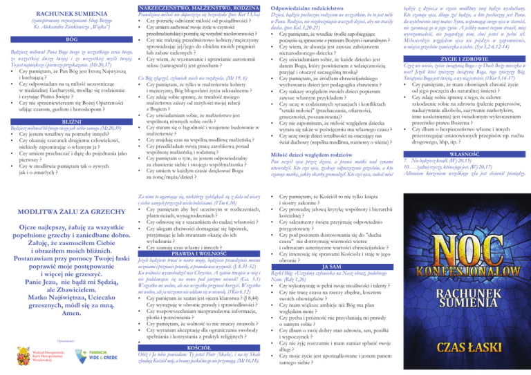 RACHUNEK SUMIENIA NARZECZEŃSTWO, MAŁŻEŃSTWO, RODZINA Prawdziwa miłość nie dopuszcza się bezwstydu (por. Kor 13,5a) (zainspirowany rozważaniami Sługi Bożego Czy potrafię odróżnić miłość od pożądliwości ? Ks. Aleksandra Zienkiewicza „Wujka”) Czy umiem zachować swoje życie w czystości przedmałżeńskiej i potrafię się wstydzić nieskromności ? BÓG Czy nie traktuję przedmiotowo kobiety/mężczyzny sprowadzając jej/jego do obiektu moich pragnień Będziesz miłował Pana Boga twego ze wszystkiego serca twego, lub zabaw cielesnych ? ze wszystkiej duszy twojej i ze wszystkiej myśli twojej. Czy wiem, że wyznawanie i uprawianie autonomii To jest największe i pierwsze przykazanie. (Mt 20,37) seksu (samogwałt) jest grzechem ? Czy pamiętam, że Pan Bóg jest Istotą Najwyższą i kochającą ? Co Bóg złączył, człowiek niech nie rozdziela. (Mt 19, 6) Czy odpowiadam na tą miłość uczestnicząc Czy pamiętam, że tylko w małżeństwie kobiety w niedzielnej Eucharystii, modląc się codziennie i mężczyzny, Bóg błogosławi życiu seksualnemu ? i czytając Pismo Święte ? Czy zdaję sobie sprawę, że trwałość mojego małżeństwa zależy od zażyłości mojej relacji Czy nie sprzeniewierzam się Bożej Opatrzności z Bogiem ? ufając czarom, gusłom i horoskopom ? Czy uświadamiam sobie, że małżeństwo jest wspólnotą równych sobie osób ? BLIŹNI Czy staram się o łagodność i wzajemne budowanie w Będziesz miłował bliźniego swego jak siebie samego. (Mt 20,39) małżeństwie ? Czy jestem wrażliwy na potrzeby innych? Czy znajduję czas na wspólną modlitwę małżeńską ? Czy okazuję szacunek drugiemu człowiekowi, Czy przedkładam swoją pracę zarobkową ponad niekiedy zapominając o własnym ja ? wspólnotę małżeńską i rodzinną ? Czy umiem przebaczać i dążę do pojednania jako Czy pamiętam o tym, że jestem odpowiedzialny pierwszy ? za zbawienie siebie i swojego współmałżonka ? Czy w modlitwie pamiętam tak o żywych Czy umiem w każdym czasie dziękować Bogu jak i o zmarłych ? za żonę/męża/dzieci ? MODLITWA ŻALU ZA GRZECHY Ojcze najlepszy, żałuję za wszystkie popełnione grzechy i zaniedbane dobro. Żałuję, że zasmuciłem Ciebie i obraziłem moich bliźnich. Postanawiam przy pomocy Twojej łaski poprawić moje postępowanie i więcej nie grzeszyć. Panie Jezu, nie bądź mi Sędzią, ale Zbawicielem. Matko Najświętsza, Ucieczko grzesznych, módl się za mną. Amen. Opracowanie: Wydział Duszpasterski Kurii Metropolitarnej Wrocławskiej Za nimi to uganiając się, niektórzy zabłąkali się z dala od wiary i siebie samych przeszyli wielu boleściami. (1Tm 6,10) Czy pamiętam aby być uczciwym w rozliczeniach, płatnościach, wynagrodzeniach ? Czy odnoszę się z szacunkiem do cudzej własności ? Czy ulegam chciwości domagając się łapówek, przyjmując je lub stwarzam okazję do ich wyłudzania ? Czy szanuję czas własny i innych ? PRAWDA I WOLNOŚĆ Jeżeli będziecie trwać w nauce mojej, będziecie prawdziwie moimi uczniami i poznacie prawdę, a prawda was wyzwoli. (J. 8.31-32) Ku wolności wyswobodził nas Chrystus. A zatem trwajcie w niej i nie poddawajcie się na nowo pod jarzmo niewoli! (Ga. 5.1) Wszystko mi wolno, ale nie wszystko przynosi korzyść. Wszystko mi wolno, ale ja niczemu nie oddam się w niewolę. (1Kor 6,12) Czy pamiętam że szatan jest ojcem kłamstwa ? (J 8,44) Czy występuję w obronie prawdy i sprawiedliwości ? Czy rozpowszechniam niesprawdzone informacje, plotki i pomówienia ? Czy pamiętam, że wolność to nie znaczy swawola ? Czy wyrażam akceptację dla ograniczania swobody spełniania i korzystania z praktyk religijnych ? KOŚCIÓŁ Otóż i Ja tobie powiadam: Ty jesteś Piotr [Skała], i na tej Skale zbuduję Kościół mój, a bramy piekielne go nie przemogą. (Mt 16,18). Odpowiedzialne rodzicielstwo Dzieci, bądźcie posłuszne rodzicom we wszystkim, bo to jest miłe w Panu. Rodzice, nie rozdrażniajcie waszych dzieci, aby nie traciły ducha. (por. Kol. 3,20-21) Czy pamiętam, że wszelkie środki zapobiegające poczęciu są sprzeczne z prawem Bożym i naturalnym ? Czy wiem, że aborcja jest zawsze zabójstwem nienarodzonego dziecka ? Czy uświadamiam sobie, że każde dziecko jest darem Boga, który powinienem z wdzięcznością przyjąć i otoczyć szczególną troską? Czy pamiętam, że źródłem chrześcijańskiego wychowania dzieci jest pedagogika zbawienia ? Czy nakazy względem swoich dzieci popieram zawsze własnym przykładem ? Czy uczę w codziennych sytuacjach i konfliktach "sztuki miłości" (przebaczania, ofiarności, grzeczności, poszanowania)? Czy nie zapominam, że miłość względem dziecka wyraża się także w poświęceniu mu własnego czasu ? Czy uczę swoje dzieci wrażliwości na otaczający nas świat duchowy (wspólna modlitwa, rozmowy o wierze) ? Miłość dzieci względem rodziców Pan uczcił ojca przez dzieci, a prawa matki nad synami utwierdził. Kto czci ojca, zyskuje odpuszczenie grzechów, a kto szanuje matkę, jakby skarby gromadził. Kto czci ojca, radość mieć Czy pamiętam, że Kościół to nie tylko księża i siostry zakonne ? Czy prowadzę jałową krytykę wspólnoty i hierarchii kościelnej ? Czy sakramenty święte przyjmuję odpowiednio przygotowany ? Czy pod pozorem dostosowania się do "ducha czasu" nie dotrzymuję wierności wierze i odrzucam autentyczne wartości chrześcijańskie ? Czy interesuję się sprawami Kościoła i staję w jego obronie ? JA SAM Rzekł Bóg: «Uczyńmy człowieka na Nasz obraz, podobnego Nam. (Rdz 1,26) Czy wykorzystuję w pełni swoje możliwości i talenty ? Czy nie tracę czasu na rzeczy zbędne, kosztem swoich obowiązków ? Czy mam większe ambicje niż Bóg ma plan względem mnie ? Czy pycha i próżność nie przysłaniają mi prawdy o samym sobie ? Czy dbam o swój dobry stan zdrowia, sen, posiłki i wypoczynek ? Czy nie żyję rozrzutnie i mam zamiar spłacić swoje dł