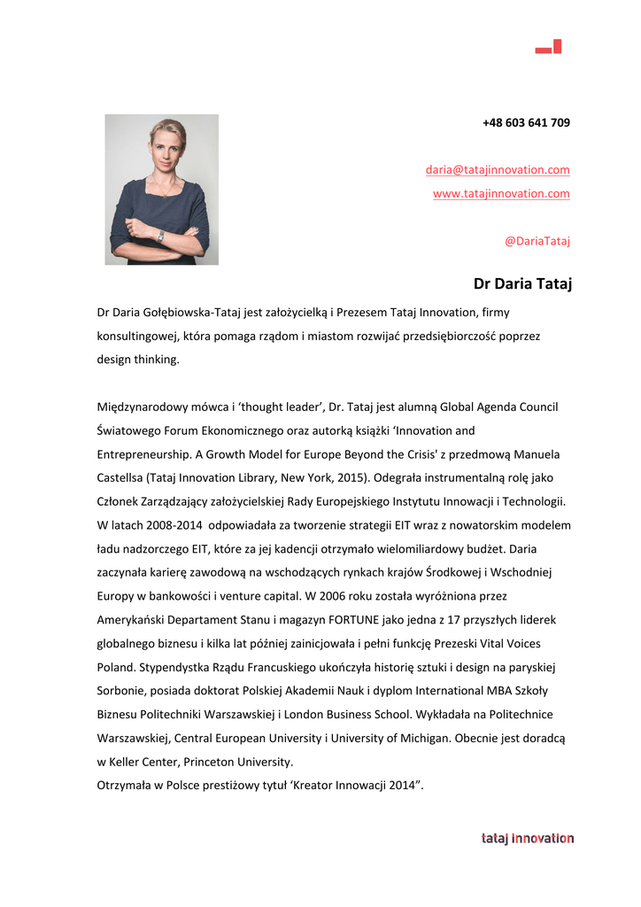 +48 603 641 709 [email protected] www.tatajinnovation.com @DariaTataj Dr Daria Tataj Dr Daria Gołębiowska-Tataj jest założycielką i Prezesem Tataj Innovation, firmy konsultingowej, która pomaga rządom i miastom rozwijać przedsiębiorczość poprzez design thinking. Międzynarodowy mówca i ‘thought leader’, Dr. Tataj jest alumną Global Agenda Council Światowego Forum Ekonomicznego oraz autorką książki ‘Innovation and Entrepreneurship. A Growth Model for Europe Beyond the Crisis' z przedmową Manuela Castellsa (Tataj Innovation Library, New York, 2015). Odegrała instrumentalną rolę jako Członek Zarządzający założycielskiej Rady Europejskiego Instytutu Innowacji i Technologii. W latach 2008-2014 odpowiadała za tworzenie strategii EIT wraz z nowatorskim modelem ładu nadzorczego EIT, które za jej kadencji otrzymało wielomiliardowy budżet. Daria zaczynała karierę zawodową na wschodzących rynkach krajów Środkowej i Wschodniej Europy w bankowości i venture capital. W 2006 roku została wyróżniona przez Amerykański Departament Stanu i magazyn FORTUNE jako jedna z 17 przyszłych liderek globalnego biznesu i kilka lat później zainicjowała i pełni funkcję Prezeski Vital Voices Poland. Stypendystka Rządu Francuskiego ukończyła historię sztuki i design na paryskiej Sorbonie, posiada doktorat Polskiej Akademii Nauk i dyplom International MBA Szkoły Biznesu Politechniki Warszawskiej i London Business School. Wykładała na Politechnice Warszawskiej, Central European University i University of Michigan. Obecnie jest doradcą w Keller Center, Princeton University. Otrzymała w Polsce prestiżowy tytuł ‘Kreator Innowacji 2014”.