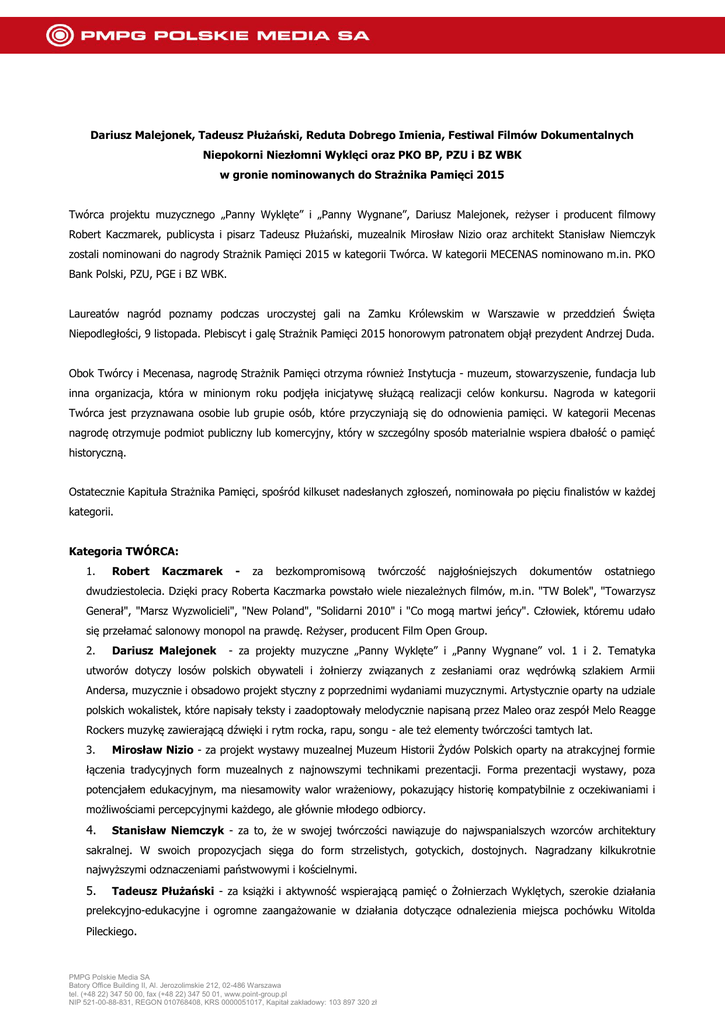 Dariusz Malejonek, Tadeusz Płużański, Reduta Dobrego Imienia, Festiwal Filmów Dokumentalnych Niepokorni Niezłomni Wyklęci oraz PKO BP, PZU i BZ WBK w gronie nominowanych do Strażnika Pamięci 2015 Twórca projektu muzycznego „Panny Wyklęte” i „Panny Wygnane”, Dariusz Malejonek, reżyser i producent filmowy Robert Kaczmarek, publicysta i pisarz Tadeusz Płużański, muzealnik Mirosław Nizio oraz architekt Stanisław Niemczyk zostali nominowani do nagrody Strażnik Pamięci 2015 w kategorii Twórca. W kategorii MECENAS nominowano m.in. PKO Bank Polski, PZU, PGE i BZ WBK. Laureatów nagród poznamy podczas uroczystej gali na Zamku Królewskim w Warszawie w przeddzień Święta Niepodległości, 9 listopada. Plebiscyt i galę Strażnik Pamięci 2015 honorowym patronatem objął prezydent Andrzej Duda. Obok Twórcy i Mecenasa, nagrodę Strażnik Pamięci otrzyma również Instytucja - muzeum, stowarzyszenie, fundacja lub inna organizacja, która w minionym roku podjęła inicjatywę służącą realizacji celów konkursu. Nagroda w kategorii Twórca jest przyznawana osobie lub grupie osób, które przyczyniają się do odnowienia pamięci. W kategorii Mecenas nagrodę otrzymuje podmiot publiczny lub komercyjny, który w szczególny sposób materialnie wspiera dbałość o pamięć historyczną. Ostatecznie Kapituła Strażnika Pamięci, spośród kilkuset nadesłanych zgłoszeń, nominowała po pięciu finalistów w każdej kategorii. Kategoria TWÓRCA: 1. Robert Kaczmarek - za bezkompromisową twórczość najgłośniejszych dokumentów ostatniego dwudziestolecia. Dzięki pracy Roberta Kaczmarka powstało wiele niezależnych filmów, m.in. "TW Bolek", "Towarzysz Generał", "Marsz Wyzwolicieli", "New Poland", "Solidarni 2010" i "Co mogą martwi jeńcy". Człowiek, któremu udało się przełamać salonowy monopol na prawdę. Reżyser, producent Film Open Group. 2. Dariusz Malejonek - za projekty muzyczne „Panny Wyklęte” i „Panny Wygnane” vol. 1 i 2. Tematyka utworów dotyczy losów polskich obywateli i żołnierzy związanych z zesłaniami oraz wędrówką szlakiem Armii Andersa, muzycznie i obsadowo projekt styczny z poprzednimi wydaniami muzycznymi. Artystycznie oparty na udziale polskich wokalistek, które napisały teksty i zaadoptowały melodycznie napisaną przez Maleo oraz zespół Melo Reagge Rockers muzykę zawierającą dźwięki i rytm rocka, rapu, songu - ale też elementy twórczości tamtych lat. 3. Mirosław Nizio - za projekt wystawy muzealnej Muzeum Historii Żydów Polskich oparty na atrakcyjnej formie łączenia tradycyjnych form muzealnych z najnowszymi technikami prezentacji. Forma prezentacji wystawy, poza potencjałem edukacyjnym, ma niesamowity walor wrażeniowy, pokazujący historię kompatybilnie z oczekiwaniami i możliwościami percepcyjnymi każdego, ale głównie młodego odbiorcy. 4. Stanisław Niemczyk - za to, że w swojej twórczości nawiązuje do najwspanialszych wzorców architektury sakralnej. W swoich propozycjach sięga do form strzelistych, gotyckich, dostojnych. Nagradzany kilkukrotnie najwyższymi odznaczeniami państwowymi i kościelnymi. 5. Tadeusz Płużański - za książki i aktywność wspierającą pamięć o Żołnierzach Wyklętych, szerokie działania prelekcyjno-edukacyjne i ogromne zaangażowanie w działania dotyczące odnalezienia miejsca pochówku Witolda Pileckiego. PMPG Polskie Media SA Batory Office Building II, Al. Jerozolimskie 212, 02-486 Warszawa tel. (+48 22) 347 50 00, fax (+48 22) 347 50 01, www.point-group.pl NIP 521-00-88-831, REGON 010768408, KRS 0000051017, Kapitał zakładowy: 103 897 320 zł Kategoria INSTYTUCJA: 1. Pismo „Glaukopis”- półrocznik naukowy, znany i rozpoznawalny nie tylko w Polsce. Niezwykłe wydawnictwo, obchodzące 11 listopada swoje 12-lecie, skupia wokół siebie kilka pokoleń polskich patriotów od kombatantów II wojny światowej, działaczy opozycji lat 70. i podziemia w stanie wojennym, członków dawnego NZS i korporantów, Polonię, historyków z tytułami naukowymi, badaczy regionalnych po najmłodszych pasjonatów. 2. Ośrodek Myśli Politycznej - za serię "Biblioteka Klasyki Polskiej Myśli Politycznej"- w jej ramach wydawane są dzieła dawnych polskich myślicieli politycznych. 3. Reduta Dobrego Imienia, Maciej Świrski - za powołanie instytucji, która w skuteczny sposób stara się walczyć o obronę dobrego imienia Polski. 4. Stowarzyszenie Auschwitz Memento - za zorganizowanie zbiórki publicznej na produkcję fabularyzowanego dokumentu „Pilecki”, popularyzującego losy rotmistrza Witolda Pileckiego, uczestnika wojny polskobolszewickiej, ochotnika do Auschwitz i walki w Powstaniu Warszawskim. 5. Stowarzyszenie Scena Kultury – za Festiwal Filmów Dokumentalnych Niepokorni Niezłomni Wyklęci, każdego roku poszerzający rozmach i program festiwalowy. Wydarzenie skupia wokół siebie instytucje, artystów, doświadczonych ale tez młodych twórców. Festiwal NNW jest największym filmowym wydarzeniem w Polsce prezentującym dzieła audiowizualne o tematyce polskiej historii. Kategoria MECENAS: 1. Artur Nowakowski i Bogdan Kaczmarek – sponsorzy Masztu Wolności na rondzie Zgrupowania AK “Radosław” w Warszawie, najwyższej flagi biało-czerwonej w Polsce. 2. Bank Zachodni WBK - mecenas filmu „Fajna Ferajna” opowiadającego o powstańczym zrywie widzianym oczami jego najmłodszych uczestników. Telewizyjna premiera tego fabularyzowanego dokumentu miała miejsce w 71. rocznicę wybuchu Powstania Warszawskiego na antenie TVP ABC. Ponadto BZ WBK wspiera cały szereg innych wydarzeń i realizacji związanych z przenoszeniem historii na język filmu czy muzyki (np. sponsoruje kolejną płytę zespołu „Contra Mundum”). 3. Polska Grupa Energetyczna - mecenas Internetowego Polskiego Słownika Biograficznego - największej polskiej internetowej biblioteki multimedialnej, poświęconej wybitnym postaciom, które wpłynęły na historię naszego k