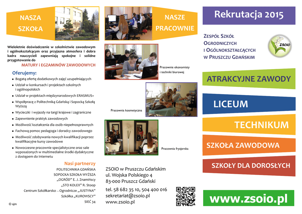 NASZA NASZE SZKOŁA PRACOWNIE ZESPÓŁ SZKÓŁ OGRODNICZYCH I OGÓLNOKSZTAŁCĄCYCH W PRUSZCZU GDAŃSKIM Wieloletnie doświadczenie w szkolnictwie zawodowym i ogólnokształcącym oraz przyjazna atmosfera i dobra kadra nauczycieli zapewniają spokojne i solidne przygotowanie do MATURY i EGZAMINÓW ZAWODOWYCH Pracownie ekonomisty i techniki biurowej Oferujemy: Bogatą ofertę dodatkowych zajęć uzupełniających Udział w konkursach i projektach szkolnych i ogólnopolskich Udział w projektach międzynarodowych ERASMUS+ Współpracę z Politechniką Gdańską i Sopocką Szkołą Wyższą Wycieczki i wyjazdy na targi krajowe i zagraniczne Zapewnienie praktyk zawodowych Możliwość kształcenia dla osób niepełnosprawnych Fachową pomoc pedagoga i doradcy zawodowego Możliwość zdobywania nowych kwalifikacji poprzez kwalifikacyjne kursy zawodowe Nowoczesne pracownie specjalistyczne oraz sale wyposażonych w multimedialne środki dydaktyczne z dostępem do Internetu ATRAKCYJNE ZAWODY LICEUM Pracownia kosmetyczna TECHNIKUM Pracownia fryzjerska Nasi partnerzy POLITECHNIKA GDAŃSKA SOPOCKA SZKOŁA WYŻSZA „OGRÓD” E. J. Znamińscy „STO KOLEX” R. Stoop Centrum Szkółkarsko — Ogrodnicze „JUSTYNA” Szkółka „KUROWSCY” © ajm SIEĆ 34 Rekrutacja 2015 ZSOiO w Pruszczu Gdańskim ul. Wojska Polskiego 4 83-000 Pruszcz Gdański tel. 58 682 35 10, 504 400 016 [email protected] www.zsoio.pl SZKOŁA ZAWODOWA SZKOŁY DLA DOROSŁYCH www.zsoio.pl SZKOŁY DLA MŁODZIEŻY LICEUM OGÓLNOKSZTAŁCĄCE LICEUM OGÓLNOKSZTAŁCĄCE KLASA LINGWISTYCZNA WIECZOROWE po gimnazjum i ZSZ ZAOCZNE po gimnazjum i ZSZ Program rozszerzony z przedmiotów: j. polski, j. angielski, historia, wos Przedmioty uzupełniające: przyroda, zajęcia artystyczne KLASA BIZNESOWA Program rozszerzony z przedmiotów: matematyka, geografia, j. angielski, biologia Przedmioty uzupełniające: historia i społeczeństwo, ekonomia w praktyce TECHNIKUM kształci w zawodzie: TECHNIK ARCHITEKTURY KRAJOBRAZU Przedmioty rozszerzone: biologia, matematyka TECHNIK OGRODNIK TERMINY REKRUTACJI SZKOŁY DLA DOROSŁYCH SZKOŁY DLA MŁODZIEŻY Do 22.06.2015 składanie dokumentów o przyjęcie do wybranego typu szkoły Do 25.06.2015 dokonywanie ewentualnych zmian w decyzji o wyborze szkoły i przeniesienie wniosku do innej szkoły 26.06.15 — 30.06.2015 do godz. 12.00 dostarczanie przez absolwentów gimnazjów kopii świadectwa ukończenia szkoły i kopii zaświadczenia o wynikach egzaminu gimnazjalnego 02.07.2015 do godz. 12.00 ogłoszenie listy kandydatów przyjętych do szkół 02.07 — 06.07.2015 do godz. 12.00 kandydaci umieszczeni na listach potwierdzają wolę podjęcia nauki w szkole, dostarczając oryginał świadectwa oraz oryginał zaświadczenia o szczegółowych wynikach egzaminu gimnazjalnego 07.07.2015 do godz. 12.00 ogłoszenie listy uczniów przyjętych do szkoły Od 07.07.2015 składanie przez kandydatów nieprzyjętych do wybranej szkoły oryginałów dokumentów (jeżeli są jeszcze wolne miejsca) nauka odbywa się w weekendy SZKOŁA POLICEALNA dwuletnia, na podbudowie szkoły ponadgimnazjalnej matura nie jest wymagana kształcąca w zawodzie: TECHNIK USŁUG KOSMETYCZNYCH OPIEKUN OSOBY STARSZEJ KURSY KWALIFIKACYJNE Przedmioty rozszerzone: biologia, matematyka TECHNIK ARCHITEKTURY KRAJOBRAZU TECHNIK EKONOMISTA TECHNIK OGRODNIK Przedmioty rozszerzone: geografia, matematyka TECHNIK EKONOMISTA TECHNIK HANDLOWIEC TECHNIK HANDLOWIEC Przedmioty rozszerzone: j. angielski, matematyka TECHNIK AGROBIZNESU TECHNIK AGROBIZNESU OGRODNIK FLORYSTA SPRZEDAWCA FRYZJER Przedmioty rozszerzone: j. angielski, matematyka TECHNIK USŁUG FRYZJERSKICH Przedmioty rozszerzone: j. angielski, chemia ZASADNICZA SZKOŁA ZAWODOWA OGRODNIK SPRZEDAWCA FRYZJER Nasi absolwenci o szkole: „Wyjątkowo ładne otoczenie szkoły, jakiego nie widziałem nigdzie indziej.” Piotr Mazur „Jeśli któreś z nas wpada na dobry pomysł, szkoła go nie blokuje.” Joanna Knitter „Niepowtarzalna atmosfera, życzliwość nauczycieli i pracowników sprawiają, że szkoła staje się nie tylko obowiązkiem, ale i przyjemnością.” Aneta Gałka www.zsoio.pl i podań SZKOŁY DLA DOROSŁYCH Do 21.08.2015 składanie dokumentów o przyjęcie do wybranego typu szkoły i podań 24.08 — 27.08.2015 i przyjęcie do szkoły 28.08.2015 ogłoszenie listy osób przyjętych do szkoły rozmowy z kandydatami