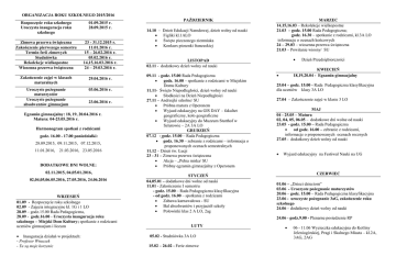 ORGANIZACJA ROKU SZKOLNEGO 2015/2016 Rozpoczęcie roku szkolnego Uroczysta inauguracja roku szkolnego 01.09.2015 r. 28.09.2015 r. Zimowa przerwa świąteczna Zakończenie pierwszego semestru Termin ferii zimowych Studniówka Rekolekcje wielkopostne Wiosenna przerwa świąteczna Egzamin Zakończenie zajęć w klasach maturalnych 23 - 31.12.2015 r. 11.01.2016 r. 15 – 26.02.2016 r. 05.02.2016 r. 14,15,16.03.2016 r. 24 – 29.03.2016 r. Uroczyste pożegnanie maturzystów Uroczyste pożegnanie absolwentów gimnazjum 03.06.2016 r. 29.04.2016 r. 23.06.2016 r. Egzamin gimnazjalny: 18, 19, 20.04.2016 r. Matura: 04-25.05.2016 r. Harmonogram spotkań z rodzicami godz. 16.00 - 17.00 poniedziałki: 28.09.2015, 09.11.2015, 07.12.2015, 11.01.2016, 21.03.2016, 23.05.2016 DODATKOWE DNI WOLNE: 02.11.2015, 04,05.01.2016, 02,04,05,06.05.2016, 27.05.2016, 24.06.2016 WRZESIEŃ 01.09 - Rozpoczęcie roku szkolnego 02.09 - Zajęcia integracyjne kl. 1G i 1 LO 28.09 – godz.15.00 Rada Pedagogiczna, 28.09 - godz.16.00 - Uroczysta inauguracja roku szkolnego – Miejski Dom Kultury; spotkanie z rodzicami uczniów gimnazjum i liceum Inauguracja działań w projektach: - Profesor Wnuczek - Tu są moje korzenie PAŹDZIERNIK 14.10 – Dzień Edukacji Narodowej, dzień wolny od nauki Figliki kl.1ALO Święto pieczonego ziemniaka Konkurs piosenki francuskiej MARZEC 14,15,16.03 – Rekolekcje wielkopostne 21.03 – godz. 15.00 Rada Pedagogiczna; godz. 16.30 – spotkanie z rodzicami, kl.3A LO informacje o ocenach końcowych 24 – 29.03 – wiosenna przerwa świąteczna 21.03 – Powitanie wiosny/ SU LISTOPAD 02.11 - dodatkowy dzień wolny od nauki 09.11 - godz. 15.00 Rada Pedagogiczna godz. 16.00 – spotkanie z rodzicami w Miejskim Domu Kultury 11.11- Święto Niepodległości, dzień wolny od nauki Słodkości na Dzień Niepodległości 27.11 – Andrzejki szkolne/ SU Próbna matura z Operonem Wyjazd edukacyjny na GIS DAY – fakultet geograficzny, koło geograficzne Wyjazd edukacyjny do Muzeum Stutthof w Sztutowie – 2A 3A LO GRUDZIEŃ 07.12 - godz. 15.00 – Rada Pedagogiczna godz. 16.30 – zebranie z rodzicami – informacja o proponowanych ocenach semestralnych 11.12 – Dzień św. Łucji 23 - 31 – Zimowa przerwa świąteczna Akcja – „Pełna miska/ SU Próbny egzamin gimnazjalny z Operonem STYCZEŃ 04,05.01 – dodatkowe dni wolne od nauki 11.01 - Zakończenie I semestru - godz. 15.00 – Rada Pedagogiczna klasyfikacyjna - od godz. 16.00 – spotkania z rodzicami Zabawa karnawałowa - SU Bal absolwentów i przyjaciół szkoły Połowinki klas 2 A LO, 2ag Dzień Przedsiębiorczości KWIECIEŃ 18,19,20.04 - Egzamin gimnazjalny 25.04 – godz. 15.00 - Rada Pedagogiczna klasyfikacyjna dla uczniów klasy 3A LO 27.04 – Zakończenie zajęć w klasie 3 LO MAJ 04 - 25.05 – Matura 02, 04, 05, 06.05 – dodatkowe dni wolne od nauki 23.05 - godz. 15.00 – Rada Pedagogiczna od godz. 16.00 – zebranie z rodzicami, informacje o proponowanych ocenach rocznych 27.05 - dodatkowy dzień wolny od nauki Wyjazd edukacyjny na Festiwal Nauki na UG CZERWIEC 01.06 – „Dzieci dzieciom” 03.06 - Uroczyste pożegnanie maturzystów 20.06 – godz. 15.00 – Rada Pedagogiczna klasyfikacyjna 23.06 - uroczyste pożegnanie 3aG, zakończenie roku szkolnego 24.06 – dodatkowy dzień wolny od nauki 24.06 - godz.9.00 - Plenarne posiedzenie RP LUTY 05.02 - Studniówka 3A LO 15.02 – 26.02 - Ferie zimowe 06 - 11.06 Wycieczka edukacyjna do Kotliny Jeleniogórskiej, Pragi i Skalnego Miasta – kl.2A, 3AG, 2AG Adres szkoły: Szkoła w roku szkolnym 2015/16 realizuje następujące projekty współfinansowane z pozyskanych środków: Zespół Szkół Społecznych Społecznego Towarzystwa Oświatowego Im. Jana Nowaka -Jeziorańskiego ul. Jana III Sobieskiego 7A 77-300 Człuchów Nr konta szkoły: 11124037961111000030744006 Projekt Wnuczek – Zarząd Główny STO Tu są moje korzenie - Polsko – Amerykańska Fundacja Wolności Nietypowe środy w gimnazjum: Warsztaty przyrodnicze, fizyczne chemiczne i geograficzne wg opracowanego harmonogramu. Inne proponowane wydarzenia i przedsięwzięcia szkolne: tel./fax: 59 8341174 e-mail sekretariatu: [email protected] e-mail dyrektora: [email protected] Cykliczne drugie śniadania pn.: „zdrowe i smaczne” Kawiarenki tematyczne Cykliczne wyjazdy do teatru i kina Apele, gazetki tematyczne i okolicznościowe Wycieczki rowerowe, kuligi, spływy kajakowe Wieczory filmowe www.losto.net Kalendarz szkolny 2015 / 2016 facebook.com/spoleczniakwczluchowie Dyrektor szkoły - Maria Danuta Kordykiewicz Wicedyrektor – Mirosława Podgórska Główna księgowa – Józefa Ławro Sekretarz szkoły – Sabina Bednarz Organ prowadzący szkołę: Zarząd Samodzielnego Koła Terenowego nr 131 Społecznego Towarzystwa Oświatowego w Człuchowie Prezes – Urszula Kurzelewska Zespół Szkół Społecznych Społecznego Towarzystwa Oświatowego im. Jana Nowaka - Jeziorańskiego Nadzór pedagogiczny: Kuratorium Oświaty w Gdańsku 80-853 Gdańsk, ul. Wały Jagiellońskie 24 w Człuchowie SZKOŁA ODKRYWCÓW TALENTÓW