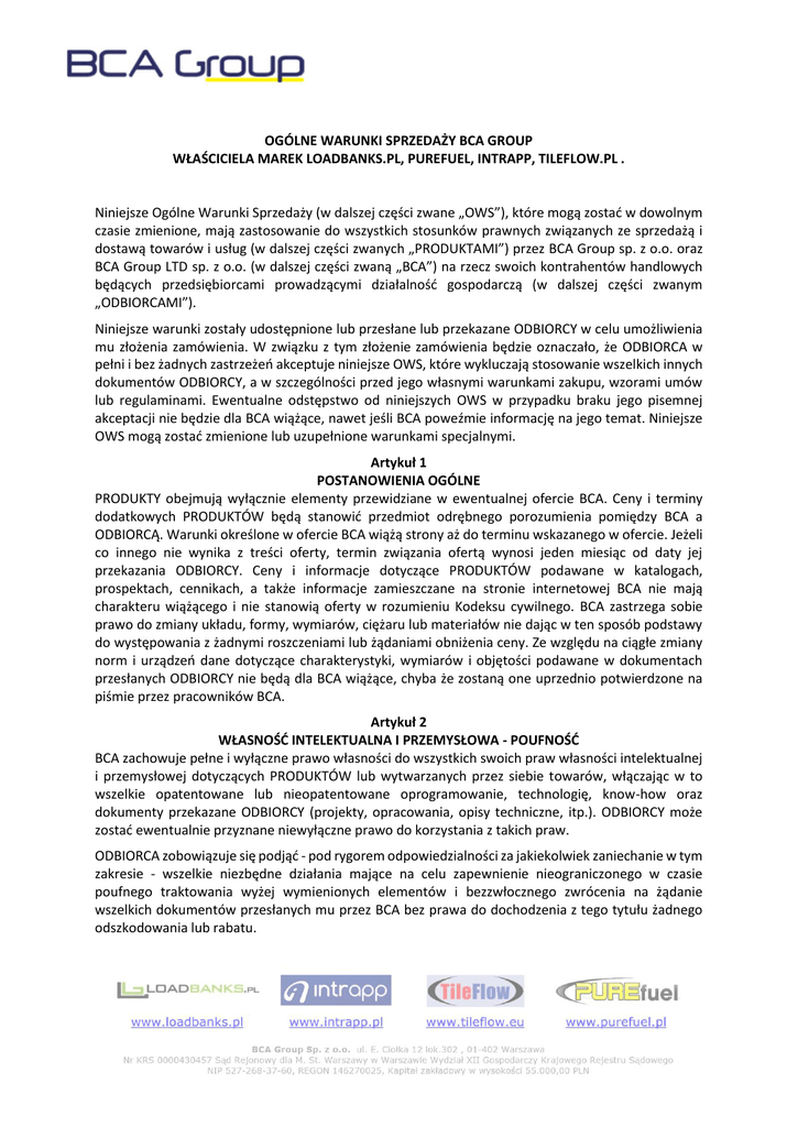 OGÓLNE WARUNKI SPRZEDAŻY BCA GROUP WŁAŚCICIELA MAREK LOADBANKS.PL, PUREFUEL, INTRAPP, TILEFLOW.PL . Niniejsze Ogólne Warunki Sprzedaży (w dalszej części zwane „OWS”), które mogą zostać w dowolnym czasie zmienione, mają zastosowanie do wszystkich stosunków prawnych związanych ze sprzedażą i dostawą towarów i usług (w dalszej części zwanych „PRODUKTAMI”) przez BCA Group sp. z o.o. oraz BCA Group LTD sp. z o.o. (w dalszej części zwaną „BCA”) na rzecz swoich kontrahentów handlowych będących przedsiębiorcami prowadzącymi działalność gospodarczą (w dalszej części zwanym „ODBIORCAMI”). Niniejsze warunki zostały udostępnione lub przesłane lub przekazane ODBIORCY w celu umożliwienia mu złożenia zamówienia. W związku z tym złożenie zamówienia będzie oznaczało, że ODBIORCA w pełni i bez żadnych zastrzeżeń akceptuje niniejsze OWS, które wykluczają stosowanie wszelkich innych dokumentów ODBIORCY, a w szczególności przed jego własnymi warunkami zakupu, wzorami umów lub regulaminami. Ewentualne odstępstwo od niniejszych OWS w przypadku braku jego pisemnej akceptacji nie będzie dla BCA wiążące, nawet jeśli BCA poweźmie informację na jego temat. Niniejsze OWS mogą zostać zmienione lub uzupełnione warunkami specjalnymi. Artykuł 1 POSTANOWIENIA OGÓLNE PRODUKTY obejmują wyłącznie elementy przewidziane w ewentualnej ofercie BCA. Ceny i terminy dodatkowych PRODUKTÓW będą stanowić przedmiot odrębnego porozumienia pomiędzy BCA a ODBIORCĄ. Warunki określone w ofercie BCA wiążą strony aż do terminu wskazanego w ofercie. Jeżeli co innego nie wynika z treści oferty, termin związania ofertą wynosi jeden miesiąc od daty jej przekazania ODBIORCY. Ceny i informacje dotyczące PRODUKTÓW podawane w katalogach, prospektach, cennikach, a także informacje zamieszczane na stronie internetowej BCA nie mają charakteru wiążącego i nie stanowią oferty w rozumieniu Kodeksu cywilnego. BCA zastrzega sobie prawo do zmiany układu, formy, wymiarów, ciężaru lub materiałów nie dając w ten sposób podstawy do występowania z żadnymi roszczeniami lub żądaniami obniżenia ceny. Ze względu na ciągłe zmiany norm i urządzeń dane dotyczące charakterystyki, wymiarów i objętości podawane w dokumentach przesłanych ODBIORCY nie będą dla BCA wiążące, chyba że zostaną one uprzednio potwierdzone na piśmie przez pracowników BCA. Artykuł 2 WŁASNOŚĆ INTELEKTUALNA I PRZEMYSŁOWA - POUFNOŚĆ BCA zachowuje pełne i wyłączne prawo własności do wszystkich swoich praw własności intelektualnej i przemysłowej dotyczących PRODUKTÓW lub wytwarzanych przez siebie towarów, włączając w to wszelkie opatentowane lub nieopatentowane oprogramowanie, technologię, know-how oraz dokumenty przekazane ODBIORCY (projekty, opracowania, opisy techniczne, itp.). ODBIORCY może zostać ewentualnie przyznane niewyłączne prawo do korzystania z takich praw. ODBIORCA zobowiązuje się podjąć - pod rygorem odpowiedzialności za jakiekolwiek zaniechanie w tym zakresie - wszelkie niezbędne działania mające na celu zapewnienie nieograniczonego w czasie poufnego traktowania wyżej wymienionych elementów i bezzwłocznego zwrócenia na żądanie wszelkich dokumentów przesłanych mu przez BCA bez prawa do dochodzenia z tego tytułu żadnego odszkodowania lub rabatu. Artykuł 3 ZAMÓWIENIA Umowa sprzedaży, nawet w przypadku zaakceptowanego kosztorysu lub wcześniejszej oferty, zostaje zawarta po wyraźnym zaakceptowaniu przez BCA zamówienia złożonego przez ODBIORCĘ i otrzymaniu uzgodnionego przez BCA zabezpieczenia, a w każdym przypadku po dokonaniu dostawy. O rezygnacji z zamówienia ODBIORCA jest zobowiązany powiadomić BCA w wyłącznej formie listu poleconego za zwrotnym potwierdzeniem odbioru. Bez względu na powód takiej rezygnacji BCA może naliczyć ODBIORCY 50% wartości zamówienia powiększonej o podatek VAT, jeśli informację o rezygnacji otrzyma najpóźniej na 30 dni przed uzgodnionym terminem dostawy, i 80% plus VAT, jeśli informację o rezygnacji otrzyma na mniej niż 30 dni przed tym terminem. Artykuł 4 CENA Podane ceny są cenami netto. Wysokość cen została ustalona przy uwzględnieniu warunków ekonomicznych obowiązujących w dniu publikacji cennika lub przedłożenia oferty, dlatego też mogą one bez uprzedzenia ulec zmianie, tak by odzwierciedlać warunki ekonomiczne obowiązujące w dniu wystawienia faktury za PRODUKTY. Ponadto PRODUKTY zostaną zafakturowane ODBIORCY w oparciu o cennik obowiązujący w dniu dostawy lub ewentualnie w dniu wyraźnego potwierdzenia przyjęcia zamówienia przez BCA. Artykuł 5 WARUNKI PŁATNOŚCI Warunki płatności powinny zostać określone w ofercie. W braku takiego określenia zastosowanie będą miały następujące warunki: zaliczka w wysokości 50% całkowitej kwoty plus VAT przelewem bankowym w celu potwierdzenia zamówienia, a pozostałe 50% plus VAT przelewem bankowym po otrzymaniu zawiadomienia o gotowości do wysyłki w celu potwierdzenia zwolnienia wysyłki. Na zaliczkę w wysokości 50% plus VAT BCA wystawi fakturę, która zostanie rozliczona po zapłaceniu reszty i zastąpiona fakturą handlową wystawioną na całą kwotę. Z tytułu dokonania płatności z góry nie będą udzielane żadne rabaty. Terminy płatności nie mogą być z żadnego powodu przedłużane lub zmieniane. Wpłacane przez ODBIORCĘ kwoty będą zaliczane według uznania BCA, w szczególności zaś BCA może zaliczyć je kolejno na pokrycie odsetek oraz najstarszych zobowiązań ODBIORCY. Artykuł 6 DOSTAWA I PRZECHOWYWANIE O ile nie uzgodniono inaczej, wydanie PRODUKTÓW nastąpi na terenie biur lub magazynów BCA poprzez przekazanie ich do rąk własnych ODBIORCY albo poprzez doręczenie zawiadomienia o możliwości odbioru albo poprzez przekazanie wskazanemu przez ODBIORCĘ przewoźnikowi, a w razie niewskazania takiej firmy, przewoźnikowi wybranemu przez BCA. Za