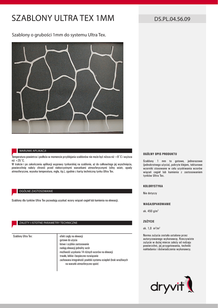 SZABLONY ULTRA TEX 1MM DS.PL.04.56.09 Szablony o grubości 1mm do systemu Ultra Tex. WARUNKI APLIKACJI Temperatura powietrza i podłoża w momencie przyklejania szablonów nie może być niższa niż +8˚C i wyższa niż +25˚C. W trakcie i po zakończeniu aplikacji wyprawy tynkarskiej na szablonie, aż do całkowitego jej wyschnięcia, powierzchnię należy chronić przed niekorzystnymi warunkami atmosferycznymi (silny wiatr, opady atmosferyczne, wysoka temperatura, mgła, itp.), zgodnie z kartą techniczną tynku Ultra Tex. OGÓLNY OPIS PRODUKTU Szablony 1 mm to gotowe, jednorazowe (jednokrotnego użycia), pokryte klejem, tekturowe wzorniki stosowane w celu uzyskiwania wzorów wiązań cegieł lub kamienia z zastosowaniem tynków Ultra Tex. KOLORYSTYKA OGÓLNE ZASTOSOWANIE Nie dotyczy Szablony dla tynków Ultra Tex pozwalają uzyskać wzory wiązań cegieł lub kamienia na elewacji. WAGA/OPAKOWANIE ok. 450 g/m2 ZALETY I ISTOTNE PARAMETRY TECHNICZNE ZUŻYCIE ok. 1,0 m2/m2 Szablony Ultra Tex: - efekt cegły na elewacji - gotowe do użycia - łatwe i szybkie zastosowanie - nadają elewacji jednolity wzór - możliwość uzyskania 14 różnych wzorów na elewacji - trwałe, lekkie i bezpieczne rozwiązanie - zachowana integralność powłoki systemu ociepleń (brak wrażliwych na warunki atmosferyczne spoin) Norma zużycia została ustalona przez autoryzowanego wykonawcę. Rzeczywiste zużycie w dużej mierze zależy od rodzaju powierzchni, jej przygotowania, techniki nakładania i doświadczenia wykonawcy. SZABLONY ULTRA TEX 1MM DS.PL.04.56.09 Szablony o grubości 1mm do systemu Ultra Tex. PRZYGOTOWANIE PODŁOŻA Powierzchnia powinna być gładka, czysta, sucha, dobrze związana, wolna od nalotów, wykwitów, tłustych plam i innych środków utrudniających aplikację. Odpowiednio związaną i oczyszczoną powierzchnię warstwy bazowej należy pomalować dwukrotnie farbą podkładową Ultra Tex PG zgodnie z kartą techniczną produktu. Po wyschnięciu farby podkładowej można przystąpić do przyklejania szablonów o wybranym wzorze. WARUNKI I CZAS PRZECHOWYWANIA Przechowywać w pozycji horyzontalnej w ciepłych i suchych pomieszczeniach, w zamkniętych, oryginalnych kartonach, nie dłużej niż 6 miesięcy. Szablony chronić przed wilgocią, uszkodzeniami oraz bezpośrednim wpływem promieniowania słonecznego. CZAS SCHNIĘCIA RZYGOTOWANIE MATERIAŁU DO UŻYCIA Produkt gotowy do użycia. Przed przyklejaniem z szablonów należy usunąć zabezpieczającą folię ochronną. Nie dotyczy. KONSERWACJA Nie dotyczy. SPOSÓB UŻYCIA/APLIKACJI Przed naklejeniem szablonów konieczne jest bardzo dokładne oznaczenie poziomu tak, by móc wypoziomować sam szablon. Układanie szablonów należy zaczynać od krawędzi ścian. Rozmiary szablonów zależą od wzoru i są opisane na końcu karty technicznej. 1) Na powierzchni ściany w odległości równej wielokrotności szerokości szablonu (mierząc od górnej krawędzi), należy zaznaczyć punkt najbliższy środka ozdabianej powierzchni. 2) Następnie za pomocą poziomicy wykreślić poziomą linię (linia ta będzie linią poziomu). 3) Następnie przez punkt najbliższy środka ściany (mierząc od bocznej krawędzi ściany wzdłuż linii poziomu), a odległy o wielokrotność długości szablonu wykreślić linię pionową (linia ta będzie linią pionu). 4) Przed przyklejaniem szablonów należy sprawdzić prostopadłość wykreślonych linii. 5) Przyklejanie szablonów należy wykonać bardzo dokładnie, silnie dociskając, przy pomocy pacy stalowej o zaokrąglonych krawędziach. Należy unikać rozciągania szablonu, gdyż prowadzi to do zgubienia linii podziałów i zniekształcenia całego wzoru. Zwrócić szczególną uwagę podczas przyklejania sąsiednich szablonów do już zamocowanych. Szablony łączymy na styk, do czoła. Miejsca łączenia koniecznie zabezpieczyć kawałkami taśmy ochronnej aby uniknąć zabrudzeń wzoru I fugi. 6) Po przyklejeniu szablonów Ultra Tex tynki nakładać zgodnie z kartą techniczną odpowiedniego produktu. 7) Na powierzchni elewacji przyklejamy tylko taką ilość m2 szablonu, na której jesteśmy w stanie nałożyć tynk Ultra Tex Szablony usuwamy dopiero po całkowitym wyschnięciu tynku. Odrywanie powinno nastąpić z całej szerokości szablonu, delikatnie i stopniowo. Zrywanie szablonów należy zapoczątkować zerwaniem jednego szablonu, w celu oceny wyschnięcia tynku. UWAGA: Określenie pionu/poziomu ścian nie dotyczy aplikacji szablonu American Flagstone. DOSTĘPNE WZORY • • • • • • • • • Cegła wiązanie wozówkowe Cegła wiązanie kowadełkowe Cegła wiązanie krzyżowe Cegła wiązanie krzyżowe podwójne Cegła opaska Baltimore Brick – Stara cegła American Flagstone Płytka 29cm x 7cm | 22cm x 22cm | 40cm x 40cm Pasek 10mm | 20mm Powyższe informacje są zgodne ze specyfikacjami odnośnie instalacji systemów Dryvit i są przedstawione w dobrej wierze. Dryvit nie ponosi odpowiedzialności za prace projektanta i wykonawcy. W celu upewnienia się, że korzystają Państwo z najnowszych informacji, prosimy o kontakt z naszą firmą. Karta techniczna numer DS.56.04.4809 zastępuje kartę techniczną numer DS.09.04.4803 DRYVIT SYSTEMS USA (EUROPE) PAŹDZIERNIK ‘2016 DOPUSZCZENIE DO ZASTOSOWANIA Produkt dopuszczony do sprzedaży na terenie RP.