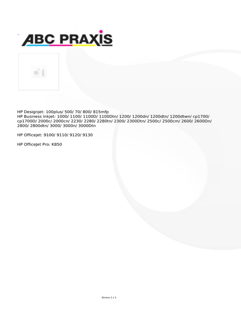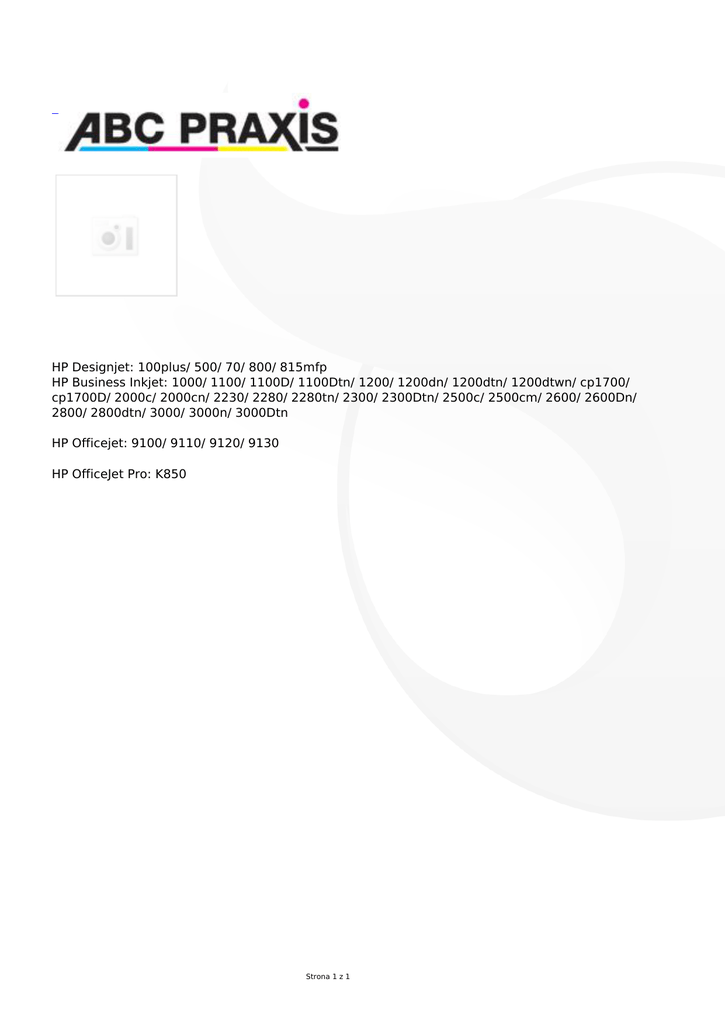 HP Designjet: 100plus/ 500/ 70/ 800/ 815mfp HP Business Inkjet: 1000/ 1100/ 1100D/ 1100Dtn/ 1200/ 1200dn/ 1200dtn/ 1200dtwn/ cp1700/ cp1700D/ 2000c/ 2000cn/ 2230/ 2280/ 2280tn/ 2300/ 2300Dtn/ 2500c/ 2500cm/ 2600/ 2600Dn/ 2800/ 2800dtn/ 3000/ 3000n/ 3000Dtn HP Officejet: 9100/ 9110/ 9120/ 9130 HP OfficeJet Pro: K850 Strona 1 z 1