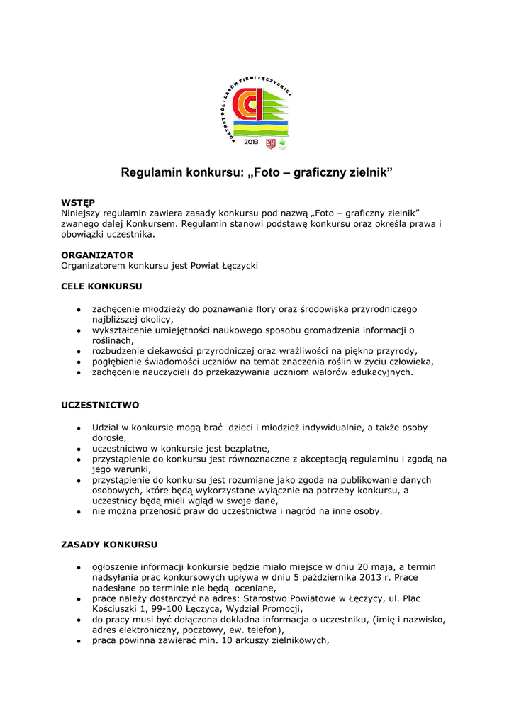 Regulamin konkursu: „Foto – graficzny zielnik” WSTĘP Niniejszy regulamin zawiera zasady konkursu pod nazwą „Foto – graficzny zielnik” zwanego dalej Konkursem. Regulamin stanowi podstawę konkursu oraz określa prawa i obowiązki uczestnika. ORGANIZATOR Organizatorem konkursu jest Powiat Łęczycki CELE KONKURSU zachęcenie młodzieży do poznawania flory oraz środowiska przyrodniczego najbliższej okolicy, wykształcenie umiejętności naukowego sposobu gromadzenia informacji o roślinach, rozbudzenie ciekawości przyrodniczej oraz wrażliwości na piękno przyrody, pogłębienie świadomości uczniów na temat znaczenia roślin w życiu człowieka, zachęcenie nauczycieli do przekazywania uczniom walorów edukacyjnych. UCZESTNICTWO Udział w konkursie mogą brać dzieci i młodzież indywidualnie, a także osoby dorosłe, uczestnictwo w konkursie jest bezpłatne, przystąpienie do konkursu jest równoznaczne z akceptacją regulaminu i zgodą na jego warunki, przystąpienie do konkursu jest rozumiane jako zgoda na publikowanie danych osobowych, które będą wykorzystane wyłącznie na potrzeby konkursu, a uczestnicy będą mieli wgląd w swoje dane, nie można przenosić praw do uczestnictwa i nagród na inne osoby. ZASADY KONKURSU ogłoszenie informacji konkursie będzie miało miejsce w dniu 20 maja, a termin nadsyłania prac konkursowych upływa w dniu 5 października 2013 r. Prace nadesłane po terminie nie będą oceniane, prace należy dostarczyć na adres: Starostwo Powiatowe w Łęczycy, ul. Plac Kościuszki 1, 99-100 Łęczyca, Wydział Promocji, do pracy musi być dołączona dokładna informacja o uczestniku, (imię i nazwisko, adres elektroniczny, pocztowy, ew. telefon), praca powinna zawierać min. 10 arkuszy zielnikowych, arkusz zielnikowy (np. z kartonu, brystolu) musi mieć w przybliżeniu format A3 (ok. 30cm x 42cm), w pracy można wykorzystywać własnoręcznie wykonane rysunki, suszone rośliny, zdjęcia, każda roślina winna być opisana poprzez podanie jej nazwy gatunkowej, wskazane jest podanie miejsca zebrania egzemplarza rośliny, nadesłane prace nie będą odsyłane do autorów, podczas wykonywania zielnika nie wolno zrywać: a) roślin chronionych i zagrożonych wyginięciem, b) żadnych roślin rosnących w parkach narodowych i rezerwatach przyrody, c) roślin ze stanowisk, gdzie znajduje się jeden lub jedynie kilka egzemplarzy danego gatunku i zbiór może istotnie wpłynąć na ich populację; opis prawidłowego sposobu zbioru i wykonania arkusza zielnikowego można znaleźć m.in. w książce Jacka Drobnika pt.: „Zielnik i zielnikoznawstwo”, Wydawnictwo PWN, Warszawa 2007. itp. Organizator zastrzega sobie prawa do zachowania i nieodpłatnego wykorzystania prac konkursowych, Organizator nie bierze odpowiedzialności za uszkodzenia powstałe w czasie transportu, wyniki konkursu zostaną ogłoszone do 31 października 2013 r. na stronie internetowej www.leczyca.pl. KRYTERIA OCENY prace oceniać będzie komisja konkursowa, powołana przez organizatora ocenie podlega : 1. Poprawność zbioru (kompletność: w przypadku małych gatunków jednorocznych całe rośliny, byliny - dopuszczony brak korzenia, w przypadku dużych okazów właściwy wybór części rośliny). 2. Staranność (dbałość o rozłożenie pędów, liści, kwiatów, by w miarę możliwości nie były pozaginane i nie zasłaniały się wzajemnie) i jakość zasuszenia (Jest to najistotniejsze kryterium oceny). 3. Poprawność oznaczenia gatunku. 4. Etykieta zielnikowa (czytelność, obecność podstawowych danych, dokładność opisu). 5. Estetyka wykonania arkusza zielnikowego. 6. Przestrzeganie prawa (prace z gatunkami chronionymi/z parków narodowych itp. będą dyskwalifikowane). NAGRODY autorzy wszystkich nadesłanych prac zostaną wymienieni na stronie internetowej www.leczycki.pl wraz z prezentacją najlepiej wykonanych przez nich arkuszy zielnikowych, zwycięzcy najlepiej ocenionych trzech zielników otrzymają nagrody rzeczowe, współfinansowane ze środków Wojewódzkiego Funduszu Ochrony Środowiska i Gospodarki Wodnej w Łodzi, przesłany materiał może być także opublikowany w materiałach promocyjnych Starostwa Powiatowego w Łęczycy, nagrody zostaną przekazane podczas obchodów Hubertusa Łęczyckiego w dniu 12 października 2013 roku. Projekt: „Portret pól i lasów Ziemi Łęczyckiej, jako forma edukacji ekologicznej mieszkańców Powiatu Łęczyckiego” jest współfinansowany ze środków Wojewódzkiego Funduszu Ochrony Środowiska i Gospodarki Wodnej w Łodzi.