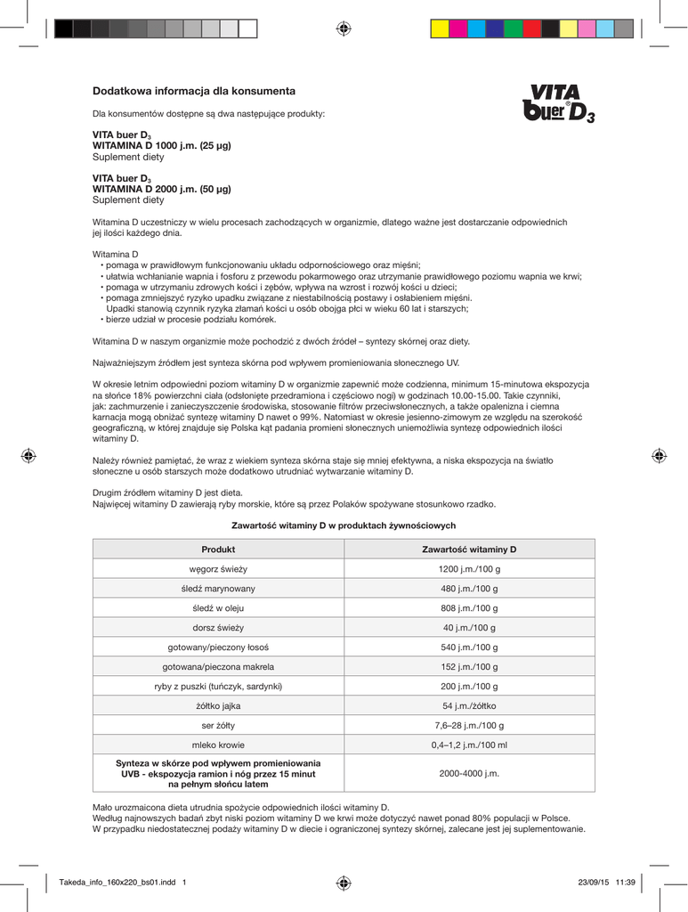 Dodatkowa informacja dla konsumenta Dla konsumentów dostępne są dwa następujące produkty: VITA buer D3 WITAMINA D 1000 j.m. (25 µg) Suplement diety VITA buer D3 WITAMINA D 2000 j.m. (50 µg) Suplement diety Witamina D uczestniczy w wielu procesach zachodzących w organizmie, dlatego ważne jest dostarczanie odpowiednich jej ilości każdego dnia. Witamina D • pomaga w prawidłowym funkcjonowaniu układu odpornościowego oraz mięśni; • ułatwia wchłanianie wapnia i fosforu z przewodu pokarmowego oraz utrzymanie prawidłowego poziomu wapnia we krwi; • pomaga w utrzymaniu zdrowych kości i zębów, wpływa na wzrost i rozwój kości u dzieci; • pomaga zmniejszyć ryzyko upadku związane z niestabilnością postawy i osłabieniem mięśni. Upadki stanowią czynnik ryzyka złamań kości u osób obojga płci w wieku 60 lat i starszych; • bierze udział w procesie podziału komórek. Witamina D w naszym organizmie może pochodzić z dwóch źródeł – syntezy skórnej oraz diety. Najważniejszym źródłem jest synteza skórna pod wpływem promieniowania słonecznego UV. W okresie letnim odpowiedni poziom witaminy D w organizmie zapewnić może codzienna, minimum 15-minutowa ekspozycja na słońce 18% powierzchni ciała (odsłonięte przedramiona i częściowo nogi) w godzinach 10.00-15.00. Takie czynniki, jak: zachmurzenie i zanieczyszczenie środowiska, stosowanie filtrów przeciwsłonecznych, a także opalenizna i ciemna karnacja mogą obniżać syntezę witaminy D nawet o 99%. Natomiast w okresie jesienno-zimowym ze względu na szerokość geograficzną, w której znajduje się Polska kąt padania promieni słonecznych uniemożliwia syntezę odpowiednich ilości witaminy D. Należy również pamiętać, że wraz z wiekiem synteza skórna staje się mniej efektywna, a niska ekspozycja na światło słoneczne u osób starszych może dodatkowo utrudniać wytwarzanie witaminy D. Drugim źródłem witaminy D jest dieta. Najwięcej witaminy D zawierają ryby morskie, które są przez Polaków spożywane stosunkowo rzadko. Zawartość witaminy D w produktach żywnościowych Produkt Zawartość witaminy D węgorz świeży 1200 j.m./100 g śledź marynowany 480 j.m./100 g śledź w oleju 808 j.m./100 g dorsz świeży 40 j.m./100 g gotowany/pieczony łosoś 540 j.m./100 g gotowana/pieczona makrela 152 j.m./100 g ryby z puszki (tuńczyk, sardynki) 200 j.m./100 g żółtko jajka 54 j.m./żółtko ser żółty 7,6–28 j.m./100 g mleko krowie 0,4–1,2 j.m./100 ml Synteza w skórze pod wpływem promieniowania UVB - ekspozycja ramion i nóg przez 15 minut na pełnym słońcu latem 2000-4000 j.m. Mało urozmaicona dieta utrudnia spożycie odpowiednich ilości witaminy D. Według najnowszych badań zbyt niski poziom witaminy D we krwi może dotyczyć nawet ponad 80% populacji w Polsce. W przypadku niedostatecznej podaży witaminy D w diecie i ograniczonej syntezy skórnej, zalecane jest jej suplementowanie. Takeda_info_160x220_bs01.indd 1 23/09/15 11:39 Rekomendowana suplementacja witaminą D (wg źródła nr 1): Grupa wiekowa Ilość Okres suplementacji Młodzież 600-1000 j.m. / dobę, zależnie od masy ciała W miesiącach od września do kwietnia lub przez cały rok, jeśli nie jest zapewniona synteza skórna witaminy D latem. Dorośli 800-2000 j.m. / dobę, zależnie od masy ciała W miesiącach od września do kwietnia lub przez cały rok, jeśli nie jest zapewniona synteza skórna witaminy D latem. Seniorzy (powyżej 65 lat) 800-2000 j.m. / dobę, zależnie od masy ciała Cały rok Kobiety w ciąży 1500-2000 j.m. / dobę Suplementacja w takiej dawce powinna rozpocząć się nie później niż od drugiego trymestru ciąży. Suplementację można rozpocząć tylko po konsultacji z lekarzem. Młodzież otyła W miesiącach od września do kwietnia 1200-2000 j.m. / dobę, zależnie od stopnia otyłości lub przez cały rok, jeśli nie jest zapewniona synteza skórna witaminy D latem. Dorośli otyli 1600-4000 j.m. / dobę, zależnie od stopnia otyłości Cały rok Pracownicy nocnych zmian oraz ciemnoskóre 1000-2000 j.m. / dobę, zależnie od masy ciała osoby dorosłe Cały rok Zalecane spożycie suplementu Vita buer D3: Dorośli i młodzież: zgodnie z informacją podaną na opakowaniu. Składniki: Olej słonecznikowy, żelatyna wieprzowa, substancja utrzymująca wilgoć (glicerol), witamina D (cholekalcyferol). Preparat może być stosowany przez osoby chore na cukrzycę. Nie należy przekraczać zalecanej porcji do spożycia w ciągu dnia podanej na opakowaniu. Nie stosować w przypadku uczulenia na któryś ze składników preparatu. Preparat nie może być stosowany jako substytut zróżnicowanej diety. Prowadzenie zdrowego trybu życia i stosowanie zrównoważonej, zróżnicowanej diety są niezbędne dla zachowania dobrego stanu zdrowia. Przechowywanie: Przechowywać w temperaturze pokojowej, w szczelnie zamkniętym opakowaniu, w sposób niedostępny dla małych dzieci. Nie zamrażać. Chronić przed światłem. Wyprodukowano w Polsce dla: Takeda Pharma Sp. z o.o. Al. Jerozolimskie 146 A, 02-305 Warszawa Źródła: 1. „Wytyczne suplementacji witaminą D dla Europy Środkowej – rekomendowane dawki witaminy D dla populacji zdrowej oraz dla grup ryzyka deficytu witaminy D” P. Płudowski i wsp. Endokrynologia Polska 2013; 64 (4): 319-327. 2. „Nowe spojrzenie na suplementację witaminą D.” Płudowski P., Karczmarewicz E., Czech-Kowalska J. i wsp. Standardy Medyczne 2009, 1, 6, 23-41. Takeda_info_160x220_bs01.indd 2 23/09/15 11:39