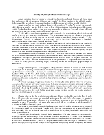 1 Zasady latynizacji alfabetu ormiańskiego Język ormiański (nazwa własna w polskiej transkrypcji popularnej: hajeren lub hajoc lezu) jest izolowanym (tj. nie mającym bliższego „krewniaka”) językiem należącym do wielkiej rodziny indoeuropejskiej na podobnych zasadach jak inne języki izolowane tej rodziny: grecki, albański. Język ormiański ma ciągłą tradycję literacką od początków V wieku. W postaci staroormiańskiej, jako tzw. grabar, jest do dziś używany w liturgii Ormiańskiego Kościoła Apostolskiego oraz wśród Ormian katolików (unitów). Jest notowany oryginalnym alfabetem (kierunek pisma: od lewej do prawej) opracowanym przez mnicha Mesropa Masztoca. W XIX wieku powstały dwa warianty współczesnego języka ormiańskiego, dla odróżnienia od grabaru łącznie nazywane aszchar(h)abarem. Oba są notowane tym samym alfabetem powstałym w V wieku. Wariant wschodni powstał na terenach należących do Rosji (główne ośrodki: Tyflis, Eczmiadzyn, Erywań), a zachodni – w ówczesnej stolicy Imperium Osmańskiego – Stambule (większość terenów historycznej Armenii należy do Turcji). Oba warianty, zwane odpowiednio językiem wschodnio- i zachodnioormiańskim, różnią się znacznie nie tylko strukturą gramatyczną, ale – co w kwestiach transkrypcji jest szczególnie istotne – fonetyką. Ponieważ jedynie na terenie Armenii (oraz nie uznawanego przez żadne państwo świata Górskiego Karabachu) język ormiański ma rangę języka oficjalnego, tylko wariant używany na tym obszarze (a więc wschodni) jest przedmiotem niniejszego opracowania. Językiem (wschodnio)ormiańskim mówi około 3 milionów mieszkańców Armenii oraz trudna do oszacowania liczba Ormian mieszkających w Iranie oraz Rosji. Znaczna liczba (do kilku milionów) emigrantów mówiących językiem zachodnioormiańskim mieszka m.in. w krajach arabskich, na Bałkanach, we Francji i Stanach Zjednoczonych. W dużym stopniu są to potomkowie uciekinierów z Turcji, w której podczas pierwszej wojny światowej doszło do ludobójstwa popełnionego na Ormianach. Uwaga terminologiczna. Ze względu na długą obecność Ormian w Polsce (od XIV wieku) wytworzyła się w polskiej nomenklaturze pewna dwoistość (por. artykuł: A. Pisowicz, Polish names of Armenians: Ormiańczyk … Kabzan, w czasopiśmie „Studia Etymologica Cracoviensia”, vol. 5, Kraków 2000, str. 91-95). Obok nazwy etnicznej Armeńczyk (stosowanej jeszcze przez Juliusza Słowackiego) pojawił się w polszczyźnie nowszy termin Ormianin o tym samym, z grubsza, znaczeniu. Chodzi o naród, który sam siebie określa terminem Haj, a swą ojczyznę nazywa: Hajastan (= Armenia). Podobnie występują w języku polskim dwie równoległe formy przymiotnikowe: armeński, ormiański. Pierwsza jest używana w odniesieniu do terenu historycznej Armenii (znacznie większego niż obecna Republika Armenii), albo w wyrażeniach: parlament armeński, armia armeńska. Druga natomiast odnosi się do narodu, z obszerną diasporą włącznie, np. Ormiański Kościół Apostolski, katedra Ormiańska (we Lwowie). Także język tego narodu przyjęto określać po polsku terminem: język ormiański (rzadziej: armeński). Zasady pisowni języka wschodnioormiańskiego. Pismo ormiańskie rozróżnia duże i małe litery. Ich używanie jest oparte na zasadach podobnych do tych, które obowiązują w językach europejskich. A więc np. nazwy własne, w tym geograficzne, notowane są przy użyciu dużej litery na początku wyrazu. W druku litery nie są ze sobą łączone (tak jak np. częściowo w piśmie arabskim), z jednym wyjątkiem (ligatura և – ev). Interpunkcja ormiańska jest oryginalna i mocno się różni od znaków używanych w większości języków europejskich, np. dwukropek i kropka mają odwrotne zastosowanie niż w ortografii polskiej czy angielskiej. Nie ma to jednak znaczenia w odniesieniu do latynizacji ormiańskich (armeńskich) nazw geograficznych. Po sowietyzacji wschodniej Armenii, która nastąpiła w 1920 roku, stosowana tam ortografia, używająca pisma opracowanego przez Mesropa Masztoca na początku V wieku, była dwukrotnie reformowana. Chodziło o uproszczenie elementów historycznej ortografii nie zmienianej od V wieku. Co ciekawe, pierwsza reforma (z roku 1922) była bardziej radykalna niż druga (z 1940 roku), która pewne decyzje pierwszej niejako cofnęła w stronę pisowni tradycyjnej, zwanej klasyczną. Ale żadna 2 z tych reform nie wprowadzała ortografii czysto fonetycznej, w której każdej głosce języka odpowiadałaby stale ta sama litera. Obecnie, w niepodległej Armenii są czynione starania o przywrócenie ortografii klasycznej z V wieku. Mają one jednak charakter ograniczony do pewnych konserwatywnych kręgów. Archaiczna pisownia klasyczna jest nadal stosowana w odniesieniu do języka wschodnioormiańskiego używanego w Iranie. Stosuje ją także do notowania języka zachodnioormiańskiego diaspora ormiańska (armeńska) na Bliskim Wschodzie, w południowej i zachodniej Europie, w Stanach Zjednoczonych i Australii. Aktualnie stosowana przez Ormian w Armenii, Rosji, na Ukrainie i Białorusi (w środowiskach najnowszej fali emigracyjnej zapoczątkowanej upadkiem ZSRR w 1991 roku), a także w Górskim Karabachu, bazuje na reformie z 1940 roku. Reforma ta głównie odnosi się do samogłosek i dyftongoidów. Nie uwzględnia natomiast zmian w wymowie, jakie nastąpiły w ciągu wieków na skutek procesów fonetycznych zwanych „przesuwkami spółgłoskowymi”. Dotyczy to także nazewnictwa geograficznego – np. nazwa miejscowości w Armenii pisana Վարդենիս (w transliteracji BGN/PCGN: Vardenis) jest wymawiana Wartenis (z przydechowym t nie odróżnianym przez uproszczoną polską transkrypcję popularną od zwykłego t), a nie *Wardenis. Ortografia ormiańska (zarówno zreformowana jak i klasyczna) tylko w niektórych wypadkach oddaje na piśmie zredukowaną samogłoskę ə, co stanowi proble