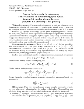 XLII KZM ZAKOPANE 2013 Mieczysław Gruda, Włodzimierz Rembisz IERiGŻ – PIB, Warszawa E-mail: [email protected] Proces dochodzenia do równowag i ich stabilność na konkurencyjnym rynku. Zależności między dynamiką cen, popytem na produkty i ich podażą Wstęp. Równowaga od lat pozostaje niezmiennie w centrum zainteresowania ekonomistów zajmujących matematyczną teorią rynku Model, który przedstawimy tutaj jest pewnym rozszerzeniem modelu przedstawionego przez K. J. Arrowa i L. Hurwicza [1]. Opisuje on sytuację, gdy na rynek przybywają ludzie z towarami, który mają sprzedać, by za uzyskany dochód nabyć inne potrzebne im towary. Dynamika cen w modelu uwzględnia wpływ popytu oraz podaży na dobra substytucyjne oraz komplementarne na rynku. Celem pracy jest proces dochodzenia do równowag (poziom cen i poziom równowag podażowo-popytowych) oraz warunki stabilności modelu oraz stabilności asymptotycznej. Sformułowanie problemu. Niech y k = (y1k , y2k , . . . , ynk ) będzie koszykiem dóbr dostarczonych na rynek przez k-tego producenta, a x k = (xk1 , xk2 , . . . , xkn ) koszykiem dóbr, które chce nabyć. Przez p = (p1 , p2 , . . . , pn ) oznaczmy wektor cen towarów. Każdy z handlowców przy wyborze koszyka x k kieruje się swymi preferencjami, rozwiązując zadanie optymalizacyjne: Znaleźć max funkcji użyteczności uk (x) przy zadanych warunkach brzegowych (p, x) ≤ (p, y k ) = I k (p) dla x ≥ 0. Zredukowaną funkcję popytu definiujemy jako X k k k k pi yi = f k (p). ϕ (p, I (p)) = ϕ p, (1) (2) i Z kolei funkcję nadwyżkowego popytu jako m m m m X X X X k k k yk . f (p) − y = x − z(p) = k=1 k=1 k=1 (3) k=1 Reguła dynamiki cen obowiązująca na rynku opisana jest układem równań różniczkowych dp(t) X = z(p(t)). (4) dt Równowaga. Przy ww. sformułowaniu rynku towarów powstanie pytanie, czy ceny równowag i odpowiadające im podaże będą istniały. Wprowadźmy trzy założenia, które pozwolą na udowodnienie twierdzenia o istnieniu równowagi. I. Funkcje f k są ciągłe i różniczkowalne na Rn+ \ {0}. Praktycznie wystarczy słabsze założenie, na przykład, że f k ∈ C 1 (int Rn+ → Rn+ ) oraz fik (p) → +∞ XLII KZM ZAKOPANE 2013 przy pi → 0. Przy tak postawionym warunku znacznie komplikuje się dowód twierdzenia o istnieniu równowagi. II. Popyt na towar oferowany za darmo lub po niskich cenach zawsze przekracza jego podaż. ∂zi spełnia warunek dla każdego λ ∈ Rn \ III. Macierz funkcyjna J (p) = ∂p j (n,n) (Rn+ ∪ Rn− ) oraz dla każdego p ∈ int P+n (1)(λJ (p)λT < 0), gdzie int P+n (1) = {p ∈ int Rn+ : kpk = 1}. (5) Warunek ten jest słabszy od ujemnej określoności macierzy J (p). Twierdzenie o istnieniu równowagi. Przy założeniach (I), (II) i (III) istnieje dokładnie jeden wektor równowagi rynkowej p > 0 określony z dokładnością do struktury (dowód: E. Panek, 2000). Równowaga konkurencyjna (definicja). Dany jest prywatny układ gospodarczy, w którym Xi jest zbiorem konsumentów, i — relacje preferencji, Yj — zbiór producentów, ωi — wektor czynników produkcji oraz macierz udziałów własnościowych θi1 , . . . , θij . Alokacja (x∗ , y ∗ ) oraz wektor cen p = (p1 , p2 , . . . , pn ) jest równowagą konkurencyjną (Walrasowską), jeżeli: 1. Dla każdego j, yj∗ maksymalizuje zyski producenta j na zbiorze produkcyjnym Yj przy danych cenach p. 2. Dla i, x∗i jest najlepszym dostępnym koszykiem dóbr p · xi ≤ p · ωi + P każdego θ · yj∗ . Pj ij P ∗ 3. i xi = ω̄ + j yj ∗ — alokacja jest możliwa do wyprodukowania przy danych zasobach (czynnikach). Stabilność stanu równowagi konkurencyjnej. Rynek nazywamy globalnie asymptotycznie stabilnym, jeżeli każda (p0 , ∞)-dopuszczalna trajektoria cen z wektorem p0 > 0 jest zbieżna do pewnego wektora cen p ∈ P = {λp̄ : λ > 0}, tzn. dla każdego p0 > 0 istnieje takie p ∈ P , że limt→∞ p(t) = p. Zakończenie. W opracowaniu zaproponowano modyfikację standardowego modelu Arrowa-Hurwicza ze zróżnicowaną dynamiką cen poszczególnych towarów oraz wprowadzono do modelu towary komplementarne oraz substytucyjne. Na dynamikę ceny towaru w omawianym modelu ma wpływ nie tylko popyt nadwyżkowy na konkretny towar, ale również popyt i podaż towarów do niego substytucyjnych oraz komplementarnych. Praca zawiera ocenę uwarunkowań stabilność, dowód stabilności (przytoczony) w sensie Lapunowa oraz stabilność asymptotyczną modelu. Zaprezentowane zostały aplikacje numeryczne. Literatura [1] K. J. Arrow, L. Hurwicz (1958), On the stability of the competitive equilibrium I, Econometrica, Nr 26. [2] M. Gruda (2011), Nowe równowagi produkcyjne w polskim sektorze rolniczym na tle tendencji unijnych i światowych (ujęcie modelowe), IERiGŻ-PIB, Nr 23. [3] L. W. McKenzie (2002), Classical General Equilibrium Theory, The MIT Press, Cambridge. [4] E. Panek (1997), Elementy ekonomii matematycznej. Równowaga i wzrost, PWN, Warszawa. [5] J. B. Shoven, J. Whalley (2003), Applying General Equilibrium, Cambridge University Press.