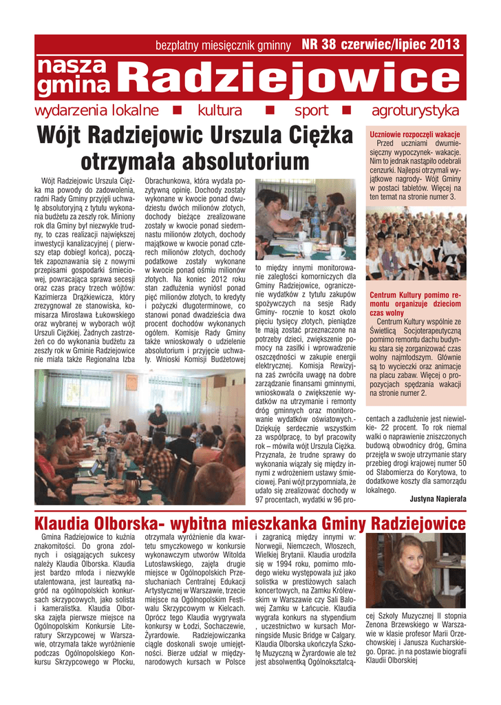 www.radziejowice.pl www.radziejowice.pl nasza gmina 1 1 bezpłatny miesięcznik gminny NR 31 wrzesień 2013 2012 38 czerwiec/lipiec bezpłatny miesięcznik gminny NR Radziejowice wydarzenia lokalne kultura sport Wójt Radziejowic Urszula Ciężka otrzymała absolutorium Wójt Radziejowic Urszula Ciężka ma powody do zadowolenia, radni Rady Gminy przyjęli uchwałę absolutoryjną z tytułu wykonania budżetu za zeszły rok. Miniony rok dla Gminy był niezwykle trudny, to czas realizacji największej inwestycji kanalizacyjnej ( pierwszy etap dobiegł końca), początek zapoznawania się z nowymi przepisami gospodarki śmieciowej, powracająca sprawa secesji oraz czas pracy trzech wójtów: Kazimierza Drążkiewicza, który zrezygnował ze stanowiska, komisarza Mirosława Łukowskiego oraz wybranej w wyborach wójt Urszuli Ciężkiej. Żadnych zastrzeżeń co do wykonania budżetu za zeszły rok w Gminie Radziejowice nie miała także Regionalna Izba Obrachunkowa, która wydała pozytywną opinię. Dochody zostały wykonane w kwocie ponad dwudziestu dwóch milionów złotych, dochody bieżące zrealizowane zostały w kwocie ponad siedemnastu milionów złotych, dochody majątkowe w kwocie ponad czterech milionów złotych, dochody podatkowe zostały wykonane w kwocie ponad ośmiu milionów złotych. Na koniec 2012 roku stan zadłużenia wyniósł ponad pięć milionów złotych, to kredyty i pożyczki długoterminowe, co stanowi ponad dwadzieścia dwa procent dochodów wykonanych ogółem. Komisje Rady Gminy także wnioskowały o udzielenie absolutorium i przyjęcie uchwały. Wnioski Komisji Budżetowej to między innymi monitorowanie zaległości komorniczych dla Gminy Radziejowice, ograniczenie wydatków z tytułu zakupów spożywczych na sesje Rady Gminy- rocznie to koszt około pięciu tysięcy złotych, pieniądze te mają zostać przeznaczone na potrzeby dzieci, zwiększenie pomocy na zasiłki i wprowadzenie oszczędności w zakupie energii elektrycznej. Komisja Rewizyjna zaś zwróciła uwagę na dobre zarządzanie finansami gminnymi, wnioskowała o zwiększenie wydatków na utrzymanie i remonty dróg gminnych oraz monitorowanie wydatków oświatowych.Dziękuję serdecznie wszystkim za współpracę, to był pracowity rok – mówiła wójt Urszula Ciężka. Przyznała, że trudne sprawy do wykonania wiązały się między innymi z wdrożeniem ustawy śmieciowej. Pani wójt przypomniała, że udało się zrealizować dochody w 97 procentach, wydatki w 96 pro- agroturystyka Uczniowie rozpoczęli wakacje Przed uczniami dwumiesięczny wypoczynek- wakacje. Nim to jednak nastąpiło odebrali cenzurki. Najlepsi otrzymali wyjątkowe nagrody- Wójt Gminy w postaci tabletów. Więcej na ten temat na stronie numer 3. Centrum Kultury pomimo remontu organizuje dzieciom czas wolny Centrum Kultury wspólnie ze Świetlicą Socjoterapeutyczną pomimo remontu dachu budynku stara się zorganizować czas wolny najmłodszym. Głównie są to wycieczki oraz animacje na placu zabaw. Więcej o propozycjach spędzania wakacji na stronie numer 2. centach a zadłużenie jest niewielkie- 22 procent. To rok niemal walki o naprawienie zniszczonych budową obwodnicy dróg, Gmina przejęła w swoje utrzymanie stary przebieg drogi krajowej numer 50 od Słabomierza do Korytowa, to dodatkowe koszty dla samorządu lokalnego. Justyna Napierała Klaudia Olborska- wybitna mieszkanka Gminy Radziejowice Gmina Radziejowice to kuźnia znakomitości. Do grona zdolnych i osiągających sukcesy należy Klaudia Olborska. Klaudia jest bardzo młoda i niezwykle utalentowana, jest laureatką nagród na ogólnopolskich konkursach skrzypcowych, jako solista i kameralistka. Klaudia Olborska zajęła pierwsze miejsce na Ogólnopolskim Konkursie Literatury Skrzypcowej w Warszawie, otrzymała także wyróżnienie podczas Ogólnopolskiego Konkursu Skrzypcowego w Płocku, otrzymała wyróżnienie dla kwartetu smyczkowego w konkursie wykonawczym utworów Witolda Lutosławskiego, zajęła drugie miejsce w Ogólnopolskich Przesłuchaniach Centralnej Edukacji Artystycznej w Warszawie, trzecie miejsce na Ogólnopolskim Festiwalu Skrzypcowym w Kielcach. Oprócz tego Klaudia wygrywała konkursy w Łodzi, Sochaczewie, Żyrardowie. Radziejowiczanka ciągle doskonali swoje umiejętności. Bierze udział w międzynarodowych kursach w Polsce i zagranicą między innymi w: Norwegii, Niemczech, Włoszech, Wielkiej Brytanii. Klaudia urodziła się w 1994 roku, pomimo młodego wieku występowała już jako solistka w prestiżowych salach koncertowych, na Zamku Królewskim w Warszawie czy Sali Balowej Zamku w Łańcucie. Klaudia wygrała konkurs na stypendium , uczestnictwo w kursach Morningside Music Bridge w Calgary. Klaudia Olborska ukończyła Szkołę Muzyczną w Żyrardowie ale też jest absolwentką Ogólnokształcą- cej Szkoły Muzycznej II stopnia Zenona Brzewskiego w Warszawie w klasie profesor Marii Orzechowskiej i Janusza Kucharskiego. Oprac. jn na postawie biografii Klaudii Olborskiej 2 www.radziejowice.pl Witam serdecznie w wakacyjny czas. Miło mi poinformować Państwa, że Gmina Radziejowice jest po sesji absolutoryjnej, radni podjęli uchwałę o przyznaniu absolutorium w tytułu wykonania budżetu za zeszły rok. Serdecznie Zajęcia wakacyjne Centrum Kultury i Świetlicy Socjoterapeutycznej W tym roku zajęcia wakacyjne dla dzieci zostały nieco okrojone, ponieważ w budynku GCK trwa remont dachu, wymogi bezpieczeństwa nie pozwalają na korzystanie z obiektu. Placówki zapraszają zatem 23 lipca na wycieczkę do warszawskiego Planetarium i ZOO, 6 sierpnia odbędzie się wycieczka do Centrum Nauki Kopernik dla dzieci w wieku od 5 do 10 lat, 14 sierpnia zaplanowana jest wycieczka do Planetarium i rejs statkiem po Wiśle dla dzieci w wieku 10 plus, 18 sierpnia na terenie placu zabaw przy Centrum Kultury w Radziejowicach odbędą się zabawy animacyjne, 27 sierpnia na zakończenie wakacji zaplanowana została wycieczka do Centrum Nauki K