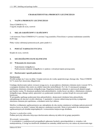 1.3.1 SPC, labelling and package leaflet CHARAKTERYSTYKA PRODUKTU LECZNICZEGO 1. NAZWA PRODUKTU LECZNICZEGO Timo-COMOD 0,5 % 5 mg/ml, krople do oczu, roztwór 2. SKŁAD JAKOŚCIOWY I ILOŚCIOWY 1 ml roztworu Timo-COMOD 0,5 % zawiera 5 mg tymololu (Timololum) w postaci maleinianu tymololu (6,84 mg). Pełny wykaz substancji pomocniczych, patrz punkt 6.1. 3. POSTAĆ FARMACEUTYCZNA Krople do oczu, roztwór. 4. SZCZEGÓŁOWE DANE KLINICZNE 4.1 Wskazania do stosowania 4.2 Nadciśnienie śródgałkowe Podwyższone ciśnienie śródgałkowe w jaskrze z otwartym kątem przesączania. Dawkowanie i sposób podawania Dawkowanie Zwykle podaje się 2 razy na dobę 1 kroplę roztworu do worka spojówkowego chorego oka. Timo-COMOD 0,5 % może być stosowany długotrwale. Ustalając dawkowanie należy zwracać uwagę na to, że początkowo obniżenie ciśnienia może wynosić 50 %, a następnie działanie leku może się osłabić (zjawisko tachyfilaksji). Po 3 do 12 miesiącach następuje stabilizacja obniżenia ciśnienia śródgałkowego. Regularna kontrola ciśnienia w pierwszych dniach terapii jest bardzo ważna. Po doustnym podaniu beta-adrenolityków, trzeba liczyć się także z obniżeniem ciśnienia śródgałkowego, dlatego należy sprawdzić czy podawanie tymololu w postaci kropli do oczu jest nadal konieczne. W przypadku ogólnego podawania beta-adrenolityków, skuteczność działania beta-adrenolityku zakraplanego do oka jest zwykle obniżona. U pacjentów z mocno zabarwioną tęczówką wystąpienie obniżenia ciśnienia jest opóźnione, a działanie może być słabsze. Możliwe wchłanianie ogólnoustrojowe po zakropleniu do oka można zmniejszyć uciskając palcem przewód nosowo-łzowy na około 2 minuty lub poprzez zamknięcie powieki. Może to prowadzić do zmniejszenia ogólnoustrojowych działań niepożądanych i wzmocnienia miejscowego działania. Pacjenci w podeszłym wieku Podane powyżej zalecenia dotyczące dawkowania odnoszą się także do tej grupy pacjentów. Wcześniaki i niemowlęta U wcześniaków w pojedynczych przypadkach zgłaszano bezdech, prawdopodobnie w związku z ich niedojrzałością. Z uwagi na możliwość działania na centralny układ nerwowy nie zaleca się stosowania tego Edition 02/2016 1.3.1 SPC, labelling and package leaflet produktu leczniczego u wcześniaków i niemowląt. W pewnych przypadkach stwierdzono, że stosowanie tymololu w postaci kropli do oczu u wcześniaków i niemowląt wywoływało wyraźnie większe stężenia tymololu w surowicy niż u dorosłych. Dlatego też należy dokonać dokładniej oceny stanu niemowląt przed rozpoczęciem leczenia tymololem, a także po rozpoczęciu leczenia i dokładnie obserwować je pod kątem wystąpienia objawów ogólnoustrojowej blokady receptorów beta-adrenergicznych. Dzieci i młodzież Ze względu na ograniczone dane stosowanie tymololu można zalecić jedynie w przypadku pierwotnej jaskry wrodzonej i pierwotnej jaskry młodzieńczej przez okres przejściowy, podczas którego pacjent oczekuje na decyzję dotyczącą leczenia operacyjnego oraz w przypadku niepowodzenia leczenia operacyjnego podczas oczekiwania na zastosowanie innych rodzajów leczenia. Dawkowanie: Lekarz powinien dokładnie rozważyć korzyści i zagrożenia związane z leczeniem tymololem u dzieci. Przed zastosowaniem tymololu należy zebrać szczegółowy wywiad pediatryczny i przeprowadzić szczegółowe badanie fizykalne w celu ustalenia ewentualnego występowania schorzeń układowych. Ze względu na ograniczoną ilość danych klinicznych nie można w chwili obecnej przedstawić żadnych konkretnych zaleceń dotyczących dawkowania (patrz punkt 5.1). Jeśli jednak korzyści przewyższają ryzyko, zaleca się stosowanie produktu leczniczego zawierającego najniższą dawkę substancji czynnej (0,1 %) raz na dobę. Jeśli dawka ta nie zapewnia wystarczającej kontroli ciśnienia wewnątrzgałkowego, należy rozważyć ostrożne zwiększanie dawkowania maksymalnie do dwóch kropli na dobę do zmienionego chorobowo oka. W przypadku podawania dwa razy na dobę należy zachować 12-godzinny odstęp pomiędzy kolejnymi dawkami. Ponadto przez godzinę lub dwie po podaniu pierwszej dawki należy uważnie obserwować pacjentów, szczególnie noworodki, w gabinecie lekarskim oraz ściśle monitorować pod kątem ewentualnych miejscowych i ogólnoustrojowych działań niepożądanych do chwili przeprowadzenia leczenia operacyjnego. W przypadku stosowania u dzieci stężenie substancji czynnej wynoszące 0,1 % powinno być wystarczające. Sposób podawania: W celu uniknięcia możliwych działań niepożądanych dawka jednorazowa powinna wynosić tylko jedną kroplę. Wchłanianie miejscowo podawanych beta-adrenolityków do krwioobiegu po wkropleniu leku można ograniczyć poprzez uciskanie przewodu nosowo-łzowego i jak najdłuższe trzymanie oczu zamkniętych (np. przez 3-5 minut). Nie dotykać zakraplaczem do oka, powieki, okolic oka lub innych powierzchni, ponieważ może to spowodować zakażenie zakraplacza. Patrz także punkty 4.4 i 5.2. Czas trwania leczenia: U dzieci i młodzieży tymolol stosuje się w leczeniu tymczasowym (patrz wyżej). 4.3 Przeciwwskazania Krople do oczu Timo-COMOD 0,5 % są przeciwwskazane u pacjentów z: - nadwrażliwością na substancję czynną lub na inne leki beta-adrenolityczne lub na którąkolwiek substancję pomocniczą, wymienioną w punkcie 6.1, - nadreaktywnością dróg oddechowych, w tym astmą oskrzelową występującą aktualnie lub w wywiadzie oraz ciężką przewlekłą obturacyjną chorobą płuc, - bradykardią zatokową, zespołem chorego węzła zatokowego, blokiem zatokowo-przedsionkowym, blokiem przedsionkowo-komorowym drugiego lub trzeciego stopnia niekontrolowanym przez rozrusznik, jawną niewydolnością serca, wstrząsem kardiogennym, - ciężkim alergicznym nieżytem nosa, - ze zwyrodnieniem rogówki. Edition 02/2016 1.3.1 SPC, labelling and package leaflet 4.4 Specjalne ost