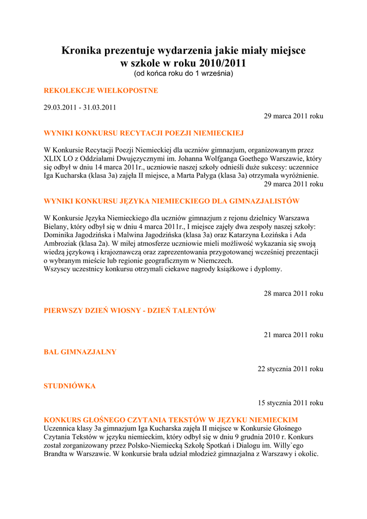 Kronika prezentuje wydarzenia jakie miały miejsce w szkole w roku 2010/2011 (od końca roku do 1 września) REKOLEKCJE WIELKOPOSTNE 29.03.2011 - 31.03.2011 29 marca 2011 roku WYNIKI KONKURSU RECYTACJI POEZJI NIEMIECKIEJ W Konkursie Recytacji Poezji Niemieckiej dla uczniów gimnazjum, organizowanym przez XLIX LO z Oddziałami Dwujęzycznymi im. Johanna Wolfganga Goethego Warszawie, który się odbył w dniu 14 marca 2011r., uczniowie naszej szkoły odnieśli duże sukcesy: uczennice Iga Kucharska (klasa 3a) zajęła II miejsce, a Marta Pałyga (klasa 3a) otrzymała wyróżnienie. 29 marca 2011 roku WYNIKI KONKURSU JĘZYKA NIEMIECKIEGO DLA GIMNAZJALISTÓW W Konkursie Języka Niemieckiego dla uczniów gimnazjum z rejonu dzielnicy Warszawa Bielany, który odbył się w dniu 4 marca 2011r., I miejsce zajęły dwa zespoły naszej szkoły: Dominika Jagodzińska i Malwina Jagodzińska (klasa 3a) oraz Katarzyna Łozińska i Ada Ambroziak (klasa 2a). W miłej atmosferze uczniowie mieli możliwość wykazania się swoją wiedzą językową i krajoznawczą oraz zaprezentowania przygotowanej wcześniej prezentacji o wybranym mieście lub regionie geograficznym w Niemczech. Wszyscy uczestnicy konkursu otrzymali ciekawe nagrody książkowe i dyplomy. 28 marca 2011 roku PIERWSZY DZIEŃ WIOSNY - DZIEŃ TALENTÓW 21 marca 2011 roku BAL GIMNAZJALNY 22 stycznia 2011 roku STUDNIÓWKA 15 stycznia 2011 roku KONKURS GŁOŚNEGO CZYTANIA TEKSTÓW W JĘZYKU NIEMIECKIM Uczennica klasy 3a gimnazjum Iga Kucharska zajęła II miejsce w Konkursie Głośnego Czytania Tekstów w języku niemieckim, który odbył się w dniu 9 grudnia 2010 r. Konkurs został zorganizowany przez Polsko-Niemiecką Szkołę Spotkań i Dialogu im. Willy`ego Brandta w Warszawie. W konkursie brała udział młodzież gimnazjalna z Warszawy i okolic. 4 stycznia 2011 roku WYNIKI WAKACYJNEGO KONKURSU FOTOGRAFICZNEGO Ogłaszamy wyniki 4 edycji wakacyjnego konkursu fotograficznego 2010/2011. Wernisaż i rozdanie nagród odbyły się 29 listopada w czytelni. Organizatorzy dziękują Radom Rodziców obu szkół za sfinansowanie nagród dla laureatów konkursu (tradycyjnie bony upominkowe do EMPiK-u). Zapraszamy do obejrzenia wystawy prac na szkolnym patio. Grand Prix “Za wysoki poziom wszystkich prac zgłoszonych do konkursu” Michał Stańczyk III d Kategoria : Magiczne miejsca 1. Barbara Grodzicka III d 2. Ada Miecznikowska 3d / Anna Skoneczna I c 3. Beata Lewandowska III a / Sebastian Czerwiński III d Kategoria : Kontrasty 1. Marta Stachura III c 2. Marcin Piwowar III c 3. Jan Śladowski 2 d Kategoria : My, Polacy 1. Michał Stańczyk III d Nagród za miejsca 2 i 3 nie przyznano K. Witkowska i M. Zygowska 13 grudnia 2010 roku SPOTKANIE Z JANKIEM MELĄ We wtorek 19 października 2010 odwiedził naszą szkołę Jasiek Mela. Spotkanie to odbyło się dzięki Radzie Rodziców naszego LO, a w szczególności pani Beaty Sternik, która było inicjatorką spotkania oraz dzięki przychylności Dyrekcji szkoły otwartej na wszelkie działania służące szkole. Jasiek ma 22 lata i ogrom życiowych bolesnych doświadczeń, o których nam opowiadał. Pożar domu rodzinnego, śmierć młodszego brata to wydarzenia, które naprawdę miały miejsce w jego życiu. Jasiek mówił o tych tragicznych wypadkach w sposób spokojny, szczery, a my słuchaliśmy jego wspomnień z niedowierzaniem. W 2002 r. w Malborku Jasiek stracił lewe podudzie i prawe przedramię w wyniku porażenia prądem. Do wypadku doszło w czasie burzy, gdy wszedł do niezabezpieczonej stacji transformatorowej, chcąc schronić się przed deszczem. Kiedy o tym opwiadał, patrzyliśmy na niego z ciągłym niedowierzaniem, ale i ogromnym wzruszeniem. Stał przed nami drobny, szczupły, pogodny, pełen radości i optymizmu, którym nas zarażał, choć mówił o największych tragediach swojego życia. Niewątpliwie jego historia poruszyła każdego z nas. Jasiek nie poddał się w walce, jaką prowadził z przeciwnościami losu. Walczył o dalsze normalne życie. Miał chwile słabości, zwątpienia, załamania, ale nie poddał się. Sam o sobie mówił : tak nie mam ręki i nogi, jestem osobą niepełnosprawną, ale nie kaleką. Dla niego kaleka to osoba, która nie wierzy w swoje możliwości i poddaje się, nie walczy, nie realizuje swoich marzeń i pasji, nie cieszy się z życia. On przezwyciężył własne słabości, a dowodem niezwykłego zwycięstwa nad własną niepełnosprawnością był udział wyprawach organizowanych przez Marka Kamińskiego na Biegun Północny i Południowy w 2004 roku oraz kolejne wyprawy na Kilimandżaro w 2008 a potem na Elbrus w 2009 roku. Mogliśmy patrzeć na zdjęcia z wypraw, dokumentujące to, o czym z uśmiechem i błyskiem w oku mówił Jasiek. Dowodem wytrwałej pracy Janka jest założona przez niego Fundacja Poza Horyzonty, którą utworzył w 2008 roku. Jej celem jest wspieranie niepełnosprawnych osób, szczególnie tych po wypadkach. Myślę, że nie skłamię, jeśli napiszę, że spotkanie z Jaśkiem było owocne dla każdego z nas. Tak często narzekamy na swoje życie. Myślimy, że gorzej być nie może i nie wierzymy we własne możliwości. Tymczasem Jasiek pokazał nam, że jeśli bardzo się czegoś pragnie, to można to osiągnąć. Trzeba tylko wnosić do swojego życia więcej optymizmu niż zaraźliwego pesymizmu. Każdy dzień trzeba wykorzystywać do realizacji swoich celów. Trzeba cieszyć się każdym nawet drobnym sukcesem, a porażki traktować jako kolejne wyzwanie, z którymi trzeba sobie radzić. Janek pokazał, że trzeba wykorzystywać szanse, jakie daje nam życie i wierzyć we własne siły. Powiedział także, że : Warto cieszyć się małymi rzeczami, bo to właśnie szczegóły tworzą istotę całości. Życie składa się głównie z codzienności, którą warto wypełnić pasjami i dzielić się ich efektem z innymi. Pamiętajmy o jego przesłaniu. Basia IIE 17 listopada 2010 roku WYMIANA POLSKO-NIEMIECKA W dn