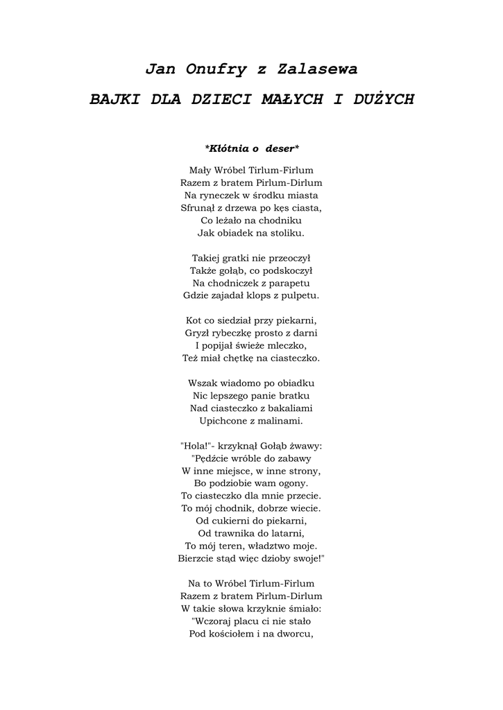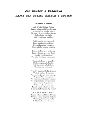 Jan Onufry z Zalasewa BAJKI DLA DZIECI MAŁYCH I DUŻYCH *Kłótnia o deser* Mały Wróbel Tirlum-Firlum Razem z bratem Pirlum-Dirlum Na ryneczek w środku miasta Sfrunął z drzewa po kęs ciasta, Co leżało na chodniku Jak obiadek na stoliku. Takiej gratki nie przeoczył Także gołąb, co podskoczył Na chodniczek z parapetu Gdzie zajadał klops z pulpetu. Kot co siedział przy piekarni, Gryzł rybeczkę prosto z darni I popijał świeże mleczko, Też miał chętkę na ciasteczko. Wszak wiadomo po obiadku Nic lepszego panie bratku Nad ciasteczko z bakaliami Upichcone z malinami. "Hola!"- krzyknął Gołąb żwawy: "Pędźcie wróble do zabawy W inne miejsce, w inne strony, Bo podziobie wam ogony. To ciasteczko dla mnie przecie. To mój chodnik, dobrze wiecie. Od cukierni do piekarni, Od trawnika do latarni, To mój teren, władztwo moje. Bierzcie stąd więc dzioby swoje!" Na to Wróbel Tirlum-Firlum Razem z bratem Pirlum-Dirlum W takie słowa krzyknie śmiało: "Wczoraj placu ci nie stało Pod kościołem i na dworcu, Gdzie grzebałeś w zboża korcu, Wyjadając garść łupinek. Teraz chciałbyś cały rynek. Ani myślim dać ci ciasto; To tak nasze jak twe miasto!" Na to gołąb się nastroszył I wróbelki hen przepłoszył, Lecz gdy wracał po ciasteczko Stary kot, co wypił mleczko, Na deserek ząb wyszczerzył I w gołębia pazur zmierzył. Gdy w gołębia tak kot runął Wróbel Tirlum z bratem sfrunął I złapawszy w dzioby ciasto Odlecieli hen za miasto. Morał z tego panie bratku Dziel się ciastem przy obiadku, Bo deserek rzecz nabyta A gościnność zawżdy syta. *** *Zjazd wróbli* Na polance w leśnym gaju Tuż przy stawie lub ruczaju, Hurma wróbli przyleciała I wesoło wszem ćwierkała: "Ćwiru- ćwiru, ciurum -ciurum Trylu-trylu, tlurum-tlurum." Świergotania co niemiara, Bowiem wróbli była chmara; Najróżniejszych, najbarwniejszych, Dużych, średnich i tych mniejszych; Naprzód wróble pospolite Upierzone w jednolite Fraki w barwie szaroburej; Śnieżki w gali srebropiórej: Wróbel Mazur lub Mazurek W upierzeniu pięknych piórek Pstrzy plamkami biel policzków I lśni czernią trzech guziczków. Wróbel skalny - pan Petronia W skrzydłach niby pelargonia, Wszystkich sprawnie zalatuje I zwinnością w oczy kłuje. Na sam koniec do wikłaczy, Boć i wikłacz wróbel znaczy, Pstry Pan Socius towarzyski Wlał ton zabaw wróblom bliski. Skacząc, frunąc i pląsając, To łopocząc to pluskając, Ptasia gawiedź tańczy, śpiewa, Obskakując wszystkie drzewa, Gna, ucieka pstra gromada, Świergotając ciągle gada, Pokrzykuje i swawoli, Każdy wróbel gra do woli: "Ćwiri- ćwirum, tyrli- tyrlum, Pyrrlum, Fyrrlum, Pyrli-pyrlum,..." *** *Jak wrona szukała pisklęta* Przy plebani wrona kracze: >>Gdzie me dziatki - ja tu płacze, łzy wylewam od godziny. Zaglądałam do rodziny do kolegów, koleżanek, na poddasze i na ganek, byłam nawet w kuble śmieci. Nigdzie nie ma moich dzieci! Od północka ptasiąt szukam, w każde okno, do drzwi stukam. Pewnie kot je upolował i na strychu je gdzieś schował albo jaki łobuz procą strącił z drzewa wczesną nocą i wziął ptaszki na wypchanie lub psom rzucił na śniadanie!<<. Nagle w gniazdku biednej wrony z sianka wyszły dwa ogony potem nóżki i oczęta. Już znalazły się pisklęta! Oto w nocy się bawiły. Długim sznurkiem tak kręciły, że się całe zaplątały, więc przed mamą się schowały. Tak posnęły w głębi sianka, długo chrapiąc aż do ranka. *** *Kot i myszka* Na kocyku kocur chrapie, Kręcąc zadkiem po kanapie; Wtem mysz polna pod drzwi wchodzi I ciekawie okiem wodzi, A gdy już się napatrzyła Na ser ząbki wyszczerzyła I powoli się skradała. Właśnie kota omijała, Gdy ten otwarł jedno oko. Mysz czmychnęła w sień głęboko, Kryjąc łepek między wory. Wtedy kocur zszedł z przekory Z wygodnego legowiska I do myszy się przeciska. Gdy kot był już dosyć blisko, Rzekł zniżywszy swój głos nisko: "Jestem myszko kot domowy. Nie zawracam sobie głowy Polowaniem na pstre myszki, Jeno jadam z własnej łyżki Co mi poda pani domu. Przeto nie chodź po kryjomu. Do spiżarni mknij prędziutko, Lecz się sprawuj tam cichutko I do norki wracaj w grzędę. Ja przeszkadzać Ci nie będę Zbyt mam łapki ociężałe Bym miał gonić myszki małe." Na koc kocur wiec poczłapał; Rzekłszy zdanie, dalej chrapał: "Idź do kuchni, bierz co chcesz Ale tylko ile zjesz." *** *Konkurs leśnych śpiewaków* Onegdaj za górami, w odległej krainie, Gdzie wiatr pląsa wśród kniei, słodko w chmurach płynie, A rześki deszczyk spływa po konarach lasu, Bujna kwieciem polanka wrzała od hałasu. Oto stary pan Sowa, co wśród zwierząt słynie, Jako najpierwszy sędzia w lesistej krainie, Ogłosił wszem otwarcie zawodów w śpiewaniu. Naprzód eliminacje w swobodnym ćwierkaniu Wyłonić miały piewców godnych stanąć w szranki Z najlepszymi wśród ptaków. Skraj leśnej polanki Zaległ więc zgiełkiem ptactwa w śpiewaczym staraniu. Zacne grono sędziwych puchaczy w uznaniu Głośnego wszem talentu szarego słowika Do finału konkursu, na wniosek czyżyka, Dopuściło śpiewaka. Bardzo się tym wzruszył Pan słowik, wszak wnet rycząc, jego radość zgłuszył Dziarski szczygieł z rodziny zawziętych łuszczaków: >>Hola<< -huknął: >>W imieniu wszystkich leśnych ptaków Protestuję! Toż to gwałt odwiecznych zwyczajów. Od kiedy to mieszkańcy drzew i polnych gajów Dzielą się na tych lepszych, którym ścielą drogi, I tych gorszych, dla których za wysokie progi Społecznych instytucji. Grodzą praw równości I powszechnej wśród ptaków gwarantów wolności!<<. Zatroskany pan słowik schował się za drzewem, Ustępując przezornie przed zawziętym gniewem Rozwrzeszczanej gawiedzi rozjuszonych ptaków, Co groźnie wyszczerzyła ostrza dziobo - haków. Zawrzało jeszcze głośniej na leśnej polanie. Każdy z ptaków, ćwierkając w tłumy własne zdanie Głuchy był na wołan