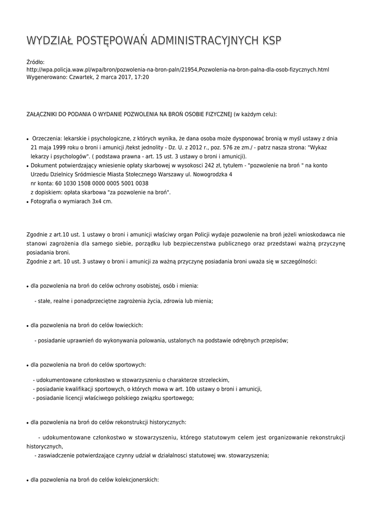 WYDZIAŁ POSTĘPOWAŃ ADMINISTRACYJNYCH KSP Źródło: http://wpa.policja.waw.pl/wpa/bron/pozwolenia-na-bron-paln/21954,Pozwolenia-na-bron-palna-dla-osob-fizycznych.html Wygenerowano: Czwartek, 2 marca 2017, 17:20 ZAŁĄCZNIKI DO PODANIA O WYDANIE POZWOLENIA NA BROŃ OSOBIE FIZYCZNEJ (w każdym celu): ● Orzeczenia: lekarskie i psychologiczne, z których wynika, że dana osoba może dysponować bronią w myśl ustawy z dnia 21 maja 1999 roku o broni i amunicji /tekst jednolity - Dz. U. z 2012 r., poz. 576 ze zm./ - patrz nasza strona: "Wykaz lekarzy i psychologów". ( podstawa prawna - art. 15 ust. 3 ustawy o broni i amunicji). ● Dokument potwierdzający wniesienie opłaty skarbowej w wysokosci 242 zł, tytułem - "pozwolenie na broń " na konto Urzedu Dzielnicy Sródmiescie Miasta Stołecznego Warszawy ul. Nowogrodzka 4 nr konta: 60 1030 1508 0000 0005 5001 0038 z dopiskiem: opłata skarbowa "za pozwolenie na broń". ● Fotografia o wymiarach 3x4 cm. Zgodnie z art.10 ust. 1 ustawy o broni i amunicji właściwy organ Policji wydaje pozwolenie na broń jeżeli wnioskodawca nie stanowi zagrożenia dla samego siebie, porządku lub bezpieczenstwa publicznego oraz przedstawi ważną przyczynę posiadania broni. Zgodnie z art. 10 ust. 3 ustawy o broni i amunicji za ważną przyczynę posiadania broni uważa się w szczególności: ● dla pozwolenia na broń do celów ochrony osobistej, osób i mienia: - stałe, realne i ponadprzeciętne zagrożenia życia, zdrowia lub mienia; ● dla pozwolenia na broń do celów łowieckich: - posiadanie uprawnień do wykonywania polowania, ustalonych na podstawie odrębnych przepisów; ● dla pozwolenia na broń do celów sportowych: - udokumentowane członkostwo w stowarzyszeniu o charakterze strzeleckim, - posiadanie kwalifikacji sportowych, o których mowa w art. 10b ustawy o broni i amunicji, - posiadanie licencji właściwego polskiego związku sportowego; ● dla pozwolenia na broń do celów rekonstrukcji historycznych: - udokumentowane członkostwo w stowarzyszeniu, którego statutowym celem jest organizowanie rekonstrukcji historycznych, - zaswiadczenie potwierdzające czynny udział w działalnosci statutowej ww. stowarzyszenia; ● dla pozwolenia na broń do celów kolekcjonerskich: - udokumentowane członkowstwo w stowarzyszeniu o charakterze kolekcjonerskim; ● dla pozwolenia na broń do celów pamiątkowych: - udokumentowane nabycie broni w drodze spadku, darowizny lub wyróżnienia; ● dla pozwolenia na broń do celów szkoleniowych: - posiadanie uprawnień, określonych w odrębnych przepisach do prowadzenia szkoleń o charakterze strzeleckim - udokumentowane zarejestrowanie działalności gospodarczej w zakresie szkoleń strzeleckich W podaniu o wydanie pozwolenia na broń powinny być umieszczone m. in. dane dot. dowodu osobistego (seria i nr dowodu osobistego, data wydania oraz organ wydajacy). Powyższe niezbędne jest do wydania zaświadczenia uprawniającego do nabycia broni. ● z obowiazku złożenia orzeczen: lekarskiego i psychologicznego zwolnieni są funkcjonariusze Policji, Agencji Bezpieczeństwa Wewnętrznego, Agencji Wywiadu, Służby Kontrwywiadu Wojskowego, Służby Wywiadu Wojskowego, Centralnego Biura Antykorupcyjnego, Biura Ochrony Rządu, Straży Granicznej, Służby Celnej, Służby Więziennej oraz funkcjonariusze innych państwowych formacji uzbrojonych i żołnierzy zawodowych Sił Zbrojnych Rzeczypospolitej Polskiej, jeżeli na podstawie odrębnych przepisów posiadają przydzieloną im broń służbową - art. 15 ust. 6 ustawy o broni i amunicji.W/w funkcjonariusze dostarczają stosowne zaświadczenie z miejsca pracy. Zgodnie z treścia art. 15 ust. 4a ustawy o broni i amunicji przepisów art. 15 ust. 3 i 4 nie stosuje się do pracowników podmiotów wskazanych w art. 29 ust. 1 pkt 1 i 2 wpisanych na listę kwalifikowanych pracowników ochrony fizycznej, o której mowa w art. 26 ustawy z dnia 22 sierpnia 1997 r. o ochronie osób i mienia (Dz. U. z 2014 r. poz. 1099 oraz z 2015 r. poz. 1505), ubiegających się lub posiadających dopuszczenie do posiadania broni, którzy przedstawiają orzeczenia lekarskie wydane w trybie przepisów ustawy z dnia 22 sierpnia 1997 r. o ochronie osób i mienia.(brzmienie przepisu obowiazujace po dniu 30 listopada 2015 r.) Zgodnie z art. 9 ust. 1 pkt. 2 Ustawy z dnia 16 listopada 2006 r. o opłacie skarbowej "opłata skarbowa podlega zwrotowi od wydania zaświadczenia lub zezwolenia (pozwolenia) - jeżeli mimo zapłacenia opłaty nie wydano zaświadczenia lub zezwolenia (pozwolenia)". O zwrot przedmiotowej opłaty należy zwrócić się bezpośrednio do w/w urzędu. Ocena: 3.2/5 (44) Tweetnij