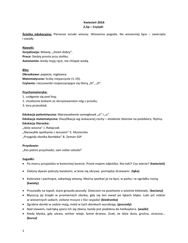Kwiecień 2016 2,5p – Czyżyki Ścieżka edukacyjna: Pierwsze oznaki wiosny. Wiosenna pogoda. Na wiosennej łące – zwierzęta i owady. Nawyki: Socjalizacja: Mówię: „Dzień dobry”. Praca: Siedzę prosto przy stoliku. Autonomia: Kiedy myję ręce, nie chlapié wodą. Bity: Obrazkowe: papieże, mgławice Matematyczne: liczby nieparzyste (1-19). Czytania: rzeczowniki rozpoczynające się literą „N”, „O”. Psychomotoryka: 1. czołganie się pod liną; 2. chodzenie bokiem ze skrzyżowaniem nóg z przodu; 3. tory przeszkód. Edukacja polonistyczna: Wprowadzenie samogłosek „ó” i „u”. Edukacja matematyczna: Klasyfikacja wg wskazanej cechy – dzielenie zbiorów na podzbiory. Rytmy. Edukacja literacka: „Idzie wiosna” J. Ratajczak „Niezwykłe spotkanie z Jezusem” E. Musiorska „Przygody słonika Bombika” B. Zeman SSP Przysłowie: „Kto późno przychodzi, sam sobie szkodzi” Zagadki: Po marcu przyjeżdża w kwiecistej karecie. Przed majem odjeżdża. Kto taki? Czy wiecie? (kwiecień) Zielony dywan pokryty kwiatami, w lesie się ukrywa pomiędzy drzewami. (łąka) Kolorowe i pachnące, zakwitają wiosną. Można spotkać je na łące, w parku i w ogródku rosną. (kwiaty) Przysiadły na topoli, stare gniazdo poznały. Dzieciom na powitanie o wiośnie klekotały. (bociany) Błyszczą jej kropki w promieniach słonka, gdy się ten owad po łąkach błąka. Lubi pić nektar w wiosennych sadach, zielone mszyce z liści wyjada! (biedronka) Zgrabne domki w sadzie mają, miód w tych domkach wyrabiają. (pszczoły) Nad stawem, nad łąką sporo ich się zbiera, każda jest podobna do helikoptera. (ważki) Kiedy błyska, gdy ulewa, wicher wieje, łamie drzewa. Znak, że idzie duża, groźna, straszna... (burza) 1 Jak się nazywają te drobniutkie kulki, które na podwórko zrzucają ciemne chmurki? (grad) Rankiem się srebrzy na łące, potem wysuszy ją słońce. (rosa) Zadania logopedyczne: Ćwiczenia fonacyjne: Co mówi bocian, gdy żabkę zjeść chce? Kle, kle, kle. Co mówi żabka, gdy bocianów tłum? Kum, kum, kum. Co mówi kotek, gdy mleczka by chciał? Miau, miau, miau. Co mówi kogut, gdy budzi się w kurniku? Kukuryku. Co mówi koza, gdy jeść jej się chce? Me, me, me. Co mówi krowa, gdy brak jej tchu? Mu, mu, mu. Co mówi piesek, gdy kości by chciał? Hau, hau, hau Co mówi baran, gdy spać mu się chce? Be, be, be. Ćwiczenia języka: wypychanie językiem policzków, unoszenie języka za górne zęby i cofanie go do podniebienia miękkiego, liczenie górnych zębów czubkiem języka przy szeroko otwartych ustach, kląskanie językiem (konik), ”malowanie” językiem podniebienia przy szeroko otwartych ustach, naprzemienne unoszenie języka za górne i dolne zęby przy szeroko otwartych ustach. Wiersze: Z. Baryła „Wiosenna łąka” M. Strzałkowska „Moi mili” Wiosenna łąka w promieniach słońca cała zielona jest i kwitnąca. Pszczoły, motyle nad nią fruwają, a w trawie świerszcze koncerty grają. Życie pędzi wciąż do przodu, coraz prędzej gna i bryka i czasami w tym pośpiechu coś ważnego nam umyka. Rosną na łące białe stokrotki, wierzby nad rzeką pokryły kotki. Żaby rechoczą, śpiewają ptaki, do gniazd dla piskląt znoszą robaki. A więc wniosek dzisiaj stawiam, aby każdy z nas spróbował przy okazji, bez okazji, mówić częściej takie słowa: Żółte kaczeńce na łące kwitną, niebo ma barwę jasnobłękitną. Wśród kwiatów pszczoły pilnie pracują, zbierają nektar, miód produkują. Słoneczko grzeje, stopniały śniegi, na noskach dzieci są pierwsze piegi. Cieszą się dzieci i ziemia cała, że wiosna do nas już zawitała. 2 Do widzenia, i dzień dobry co tam słychać?, jak się czujesz? i poproszę, i przepraszam oraz proszę i dziękuję. Wtedy ludziom na tym świecie sympatyczniej ciut by było. No, a przecież o to chodzi, by się wszystkim milej żyło! Piosenka: „Moje dobre wychowanie” – Jedynkowe Przedszkole 1. Chwali mnie babcia, chwali mnie dziadek, chwali sąsiadka, Tadek - niejadek. Chwali mnie ciocia, chwali mnie wujek, bo zawsze mówię: proszę, dziękuję. Ref: Grunt to dobre wychowanie, powiem Tacie, powiem Mamie, żeby zawsze mnie uczyli, by się później nie wstydzili. 2. Chwali mnie siostra, chwali pies Burek, chwali kuzynka, Jurek-Ogórek. Chwali mnie Pani, stryj bardzo mądry, mówię przepraszam, mówię dzień dobry. Muzyka klasyczna: 1. Luigi Boccherini – Menuet As-dur. 2. Franz Schubert – Marsz wojskowy. Modlitwy: Modlitwa poranna: Alleluja! Biją dzwony, głosząc w świata wszystkie strony, że zmartwychwstał Pan! Modlitwa przed posiłkiem: Pobłogosław Panie Boże, nas i te dary, które z Twojej dobroci będziemy spożywać. Przez Chrystusa Pana naszego. Amen Modlitwa po posiłku: Za ten posiłek i wszystkie dary Twej dobroci chwalimy Ciebie Boże, Przez Chrystusa Pana naszego. Amen. Modlitwa na zakończenie dnia: Chwała Ojcu i Synowi i Duchowi Świętemu, Jak była na początku, teraz i zawsze i na wieki wieków. Amen. Muzyka: Ćwiczenia słuchowe - krótkie zagadki melodyczne, oparte na poznanych już piosenkach. - rozpoznawanie odgłosów znanych dzieciom z codziennego otoczenia - różne sposoby wykonywania prostych rytmów: klaskanie w ręce, uderzanie w kolana, pukanie palcem w podłogę itp. Ćwiczenia ruchowo-rytmiczne - zabawy o charakterze orientacyjnym i organizacyjnym. Wyrabianie szybkiej reakcji ruchowej. - formowanie rzędu, koła, par, dwóch kółek 3 - marsz, bieg, krok dosuwany do przodu w ustawieniu w kole i w parach - ćwiczenie cwału bocznego - próby obracania się podskokami w parach - dostosowywanie ruchu do słyszanego akompaniamentu Piosenki „W naszym ogródeczku” W naszym ogródeczku / zrobimy porządki/ 3x Wygrabimy ścieżki /przekopiemy grządki/ 3x Raz dwa trzy. Potem w miękką ziemię /wsiejemy nasionka/ 3x Będą się wygrzewać /na wiosennym słonku / 3x Raz dwa trzy. Spadnie ciepły deszczyk /i wszystko odmieni/ 3