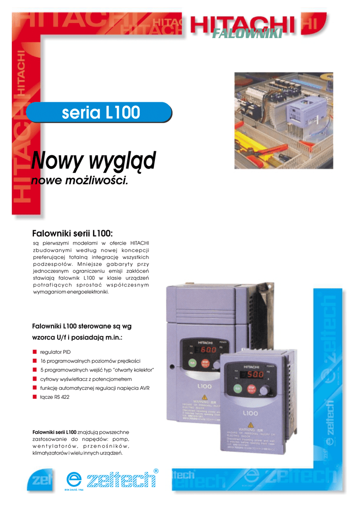 FALOWNIKI seria L100 Nowy wygl¹d nowe mo¿liwoci. Falowniki serii L100: s¹ pierwszymi modelami w ofercie HITACHI zbudowanymi wed³ug nowej koncepcji preferuj¹cej totaln¹ integracjê wszystkich p o d ze s p o ³ ó w. M n i e j s ze g a b a r y t y p r z y jednoczesnym ograniczeniu emisji zak³óceñ stawiaj¹ falownik L100 w klasie urz¹dzeñ potrafi¹cych spros taæ wspó³czesnym wymaganiom energoelektroniki. Falowniki L100 sterowane s¹ wg wzorca U/f i posiadaj¹ m.in.: regulator PID 16 programowalnych poziomów prêdkoci 5 programowalnych wejæ typ otwarty kolektor cyfrowy wywietlacz z potencjometrem funkcjê automatycznej regulacji napiêcia AVR ³¹cze RS 422 Falowniki serii L100 znajduj¹ powszechne zastosowanie do napêdów: pomp, went ylatorów, przenoników, klimatyzatorów i wielu innych urz¹dzeñ. Dane techniczne falowników: IDEE DLA PRZYSZ£OCI serii L100 Jednofazowe NFE - Model Trójfazowe HFE - 002 004 005 007 011 015 022 004 007 015 022 030 040 055 075 Maksymalna moc wspó³pracuj¹cego silnika [kW] 0,2 0,4 0,55 0,75 1,1 1,5 2,2 0,4 0,75 1,5 2,2 3,0 4,0 5,5 7,5 Moc wyjciowa falownika [kVA] 0,5 1,0 1,2 1,6 2,0 2,9 4,1 1,1 1,9 3,0 4,3 6,2 6,8 10,3 12,7 13,0 16,0 5,5 5,7 Napiêcie zasilania 1-fazowe: 200~240V ± 10%, 50/60Hz ± 5% Znamionowe napiêcie wyjciowe 3-fazowe: 380~460V ± 10%, 50/60Hz ± 5% 3-fazowe: 200~240V 1,4 Znamionowy pr¹d wyjciowy [A] 2,6 4,0 3,0 3-fazowe: 380~460V 5,0 7,1 10,0 Stopieñ ochrony 3,8 5,5 7,8 8,6 0,5 ÷ 360Hz Sta³o momentowa lub o momencie zredukowanym Charakterystyki sterowania U/f Czasy przyspieszania i zwalniania Wymiary [mm] 2,5 IP20 Czêstotliwoæ wyjciowa Moment hamuj¹cy 1,5 Od 0,1 sek. do 3000 sek. Przyspieszanie (zwalnianie) odbywaæ siê mo¿e w sposób liniowy lub nieliniowy. Dostêpny jest drugi zestaw czasów przyspieszania i zwalniania. Bez opornika ~70% ~100% ~20% ~100% ~20% ~70% Hamowanie pr¹dem sta³ym rozpoczyna siê po zwolnieniu silnika do fmin Parametry hamowania ustawiane przy pomocy pulpitu cyfrowego (czêstotliwoæ minimalna, czas hamowania oraz si³a hamuj¹ca) Pr¹dem sta³ym Wysokoæ 120 130 180 180 130 130 180 Szerokoæ 80 110 140 140 110 110 140 164 129 2,8 1,3 G³êbokoæ 107 0,85 Masa [kg] 129 0,85 1,3 153 1,3 2,2 2,2 Czêstotliwoæ wyjciowa Cyfrowa Nastawa czêstotliwoci Dok³adnoæ regulacji czêstotliwoci wyjciowej Nastawa za pomoc¹ pulpitu cyfrowego - Potencjometr: 1kW~2kW - Sygna³y napiêciowe: 0~10V pr¹du sta³ego - Sygna³y pr¹dowe: 4~20mA pr¹du sta³ego Analogowa Cyfrowa ±0.01% fmax Analogowa ±0.2% fmax Rozdzielczoæ czêstotliwoci Nastawa cyfrowa - 0.1Hz Nastawa analogowa fmax/1000 Regulacja wielopoziomowa Maksymalnie 16 poziomów Regulacja sekwencyjna Nie dotyczy Czêstotliwoæ pracy chwilowej 0~10Hz Programowane poziomy ograniczenia od góry i do³u Ograniczenie czêstotliwoci wyjciowej 1,7 2,8 2,8 2,8 Zabezpieczenia zewnêtrzne 0.5Hz~50Hz, 0.5Hz~60Hz 0.5Hz~100Hz, 0.5Hz~120Hz 0.5Hz~360Hz Zakres zmian czêstotliwoci 164 156 1,7 Regulator PID Sygna³ sprzê¿enia zwrotnego Napiêciowy 0~10V Pr¹dowy 4~20mA Wspó³czynnik wzmocnienia P 0.2 do 5.0 Czas ca³kowania I 0~150s Czas ró¿niczkowania D 0~100s Nadnapiêciowe Zasilanie 1 - fazowe: 400V Zasilanie 3 - fazowe: 800V Podnapiêciowe Obni¿enie napiêcia nie d³u¿ej ni¿ 3s 50~150%In(przez 60s) Nadpr¹dowe Przeci¹¿eniowe Zanik napiêcia zasilania B³¹d doziemienia 50~120% Automatyczny rozruch po zaniku napiêcia nie d³u¿szym ni¿ 15ms Wyposa¿enie standardowe Przegrzanie Ochrona przez czujnik temperatury Kasowanie b³êdu Przycisk zewnêtrzny lub od³¹czenie napiêcia zasilania Sygnalizacja wyjciowa Sygnalizacja osi¹gniêcia czêstotliwoci zadanej Wyjcie otwarty kolektor 27V, 50mA Sygnalizacja pracy Wyjcie otwarty kolektor 27V, 50mA Sygnalizacja b³êdu Wyjcie otwarty kolektor 27V, 50mA Styki przekanika zewnêtrznego Sygnalizacja przeci¹¿enia pr¹dem Wyjcie otwarty kolektor 27V, 50mA Sygnalizacja przekroczenia sygna³u uchybu (regulacja PID) Wyjcie otwarty kolektor 27V, 50mA Warunki zewnêtrzne Temperatura otoczenia DYSTRYBUTOR Temperatura sk³adowania bez os³ony: -10°C ÷ +50°C -25°C ÷ +70°C Podczas krótkotrwa³ego transportu Wilgotnoæ 20% ÷ 90% (bez skraplania) Lokalizacja 1000m n.p.m. we wnêtrzu (bez kurzu i bez gazów ¿r¹cych) Kolor Niebieski wykona³ Robert Jastrzêbski 02.2000