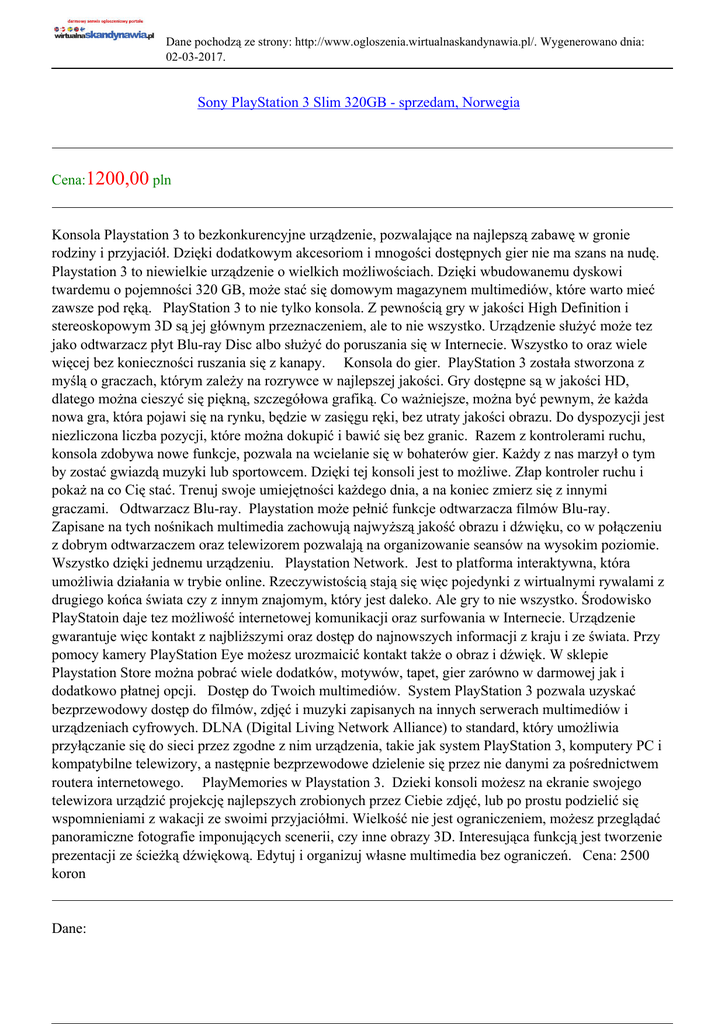 Dane pochodzą ze strony: http://www.ogloszenia.wirtualnaskandynawia.pl/. Wygenerowano dnia: 02-03-2017. Sony PlayStation 3 Slim 320GB - sprzedam, Norwegia Cena:1200,00 pln Konsola Playstation 3 to bezkonkurencyjne urządzenie, pozwalające na najlepszą zabawę w gronie rodziny i przyjaciół. Dzięki dodatkowym akcesoriom i mnogości dostępnych gier nie ma szans na nudę. Playstation 3 to niewielkie urządzenie o wielkich możliwościach. Dzięki wbudowanemu dyskowi twardemu o pojemności 320 GB, może stać się domowym magazynem multimediów, które warto mieć zawsze pod ręką. PlayStation 3 to nie tylko konsola. Z pewnością gry w jakości High Definition i stereoskopowym 3D są jej głównym przeznaczeniem, ale to nie wszystko. Urządzenie służyć może tez jako odtwarzacz płyt Blu-ray Disc albo służyć do poruszania się w Internecie. Wszystko to oraz wiele więcej bez konieczności ruszania się z kanapy. Konsola do gier. PlayStation 3 została stworzona z myślą o graczach, którym zależy na rozrywce w najlepszej jakości. Gry dostępne są w jakości HD, dlatego można cieszyć się piękną, szczegółowa grafiką. Co ważniejsze, można być pewnym, że każda nowa gra, która pojawi się na rynku, będzie w zasięgu ręki, bez utraty jakości obrazu. Do dyspozycji jest niezliczona liczba pozycji, które można dokupić i bawić się bez granic. Razem z kontrolerami ruchu, konsola zdobywa nowe funkcje, pozwala na wcielanie się w bohaterów gier. Każdy z nas marzył o tym by zostać gwiazdą muzyki lub sportowcem. Dzięki tej konsoli jest to możliwe. Złap kontroler ruchu i pokaż na co Cię stać. Trenuj swoje umiejętności każdego dnia, a na koniec zmierz się z innymi graczami. Odtwarzacz Blu-ray. Playstation może pełnić funkcje odtwarzacza filmów Blu-ray. Zapisane na tych nośnikach multimedia zachowują najwyższą jakość obrazu i dźwięku, co w połączeniu z dobrym odtwarzaczem oraz telewizorem pozwalają na organizowanie seansów na wysokim poziomie. Wszystko dzięki jednemu urządzeniu. Playstation Network. Jest to platforma interaktywna, która umożliwia działania w trybie online. Rzeczywistością stają się więc pojedynki z wirtualnymi rywalami z drugiego końca świata czy z innym znajomym, który jest daleko. Ale gry to nie wszystko. Środowisko PlayStatoin daje tez możliwość internetowej komunikacji oraz surfowania w Internecie. Urządzenie gwarantuje więc kontakt z najbliższymi oraz dostęp do najnowszych informacji z kraju i ze świata. Przy pomocy kamery PlayStation Eye możesz urozmaicić kontakt także o obraz i dźwięk. W sklepie Playstation Store można pobrać wiele dodatków, motywów, tapet, gier zarówno w darmowej jak i dodatkowo płatnej opcji. Dostęp do Twoich multimediów. System PlayStation 3 pozwala uzyskać bezprzewodowy dostęp do filmów, zdjęć i muzyki zapisanych na innych serwerach multimediów i urządzeniach cyfrowych. DLNA (Digital Living Network Alliance) to standard, który umożliwia przyłączanie się do sieci przez zgodne z nim urządzenia, takie jak system PlayStation 3, komputery PC i kompatybilne telewizory, a następnie bezprzewodowe dzielenie się przez nie danymi za pośrednictwem routera internetowego. PlayMemories w Playstation 3. Dzieki konsoli możesz na ekranie swojego telewizora urządzić projekcję najlepszych zrobionych przez Ciebie zdjęć, lub po prostu podzielić się wspomnieniami z wakacji ze swoimi przyjaciółmi. Wielkość nie jest ograniczeniem, możesz przeglądać panoramiczne fotografie imponujących scenerii, czy inne obrazy 3D. Interesująca funkcją jest tworzenie prezentacji ze ścieżką dźwiękową. Edytuj i organizuj własne multimedia bez ograniczeń. Cena: 2500 koron Dane: Dane pochodzą ze strony: http://www.ogloszenia.wirtualnaskandynawia.pl/. Wygenerowano dnia: 02-03-2017. Miejscowość: Stavanger Region: Norwegia