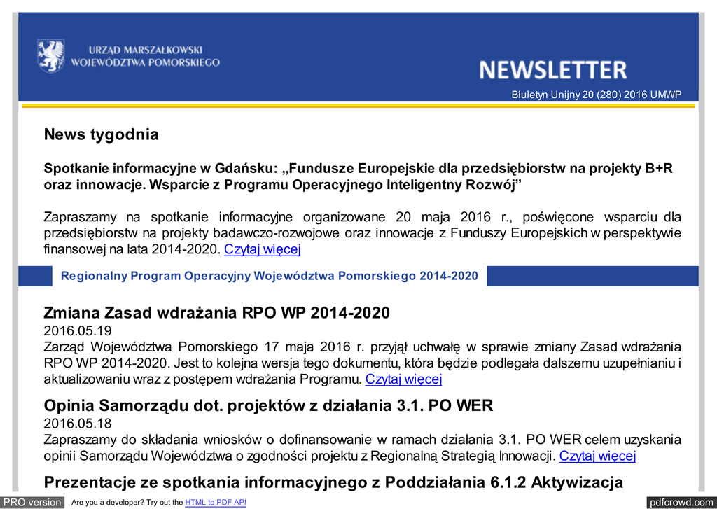 Biuletyn Unijny 20 (280) 2016 UMWP News tygodnia Spotkanie informacyjne w Gdańsku: „Fundusze Europejskie dla przedsiębiorstw na projekty B+R oraz innowacje. Wsparcie z Programu Operacyjnego Inteligentny Rozwój” Zapraszamy na spotkanie informacyjne organizowane 20 maja 2016 r., poświęcone wsparciu dla przedsiębiorstw na projekty badawczo-rozwojowe oraz innowacje z Funduszy Europejskich w perspektywie finansowej na lata 2014-2020. Czytaj więcej Regionalny Program Operacyjny Województwa Pomorskiego 2014-2020 Zmiana Zasad wdrażania RPO WP 2014-2020 2016.05.19 Zarząd Województwa Pomorskiego 17 maja 2016 r. przyjął uchwałę w sprawie zmiany Zasad wdrażania RPO WP 2014-2020. Jest to kolejna wersja tego dokumentu, która będzie podlegała dalszemu uzupełnianiu i aktualizowaniu wraz z postępem wdrażania Programu. Czytaj więcej Opinia Samorządu dot. projektów z działania 3.1. PO WER 2016.05.18 Zapraszamy do składania wniosków o dofinansowanie w ramach działania 3.1. PO WER celem uzyskania opinii Samorządu Województwa o zgodności projektu z Regionalną Strategią Innowacji. Czytaj więcej Prezentacje ze spotkania informacyjnego z Poddziałania 6.1.2 Aktywizacja PRO version Are you a developer? Try out the HTML to PDF API pdfcrowd.com Społeczno-Zawodowa 2016.05.18 Zapraszamy do zapoznania się z prezentacjami ze spotkania informacyjnego dedykowanego konkursowi z Poddziałania 6.1.2 Aktywizacja społeczno-zawodowa,które odbyło się 12.05.2016 r. w Gdańsku.Czytaj więcej 9 milionów złotych dla Gdańszczan znajdujących się w trudnej sytuacji życiowej i zawodowej 2016.05.18 9 maja 2016 r. Samorząd Województwa Pomorskiego podpisał umowę z Miastem Gdańsk na realizację projektu pt. „GPS – Gotowość Praca Samodzielność". Projekt o wartości prawie 9 milionów złotych (8 969 918,88) pomoże powrócić m.in. na rynek pracy tym mieszańcom Gdańska, którzy z różnych powodów znaleźli się na życiowym zakręcie. Czytaj więcej Rozstrzygnięcie konkursu z Działania 8.3 Materialne i niematerialne dziedzictwo kulturowe RPO WP 2014-2020 2016.05.17 Dnia 12 maja 2016 r. uchwałą nr 465/142/16 Zarząd Województwa Pomorskiego rozstrzygnął konkurs z Działania 8.3 Materialne i niematerialne dziedzictwo kulturowe RPO WP 2014-2020 (konkurs nr RPPM.08.03.00-IZ.00-22-001/15). Czytaj więcej Główny Punkt Informacyjny Funduszy Europejskich Spotkanie informacyjne w Gdyni: „Fundusze na prace B+R oraz komercjalizację w ramach Regionalnego Programu Operacyjnego Województwa Pomorskiego na lata 2014-2020” 2016.05.19 Lokalny Punkt Informacyjny Funduszy Europejskich w Gdańsku zaprasza na spotkanie informacyjne organizowane 2 czerwca 2016 r., poświęcone zagadnieniom wsparcia prac badawczo-rozwojowych oraz PRO version Are you a developer? Try out the HTML to PDF API pdfcrowd.com komercjalizacji w ramach Regionalnego Programu Operacyjnego Województwa Pomorskiego na lata 20142020. Czytaj więcej Spotkanie informacyjne w Wejherowie: „Zasady kwalifikowalności wydatków w projektach współfinansowanych z Europejskiego Funduszu 2016.05.19 Lokalny Punkt Informacyjny Funduszy Europejskich w Wejherowie zaprasza na spotkanie informacyjne organizowane 31 maja 2016 r., poświęcone zagadnieniom związanym z kwalifikowalnością wydatków w projektach współfinansowanych z Europejskiego Funduszu Społecznego. Czytaj więcej Spotkanie informacyjne w Wejherowie: „Fundusze na integrację - konkurs z poddziałania 6.1.2. Aktywizacja społeczno-zawodowa w ramach RPO WP 20142020” 2016.05.19 Lokalny Punkt Informacyjny Funduszy Europejskich w Wejherowie zaprasza na spotkanie informacyjne organizowane 31 maja 2016 r., dotyczące konkursu ogłoszonego przez Zarząd Województwa Pomorskiego z poddziałania 6.1.2. Aktywizacja społeczno-zawodowa w ramach Regionalnego Programu Operacyjnego Województwa Pomorskiego 2014-2020. Czytaj więcej Spotkania informacyjne: „Środa z Funduszami dla organizacji pozarządowych” 2016.05.19 Punkty Informacyjne Funduszy Europejskich w województwie pomorskim w ramach cyklu „Środa z Funduszami" zapraszają na spotkania informacyjne organizowane 1 czerwca 2016 r., poświęcone zagadnieniom związanym ze wsparciem organizacji pozarządowych z Funduszy Europejskich w perspektywie finansowej na lata 2014-2020. Czytaj więcej Spotkanie informacyjne w Gdyni: „Mama może wszystko! Fundusze Europejskie na założenie własnej działalności gospodarczej” 2016.05.19 Lokalny Punkt Informacyjny Funduszy Europejskich w Gdańsku zaprasza na spotkanie informacyjne PRO version Are you a developer? Try out the HTML to PDF API pdfcrowd.com organizowane 20 maja 2016 r., poświęcone zagadnieniom związanym z zakładaniem działalności gospodarczej przy wsparciu Funduszy Europejskich w perspektywie finansowej na lata 2014-2020. Czytaj więcej Szkolenie w Malborku: „Perspektywa 2014-2020 – wsparcie dla przedsiębiorców” 2016.05.19 Lokalny Punkt Informacyjny Funduszy Europejskich w Malborku zaprasza na szkolenie organizowane 20 maja 2016 r., poświęcone zagadnieniom związanym z Funduszami Europejskimi na rozwój działalności gospodarczej w nowej perspektywie finansowej na lata 2014-2020. Czytaj więcej Szkolenie w Słupsku: „Podstawowe zasady realizacji i rozliczania projektów finansowanych z Funduszy Europejskich w perspektywie 2014-2020” 2016.05.19 Lokalny Punkt Informacyjny Funduszy Europejskich w Słupsku zaprasza na szkolenie organizowane 24 maja 2016 r., poświęcone zasadom realizacji i rozliczania projektów finansowanych z Funduszy Europejskich w perspektywie 2014-2020. Czytaj więcej Spotkania informacyjne w Kościerzynie, Chojnicach i Człuchowie: „Środki z Unii Europejskiej na rozwój przedsiębiorstw” 2016.05.19 Lokalny Punkt Informacyjny Funduszy Europejskich w Chojnicach zaprasza na spotkania informacyjne organizowane 20, 24 i 25 maja 2016 r., poświęcone zagadnieniom związanym z Funduszami Europejskimi na rozwój
