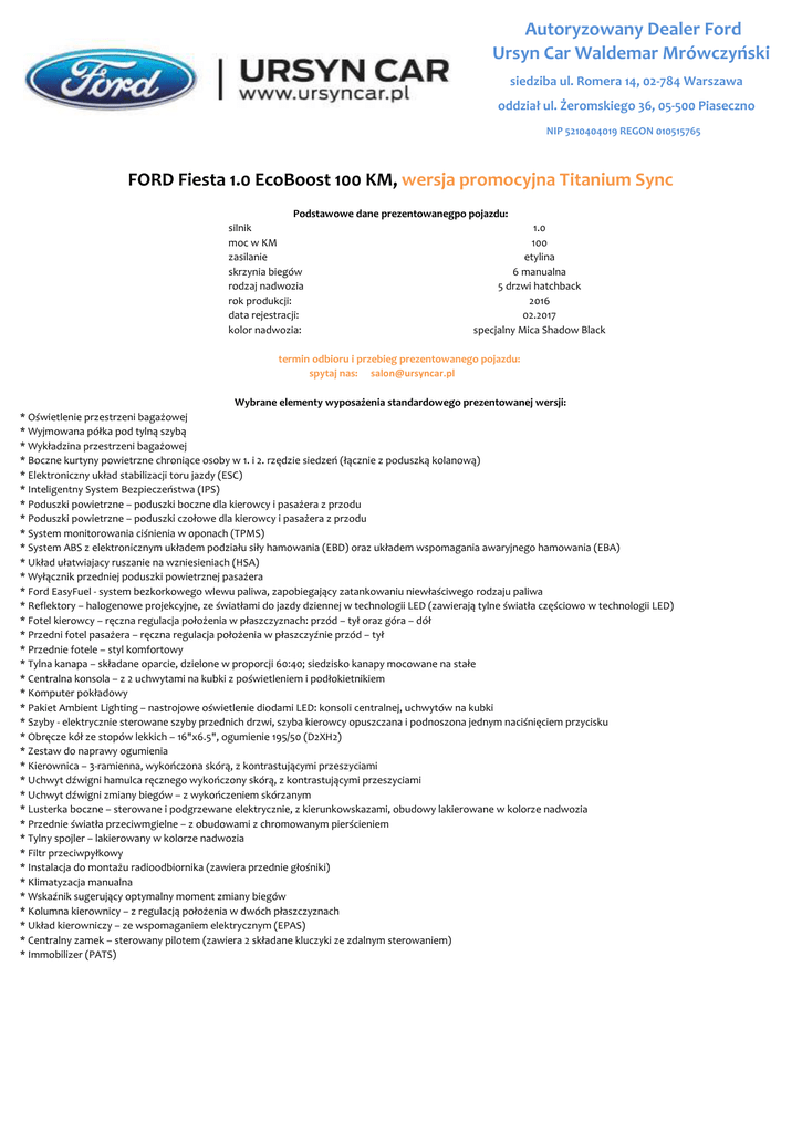 Autoryzowany Dealer Ford Ursyn Car Waldemar Mrówczyński siedziba ul. Romera 14, 02-784 Warszawa oddział ul. Żeromskiego 36, 05-500 Piaseczno NIP 5210404019 REGON 010515765 FORD Fiesta 1.0 EcoBoost 100 KM, wersja promocyjna Titanium Sync Podstawowe dane prezentowanegpo pojazdu: silnik 1.0 moc w KM 100 zasilanie etylina skrzynia biegów 6 manualna rodzaj nadwozia 5 drzwi hatchback rok produkcji: 2016 data rejestracji: 02.2017 kolor nadwozia: specjalny Mica Shadow Black termin odbioru i przebieg prezentowanego pojazdu: spytaj nas: [email protected] Wybrane elementy wyposażenia standardowego prezentowanej wersji: * Oświetlenie przestrzeni bagażowej * Wyjmowana półka pod tylną szybą * Wykładzina przestrzeni bagażowej * Boczne kurtyny powietrzne chroniące osoby w 1. i 2. rzędzie siedzeń (łącznie z poduszką kolanową) * Elektroniczny układ stabilizacji toru jazdy (ESC) * Inteligentny System Bezpieczeństwa (IPS) * Poduszki powietrzne – poduszki boczne dla kierowcy i pasażera z przodu * Poduszki powietrzne – poduszki czołowe dla kierowcy i pasażera z przodu * System monitorowania ciśnienia w oponach (TPMS) * System ABS z elektronicznym układem podziału siły hamowania (EBD) oraz układem wspomagania awaryjnego hamowania (EBA) * Układ ułatwiajacy ruszanie na wzniesieniach (HSA) * Wyłącznik przedniej poduszki powietrznej pasażera * Ford EasyFuel - system bezkorkowego wlewu paliwa, zapobiegający zatankowaniu niewłaściwego rodzaju paliwa * Reflektory – halogenowe projekcyjne, ze światłami do jazdy dziennej w technologii LED (zawierają tylne światła częściowo w technologii LED) * Fotel kierowcy – ręczna regulacja położenia w płaszczyznach: przód – tył oraz góra – dół * Przedni fotel pasażera – ręczna regulacja położenia w płaszczyźnie przód – tył * Przednie fotele – styl komfortowy * Tylna kanapa – składane oparcie, dzielone w proporcji 60:40; siedzisko kanapy mocowane na stałe * Centralna konsola – z 2 uchwytami na kubki z poświetleniem i podłokietnikiem * Komputer pokładowy * Pakiet Ambient Lighting – nastrojowe oświetlenie diodami LED: konsoli centralnej, uchwytów na kubki * Szyby - elektrycznie sterowane szyby przednich drzwi, szyba kierowcy opuszczana i podnoszona jednym naciśnięciem przycisku * Obręcze kół ze stopów lekkich – 16"x6.5", ogumienie 195/50 (D2XH2) * Zestaw do naprawy ogumienia * Kierownica – 3-ramienna, wykończona skórą, z kontrastującymi przeszyciami * Uchwyt dźwigni hamulca ręcznego wykończony skórą, z kontrastującymi przeszyciami * Uchwyt dźwigni zmiany biegów – z wykończeniem skórzanym * Lusterka boczne – sterowane i podgrzewane elektrycznie, z kierunkowskazami, obudowy lakierowane w kolorze nadwozia * Przednie światła przeciwmgielne – z obudowami z chromowanym pierścieniem * Tylny spojler – lakierowany w kolorze nadwozia * Filtr przeciwpyłkowy * Instalacja do montażu radioodbiornika (zawiera przednie głośniki) * Klimatyzacja manualna * Wskaźnik sugerujący optymalny moment zmiany biegów * Kolumna kierownicy – z regulacją położenia w dwóch płaszczyznach * Układ kierowniczy – ze wspomaganiem elektrycznym (EPAS) * Centralny zamek – sterowany pilotem (zawiera 2 składane kluczyki ze zdalnym sterowaniem) * Immobilizer (PATS) Aktualna cena nowego pojazdu: 61 150,00 Wyposażenie opcjonalne oferowanego egzemplarza: * Lakier specjalny Mica Shadow Black 1 600,00 * Fotel kierowcy – regulacja podparcia odcinka lędźwiowego 150,00 150,00 * Koło zapasowe – z obręczą stalową 14"x5.5" 200,00 * Elementy Pakietu Driver Assistance 1: Czujniki parkowania z tyłu, Elektrycznie składane lusterka boczne z lampkami oświetlającymi 1 200,00 400,00 * Elementy Pakietu Silver X Plus 2: Klimatyzacja automatyczna z elektroniczną regulacją temperatury (EATC), Radioodtwarzacz CD/MP3 z Ford SYNC i AppLink (kolorowy wyświetlacz 4.2", Zestaw głośnomówiący z Bluetooth® i rozbudowaną funkcją sterowania głosem (bez języka polskiego) oraz funkcją wzywania pomocy, 6 głośników, zdalne sterowanie, gniazdo USB) 1 600,00 3 150,00 Cena nowego egzemplarza wraz z wyposażeniem opcjonalnym: brutto 69 450,00 Cena oferowanego egzemplarza: brutto 55 400,00 Zyskujesz w stosunku do nowego auta aż: Skontaktuj sie z nami pod adresem: [email protected] salon Ursynów 22 644-75-75 salon Piaseczno 22 73-55-900 Dokładamy wszelkich starań aby opisy produktów były wolne od błędów, jednakże zastrzegamy sobie prawo do pomyłki. Zdjęcia produktów są zdjęciami poglądowymi i mogą różnić się nieznacznie od produktu fizycznego. Zawarte w niniejszym wydawnictwie informacje nie stanowią zapewnienia w rozumieniu art. 4 ust. 3 i 4 Ustawy z dnia 27 lipca 2002 roku o szczególnych warunkach sprzedaży oraz o zmianie Kodeksu Cywilnego (dalej „Ustawa”), a także nie stanowią opisu towaru w rozumieniu art. 4 ust. 2 Ustawy. Zamontowane wyposażenie dodatkowe może powodować zastąpienie wyposażenia standardowego lub brak możliwości montażu elementów stanowiących wyposażenie standardowe lub opcjonalne danej wersji modelowej Niniejsze wydawnictwo nie stanowi oferty w rozumieniu art. 66 Kodeksu Cywilnego. 14 050,00