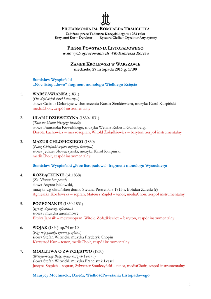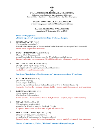 FILHARMONIA IM. ROMUALDA TRAUGUTTA Założona przez Tadeusza Kaczyńskiego w 1983 roku Krzysztof Kur – Dyrektor Ryszard Cieśla – Dyrektor Artystyczny PIEŚNI POWSTANIA LISTOPADOWEGO w nowych opracowaniach Włodzimierza Korcza ZAMEK KRÓLEWSKI W WARSZAWIE niedziela, 27 listopada 2016 g. 17.00 Stanisław Wyspiański „Noc listopadowa“ fragment monologu Wielkiego Księcia 1. WARSZAWIANKA (1831) (Oto dziś dzień krwi i chwały...) słowa Casimir Delavigne w tłumaczeniu Karola Sienkiewicza, muzyka Karol Kurpiński mediaChoir, zespół instrumentalny 2. UŁAN I DZIEWCZYNA (1830-1831) (Tam na błoniu błyszczy kwiecie) słowa Franciszka Kowalskiego, muzyka Wenzla Roberta Gallenberga Dorota Lachowicz – mezzosopran, Witold Żołądkiewicz – baryton, zespół instrumentalny 3. MAZUR CHŁOPICKIEGO (1830) (Nasz Chłopicki wojak dzielny, śmiały...) słowa Jędrzej Słowaczyński, muzyka Karol Kurpiński mediaChoir, zespół instrumentalny Stanisław Wyspiański „Noc listopadowa“ fragment monologu Wysockiego 4. ROZŁĄCZENIE (ok.1838) (Za Niemen hen precz!) słowa August Bielowski, muzyka wg ukraińskiej dumki Stefana Pisarenki z 1813 r. Bohdan Zaleski (?) Agnieszka Kozłowska – sopran, Mateusz Zajdel – tenor, mediaChoir, zespół instrumentalny 5. POŻEGNANIE (1830-1831) (Bywaj, dziewczę, zdrowa...) słowa i muzyka anonimowe Elwira Janasik – mezzosopran, Witold Żołądkiewicz – baryton, zespół instrumentalny 6. WOJAK (1830) op.74 nr 10 (Rży mój gniady, ziemię grzebie...) słowa Stefan Witwicki, muzyka Fryderyk Chopin Krzysztof Kur – tenor, mediaChoir, zespół instrumentalny 7. MODLITWA O ZWYCIĘSTWO (1830) (Wszechmocny Boże, ojców naszych Panie...) słowa Stefan Witwicki, muzyka Franciszek Lessel Justyna Stępień – sopran, Sylwester Smulczyński – tenor, mediaChoir, zespół instrumentalny Maurycy Mochnacki, Dzieła, WielkośćPowstania Listopadowego 1 8. WARA Z GRANIC (25 lutego 1831) (Wara z granic) słowa Maurycy Gosławski, muzyka anonimowa Pieśń została napisana pod wpływem wieści o połamaniu nóg generałowi rosyjskiemu Suchozanetowi w bitwie pod Grochowem. Mateusz Zajdel – tenor, Witold Żołądkiewicz – baryton, zespół instrumentalny 9. MARSZ OBOZOWY (2 lutego 1831) (Bracia do bitwy nadszedł czas...) słowa Jędrzej Słowaczyński, muzyka Karol Kurpiński mediaChoir, zespół instrumentalny 10. ŚPIEW KRAKUSÓW (1830-1831) (Dalej chłopcy, bierzma kosy...) słowa J.Wesseli, muzyka ludowa mediaChoir, zespół instrumentalny 11. ORZEŁ BIAŁY (1830) (Ciężko ranny w boju chwały) słowa anonimowe, muzyka Karol Kurpiński (?) Dorota Lachowicz – mezzosopran, mediaChoir, zespół instrumentalny 12. CHORĄGIEWKA (lipiec 1832) (Widzisz dziewczę chorągiewkę) słowa Maurycy Gosławski, muzyka anonimowa Krzysztof Kur – tenor, Artur Janda – bas-baryton, mediaChoir, zespół instrumentalny Stanisław Wyspiański „Noc listopadowa“ – fragment 13. PUŁK CZWARTY (1831) (Walecznych tysiąc opuszcza Warszawę...) słowa Julius Mosen, tłum. Jan Nepomucen Kamiński lub Robert Stiller muzyka Joseph Denis-Doche lub Gustaw Albert Lortzing mediaChoir, Justyna Stepień – sopran, zespół instrumentalny 14. CZARNA SUKIENKA (1832) (Schowaj matko suknie moje...) słowa Konstanty Gaszyński, muzyka anonimowa Justyna Stepień – sopran, zespół instrumentalny 15. ŚPIEW Z MOGIŁY (1836) op. 74 nr 17 (Leci liście z drzewa...) słowa Wincenty Pol, muzyka Fryderyk Chopin Elwira Janasik – mezzosopran, Robert Gierlach – bas-baryton, mediaChoir, zespół instrumentalny Maurycy Mochnacki „Powstanie narodu polskiego“ Paryż 1831 (…co to jest Ojczyzna) 16. PRZY SADZENIU RÓŻ /SADŹMY RÓŻE/ (1831) (Sadźmy, przyjacielu, róże...) słowa Seweryn Goszczyński, muzyka anonimowa Dorota Lachowicz – mezzosopran (2 zw.), Witold Żołądkiewicz – baryton (3 zw.), Artur Janda – bas-baryton (1 zw.), Wszyscy soliści (4 zw.), mediaChoir, zespół instrumentalny 2 Wykonawcy: soliści: Agnieszka Kozłowska – sopran Justyna Stępień - sopran Elwira Janasik – mezzosopran Dorota Lachowicz – mezzosopran Krzysztof Kur – tenor Sylwester Smulczyński – tenor Mateusz Zajdel – tenor Witold Żołądkiewicz – baryton Robert Gierlach – bas-baryton Artur Janda – bas Zespół Wokalny mediaChoir pod dyrekcją Mirosława Janowskiego soprany: Anna Adamko Magdalena Freino Joanna Puławska Małgorzata Zalewska Katarzyna Zimak alty: Agnieszka Chmielewska Stefania Janus-Kinicka Beata Ułas (menadżer) Marta Wiktorowska tenory: Igor Buczyński Piotr Chmiel Robert Dullas Maciej Dunin-Borkowski basy: Radosław Flasza Piotr Gałecki Marcin Maciak Artur Żołnacz Zespół instrumentalny: Kwartet Opera: Michał Lisiewicz – I skrzypce Sławomir Talacha – II skrzypce Elżbieta Porębska – altówka Marta Ziarko – wiolonczela Maciej Kozioł – kontrabas Anna Mocarska – flet Lubomir Jarosz – trąbka Stanisław Skoczyński – instrumenty perkusyjne Ewa Pelwecka – fortepian kierownictwo artystyczne Ryszard Cieśla przygotowanie zespołu wokalnego mediaChoir, dyrygent Mirosław Janowski producent Krzysztof Kur 3