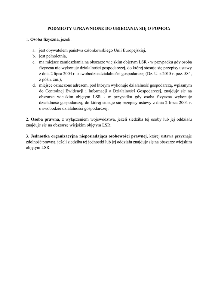 PODMIOTY UPRAWNIONE DO UBIEGANIA SIĘ O POMOC: 1. Osoba fizyczna, jeżeli: a. jest obywatelem państwa członkowskiego Unii Europejskiej, b. jest pełnoletnia, c. ma miejsce zamieszkania na obszarze wiejskim objętym LSR - w przypadku gdy osoba fizyczna nie wykonuje działalności gospodarczej, do której stosuje się przepisy ustawy z dnia 2 lipca 2004 r. o swobodzie działalności gospodarczej (Dz. U. z 2015 r. poz. 584, z późn. zm.), d. miejsce oznaczone adresem, pod którym wykonuje działalność gospodarczą, wpisanym do Centralnej Ewidencji i Informacji o Działalności Gospodarczej, znajduje się na obszarze wiejskim objętym LSR - w przypadku gdy osoba fizyczna wykonuje działalność gospodarczą, do której stosuje się przepisy ustawy z dnia 2 lipca 2004 r. o swobodzie działalności gospodarczej; 2. Osoba prawna, z wyłączeniem województwa, jeżeli siedziba tej osoby lub jej oddziału znajduje się na obszarze wiejskim objętym LSR; 3. Jednostka organizacyjna nieposiadająca osobowości prawnej, której ustawa przyznaje zdolność prawną, jeżeli siedziba tej jednostki lub jej oddziału znajduje się na obszarze wiejskim objętym LSR.