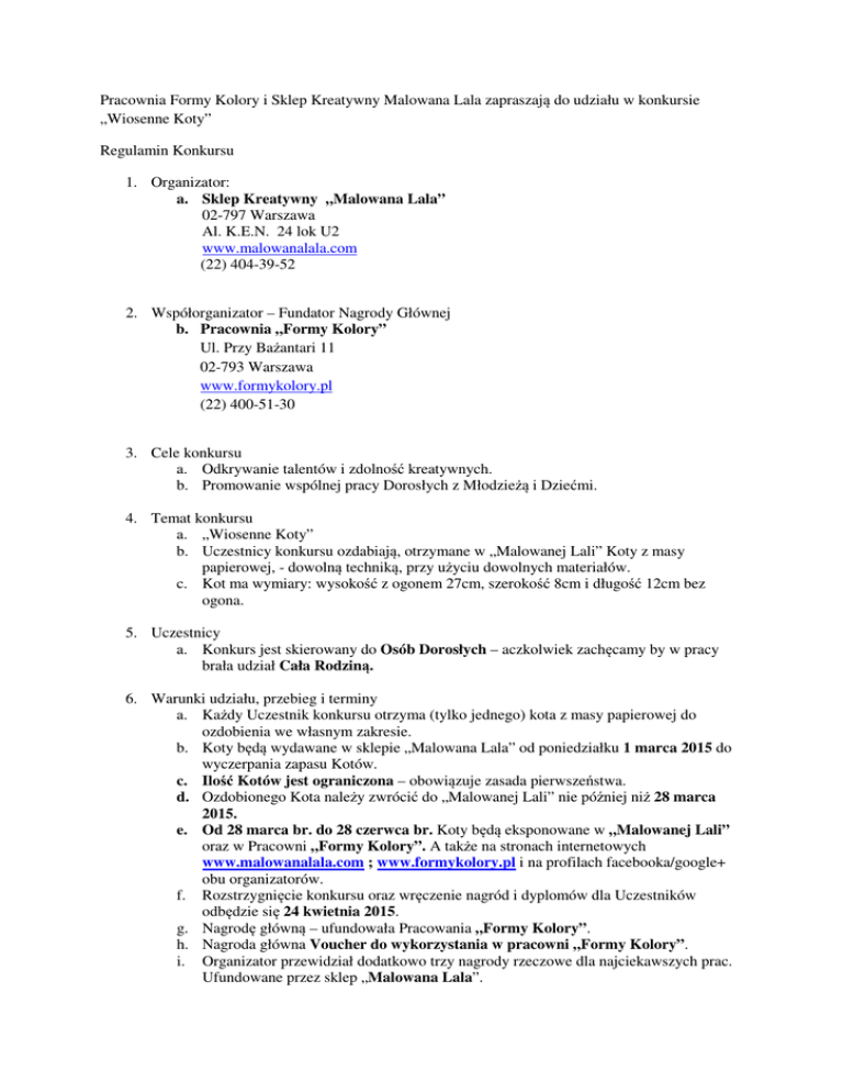 Pracownia Formy Kolory i Sklep Kreatywny Malowana Lala zapraszają do udziału w konkursie „Wiosenne Koty” Regulamin Konkursu 1. Organizator: a. Sklep Kreatywny „Malowana Lala” 02-797 Warszawa Al. K.E.N. 24 lok U2 www.malowanalala.com (22) 404-39-52 2. Współorganizator – Fundator Nagrody Głównej b. Pracownia „Formy Kolory” Ul. Przy Bażantari 11 02-793 Warszawa www.formykolory.pl (22) 400-51-30 3. Cele konkursu a. Odkrywanie talentów i zdolność kreatywnych. b. Promowanie wspólnej pracy Dorosłych z Młodzieżą i Dziećmi. 4. Temat konkursu a. „Wiosenne Koty” b. Uczestnicy konkursu ozdabiają, otrzymane w „Malowanej Lali” Koty z masy papierowej, - dowolną techniką, przy użyciu dowolnych materiałów. c. Kot ma wymiary: wysokość z ogonem 27cm, szerokość 8cm i długość 12cm bez ogona. 5. Uczestnicy a. Konkurs jest skierowany do Osób Dorosłych – aczkolwiek zachęcamy by w pracy brała udział Cała Rodziną. 6. Warunki udziału, przebieg i terminy a. Każdy Uczestnik konkursu otrzyma (tylko jednego) kota z masy papierowej do ozdobienia we własnym zakresie. b. Koty będą wydawane w sklepie „Malowana Lala” od poniedziałku 1 marca 2015 do wyczerpania zapasu Kotów. c. Ilość Kotów jest ograniczona – obowiązuje zasada pierwszeństwa. d. Ozdobionego Kota należy zwrócić do „Malowanej Lali” nie później niż 28 marca 2015. e. Od 28 marca br. do 28 czerwca br. Koty będą eksponowane w „Malowanej Lali” oraz w Pracowni „Formy Kolory”. A także na stronach internetowych www.malowanalala.com ; www.formykolory.pl i na profilach facebooka/google+ obu organizatorów. f. Rozstrzygnięcie konkursu oraz wręczenie nagród i dyplomów dla Uczestników odbędzie się 24 kwietnia 2015. g. Nagrodę główną – ufundowała Pracowania „Formy Kolory”. h. Nagroda główna Voucher do wykorzystania w pracowni „Formy Kolory”. i. Organizator przewidział dodatkowo trzy nagrody rzeczowe dla najciekawszych prac. Ufundowane przez sklep „Malowana Lala”. Po rozstrzygnięciu konkursu Państwa Koty będą inspirowały Gości Pracowni Formy Kolory i Malowanej Lali. k. Od 28 czerwca 2015 Uczestnicy będą mogli odebrać swoje prace. l. Organizator zastrzega sobie prawo do opublikowania imion laureatów na stronie internetowej. j. 7. Nagrody a. Oceny i wyboru prac dokona Komisja Konkursowa (Jury) do 21 kwietnia 2015. b. Nagrody rzeczowe są przeznaczone dla trzech najciekawszych prac. c. Nagroda główna: voucher do wykorzystania w pracowni „Formy Kolory” ważny przez 90 dni od poinformowania o przyznaniu nagrody. 8. Ustalenia Końcowe a. Organizator zastrzega sobie prawo zmiany regulaminu. b. W przypadkach nieobjętych niniejszym regulaminem rozstrzyga Organizator konkursu. Organizatorzy: Sklep Kreatywny „Malowana Lala” i Pracownia „Formy Kolory”