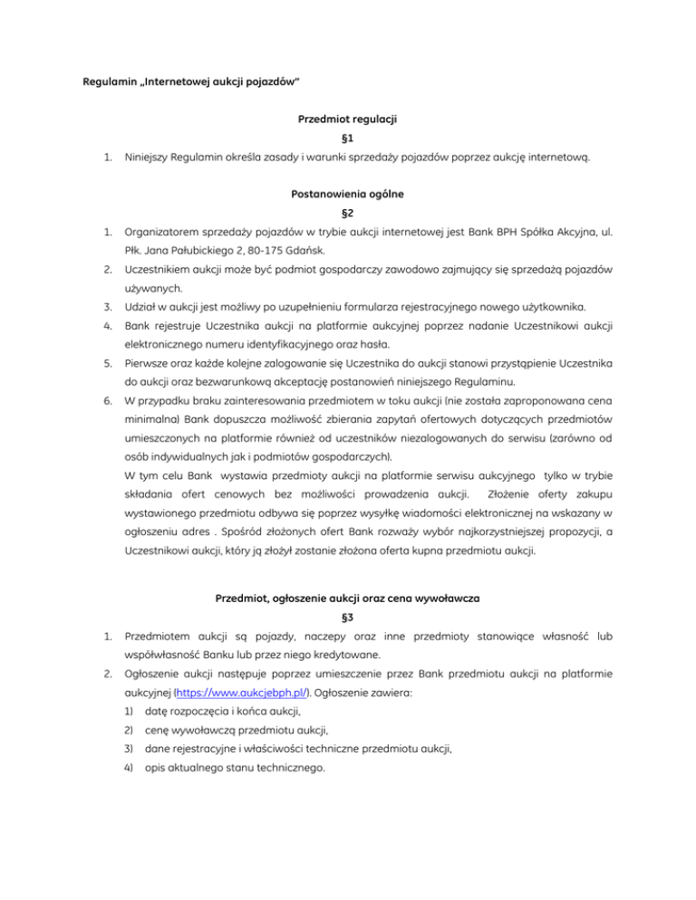 Regulamin „Internetowej aukcji pojazdów” Przedmiot regulacji §1 1