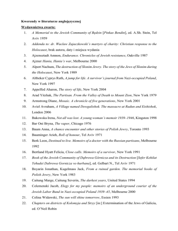 Kwerendy w literaturze anglojęzycznej Wydawnictwa zwarte: 1. A Memorial to the Jewish Community of Będzin [Pinkas Bendin], ed. A.Sh. Stein, Tel Aviv 1959 2. Addenda to: dr. Waclaw Zajaczkowski’s martyrs of charity: Christian response to the Holocaust, brak autora, daty i miejsca wydania 3. Ajzensztadt Amnon, Endurance. Chronicles of Jewish resistance, Oakville 1987 4. Ajzner Hania, Hania’s war, Melbourne 2000 5. Alpert Nachum, The destruction of Slonim Jewry. The story of the Jews of Slonim during the Holocaust, New York 1989 6. Altbeker Cyprys Ruth, A jump for life. A survivor’s journal from Nazi-occupied Poland, New York 1997 7. Appelfed Aharon, The story of life, New York 2004 8. Arad Yitzhak, The Partisan. From the Valley of Death to Mount Zion, New York 1979 9. Armstrong Diane, Mosaic. A chronicle of five generations, New York 2001 10. Aviel Avraham, A Village named Dowgalishok. The massacre at Radun and Eishishok, London 2006 11. Bakowska Irena, Not all was lost. A young woman’s memoir 1939–1946, Kingston 1998 12. Bar Oni Bryna, The vapor, Chicago 1976 13. Baum Anna, A chance encounter and other stories of Polish Jewry, Toronto 1993 14. Bauminger Arieh, Roll of honour, Tel Aviv 1971 15. Berk Leon, Destined to live. Memoirs of a doctor with the Russian partisans, Melbourne 1992 16. Bertland Hyatt Felicia, Close calls. Memoirs of a survivor, New York 1991 17. Book of the Jewish Community of Dąbrowa Górnicza and its Destruction [Sefer Kehilat Yehudei Dabrowa Gornicza ve-hurbana], ed. Gelbart N., Tel Aviv 1971 18. Boyarin Jonathan, Kugelmass Jack, From a ruined garden. The memorial books of Polish Jewry, New York 1983 19. Caitung Marge, Caitung Severin, The darkest years, United States 1994 20. Celemenski Jacob, Elegy for my people: memoirs of an underground courier of the Jewish Labor Bund in Nazi-occupied Poland 1939–45, Melbourne 2000 21. Celina Widawski, The sun will shine tomorrow, Essien 1993 22. Chapters on districts of Kolomyja and Stryy [in:] Extermination of the Jews of Galicia, ed. O’Neil Robin 23. Chrzanow: the Life and Destruction of a Jewish Shtetl [Sefer Chrzanow; lebn un umkum fun a yidish shtetl], ed. Mordechai Bochner, Jonathan Boyarin, Roslyn Harbor 1989 24. Contested memories. Poles and Jews during the Holocaust and its aftermath, ed. Joshua D. Zimmerman, New Brunswick 2003 25. Cukierman Doba-Necha, A Guardian Angel. Memoires of Lublin, Australia 1997 26. Darkness and desolation: in memory of the communities of Braslaw, Dubene, Jaisi, Jod, Kislowszczizna, Okmienic, Opsa, Plusy, Rimszan, Slobodka, Zamosz, Zaracz, ed. Ariel Machnes, Rina Klinov, Israel 1986 27. David Janina, A Touch of Earth. A Wartime Childhood, London 1966 28. Dean Martin, Collaboration in the Holocaust. Crimes of the local police in Belorussia and Ukraine, 1941–44, New York 2000 29. Drix Samuel, Witness of Annihilation. Surviving the Holocaust. A Memoir, WashingtonLondon 1994 30. Drohitchin. 500 years of Jewish life [Drohiczyn; finf hundert yor yidish lebn], ed. Dov Warshasky, Chicago 1958 31. Drukier Manny, Carved in stone. Holocaust years − a boy’s tale, Toronto 1996 32. Duffy Peter, The Bielski brothers: The true story of three men who defied the Nazis, built a village in the forest, and saved 1,200 Jews, New York 2003 33. Eber Irene, The choice. Poland 1939–1945, New York 2004 34. Eidintas Alfoonsas, Jews, Lithuanians and the Holocaust, Vilnius 2003 35. Eisner Jack, The Survivor, New York 1980 36. Encyclopedia of Jewish communities: Poland, vol. 2, ed. Danuta Dabrowska, Abraham Wein, Aharon Weiss, Jerusalem 1976 37. Encyclopedia of Jewish communities: Poland, vol. 3, ed. Danuta Dabrowska, Abraham Wein, Aharon Weiss, Jerusalem 1976 38. Eternal flame. In memory of Dolhinow [Esh tamid - yizkor le-Dolhinow; sefer zikaron le-kehilat Dolhinow ve-ha-seviva], ed. Matityahu Bar-Razon, Josef Chrust, Tel-Aviv 1984 39. Fogelman Eva, Conscience and Courage. Rescuers of Jews during the Holocaust, New York 1994 40. Fresh wounds. Early narratives of Holocaust survival, ed. Donald Niewyk, Chapel Hill 1998 41. Friedländer Saul, Nazi Germany and the Jews, 1939–1945: The Years of Extermination, New York 2009 42. Friedman Philip, Their brothers’ keepers, New York 1978 43. Geier Arnold, Heroes of the Holocaust, New York 1998 44. Gilbert Martin, The Holocaust. The Jewish tragedy, London 1986 45. Gilbert Martin, The righteous. The unsung heroes of the Holocaust, New York 2003 46. Goldberg Shiye, The undefeated, Tel Aviv 1985 47. Goldstein Bernard, The stars bear witness, New York 1949 48. Goldstein Charles, The bunker, New York 1973 49. Gruber Samuel, I chose life, New York 1978 50. Gurdus-Krugman Luba, The death train. Personal account of a Holocaust survivor, New York 1978 51. Gut Opdyke Irene, Elliot Jeffrey, Into the flames. The life story of a righteous gentile, San Bernardino 1992 52. Hagstrom Suzan, Sara’s children and the destruction of Chmielnik, Spotsylvania 2001 53. Hart Kitty, I Am Alive, London 1961 54. Hearth Hill Amy, Norman Salsitz, Amalie Petranker-Salsitz, In a world gone mad. A heroic story of love, faith and survival, New York 2001 55. Hilberg Raul, Perpetrators, victims, bystanders. The Jewish catastrophe, 1933–1945, New York 1992 56. Hopfeld Gitel, At the mercy of strangers. Survival in Nazi occupied Poland, OakvilleNiagara Falls 2005 57. Horchiv memorial book [Sefer Horochow], ed. Dan Haim, Kariv Yosef, Tel Aviv 1966 58. Huneke Douglas, The Moses of Rovno: the stirring story of Fritz Graebe, a German Christian who risked his life to lead hundreds of Jews to safety during the Holocaust, New York 1985 59. I remember every day… The fates of the Jews of Przemyśl during World War II, ed. John Hartman, Jacek Krochmal, Przemyśl 2002 60. If I forget thee... The destruction of the shtetl Butrimantz. Testimony by Riva Lozansky and other witnesses, ed. Lily Poritz-Miller, Olga Zabludoff, Washington 1998 61. Janger Kathleen, Korenblit Michael, Until we meet again. A tr