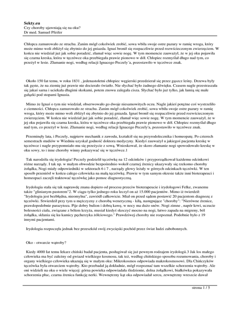 Sekty.eu Czy choroby ujawniają się na oku? Dr med. Samuel Pfeifer Chłopca zamurowało ze strachu. Zanim mógł cokolwiek zrobić, sowa wbiła swoje ostre pazury w ramię wroga, który może mimo woli zbliżył się zbytnio do jej gniazda. Ignaś bronił się rozpaczliwie przed rozwścieczonym zwierzęciem. W końcu nie wiedział już jak sobie poradzić, złamał więc sowie nogę. W tym momencie zauważył, że w jej oku pojawiła się czarna kreska, która w tęczówce oka przebiegała prawie pionowo w dół. Chłopiec rozmyślał długo nad tym, co przeżył w lesie. Złamanie nogi, według relacji Ignacego Peczely´a, pozostawiło w tęczówce znak. Około 150 Iat temu, w roku 1831 , jedenastoletni chłopiec węgierski przedzierał się przez gąszcz leśny. Drzewa były tak gęste, że na ziemię już prawie nie docierało światło. Nie słychać było żadnego dźwięku. Czasem nagle przestraszała się jakaś sarna i uciekała długimi skokami, potem znowu zalegała cisza. Słychać było już tylko, jak łamią się małe gałązki pod stopami Ignasia. Mimo że Ignaś o tym nie wiedział, obserwowało go dwoje niesamowitych oczu. Nagle jakieś potężne coś wystrzeliło z ciemności. Chłopca zamurowało ze strachu. Zanim mógł cokolwiek zrobić, sowa wbiła swoje ostre pazury w ramię wroga, który może mimo woli zbliżył się zbytnio do jej gniazda. Ignaś bronił się rozpaczliwie przed rozwścieczonym zwierzęciem. W końcu nie wiedział już jak sobie poradzić, złamał więc sowie nogę. W tym momencie zauważył, że w jej oku pojawiła się czarna kreska, która w tęczówce oka przebiegała prawie pionowo w dół. Chłopiec rozmyślał długo nad tym, co przeżył w lesie. Złamanie nogi, według relacji Ignacego Peczely'a, pozostawiło w tęczówce znak. Przeminęły lata, i Peczely, najpierw mechanik z zawodu, kształcił się na przyrodolecznika i homeopatę. Po czterech semestrach studiów w Wiedniu uzyskał godność doktora medycyny. Kiedyś zauważył u jakiegoś pacjenta kreskę w tęczówce i nagle przypomniało mu się przeżycie z sową. Wnioskował, że skoro złamanie nogi spowodowało kreskę w oku sowy, to i inne choroby winny pokazywać się w tęczówce.1 Tak narodziła się irydologia! Peczely podzielił tęczówkę na 12 odcinków i przyporządkował każdemu odcinkowi różne narządy. I tak np. w małym obwodzie bezpośrednio wokół czarnej źrenicy ukazywały się rzekomo choroby żołądka, Nogi miały odpowiedniki w sektorach 6 i 7 , narządy głowy leżały w górnych odcinkach tęczówki. W ten sposób przeniósł w końcu całego człowieka na małą tęczówkę. Prawie w tym samym okresie także inni bioterapeuci i homeopaci zaczęli traktować tęczówkę jako pomoc diagnostyczną. Irydologia stała się tak naprawdę znana dopiero od procesu przeciw bioterapeucie i irydologowi Felke, zwanemu także "glinianym pastorem"2. W ciągu tylko jednego roku leczył on aż 15.000 pacjentów. Mimo iż twierdził: "Irydologia jest bezbłędna, nieomylna", zawiódł całkowicie. Miał on przed sądem postawić 20 pacjentom diagnozę z tęczówki. Stwierdził przy tym u mężczyzny z chorobą weneryczną - kiłą, następujące "choroby": "Nierówne źrenice, prawdopodobnie parazytoza. Pije dobry bulion i dobrą kawę, w nocy ma dużo snów. Nogi zimne , napór krwi, uczucie bolesności ciała, związane z bólem krzyża, musiał kiedyś skoczyć mocno na nogi, łatwo zapada na migreny, ból żołądka, skłania się ku kamicy pęcherzyka żółciowego." Prawdziwej choroby nie rozpoznał. Podobnie było z 19 innymi pacjentami. Irydologia rozpoczęła jednak bez przeszkód swój zwycięski pochód przez świat Iudzi zabobonnych. Oko - otwarcie wątroby? Kiedy 4000 Iat temu Iekarz chiński badał pacjenta, posługiwał się już pewnym rodzajem irydologii.3 Jak los małego człowieka ma być zależny od gwiazd wielkiego kosmosu, tak też, według chińskiego sposobu rozumowania, choroby i organy wielkiego człowieka ukazują się w małym oku: Mikrokosmos odpowiada makrokosmosowi. Dla Chińczyków tęczówka była otwarciem wątroby. Kto przebadał ją dokładnie, mógł rozpoznać tam wszelkie schorzenia wątroby. Ale oni widzieli na oku o wiele więcej: górna powieka odpowiadała śledzionie, dolna żołądkowi, białkówka pokazywała schorzenia płuc, czarna źrenica funkcję nerki. Wewnętrzny kąt oka odpowiadał sercu, zewnętrzny wreszcie dawał strona 1 / 5 Sekty.eu Czy choroby ujawniają się na oku? Dr med. Samuel Pfeifer poznanie serca i jelita cienkiego. Szara eminencja u źródeł dzisiejszej bioterapii Paracelsus, widział oko jako mikrokosmos, człowieka jako makrokosmos i tworzył związki z astrologią.4 Odpowiednia nauka o makrokosmosie i mikrokosmosie stanowi jednak nie tylko podstawę astrologii, ale także czytania z linii ręki, magii jak i akupunktury, oraz masażu receptorów stóp, jak to widzieliśmy w poprzednich rozdziałach. A nauka ta była wśród bioterapeutów w czasach Ignacego Peczely'a rozpowszechniona nie mniej niż w naszych czasach. Astrolog Libra pisał na początku XIX wieku na temat "Zodiacus (zwierzyniec) des Auges" (Zodiak oka): "Dlaczego wszystko, co dzieje się w ciele, musi wyrażać się w tęczówce? Z tego samego powodu, z którego w człowieku odbija się wszystko, co dzieje się w kosmosie. W oku kosmos człowieka odzwierciedla się w momencie jego narodzin, jak również zjawiska, które zachodziły w nim od tamtego momentu. Nie jest konieczne wykazanie, że to odzwierciedlenie ma miejsce także w każdej innej części ciała, ale tęczówka nadaje się najlepiej do obserwacji. "5 To, że podział tęczówki na dwanaście części, jak przyjmują irydolodzy, odnosi się do podziału pól astrologicznego zodiaku - jest tu widoczne.6 Obecnie wielu irydologów wstydliwie neguje pochodzenie swojej sztuki i podejmuje próby pseudonaukowego wyjaśniania jej, aby uczynić swoją działalność towar