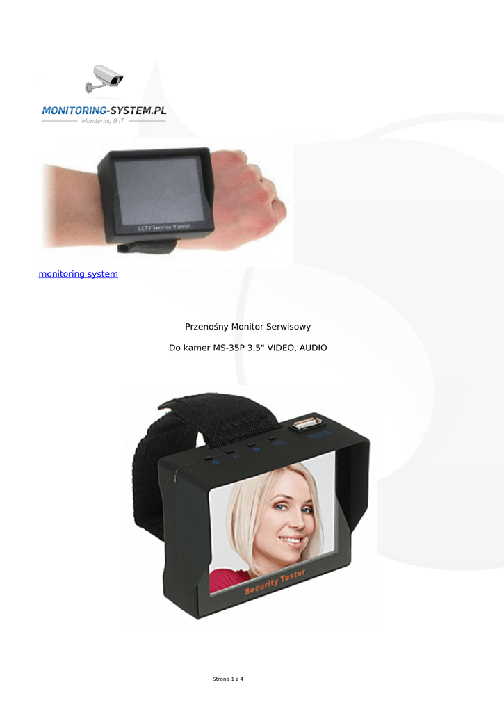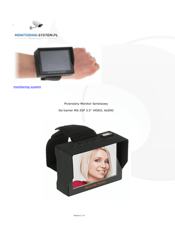 monitoring system Przenośny Monitor Serwisowy Do kamer MS-35P 3.5" VIDEO, AUDIO Strona 1 z 4 Kolorowy monitor serwisowy w znacznym stopniu ułatwiający konfigurację systemów CCTV. Dzięki niewielkim rozmiarom urządzenie to w bardzo szybki i prosty sposób można podłączyć do kamery lub rejestratora i skonfigurować ich parametry. Zasilanie z akumulatorów lub z zasilacza sprawia, że monitor jest idealnym urządzeniem testowym podczas uruchamiania systemów CCTV, jak również dla wszelkich urządzeń z wyjściem video composite (AV). Dodatkowym atutem jest możliwość zasilania urządzeń napięciem DC 12V i max. obciążeniu 500mA, a także długi czas pracy. Monitor posiada obudowę wykonaną z tworzywa sztucznego. DANE TECHNICZNE Strona 2 z 4 Przekątna wyświetlacza: 3.5" Rozdzielczość nominalna: 320 x 240 Jasność: 250 cd/m² Kontrast: 400 : 1 Czas odpowiedzi: 10 ms Liczba wej. video: 1 (1.0Vp-p, Cinch - kolor czerwony) Liczba wyj. video: 1 (jack stereo 3.5mm) Liczba wej. audio: 1 (0.7Vp-p, Cinch - kolor żółty) Regulacja obrazu: Tak, jasność Wbudowany głośnik Funkcja uśpienia: Tak z funkcją wyciszenia Tak, po 3 min braku syg. video Zasilanie urządzeń zewnętrznych z monitora: DC 12V, max. 500mA Standard sygnału video: NTSC/PAL auto Zasilanie: Akumulatory: 2200 mAh (wbudowane), Zasilacz DC 5V (w komplecie wymagana przejściówka WS-PL/GS-USA) Wymiary: 93 x 73 x 42 mm Masa: 160 g Strona 3 z 4 UWAGA! W dołączonym do kompletu przewodzie 2x Cinch na USB do sygnału video wykorzystano wtyk cinch czerwony, a do audio żółty. Strona 4 z 4