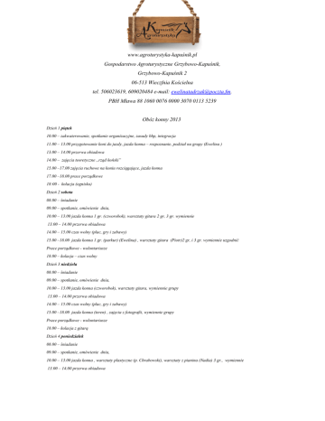 www.agroturystyka-kapuśnik.pl Gospodarstwo Agroturystyczne Grzybowo-Kapuśnik, Grzybowo-Kapuśnik 2 06-513 Wieczfnia Kościelna tel. 506023619, 609020484 e-mail: [email protected]. PBH Mława 88 1060 0076 0000 3070 0113 5239 Obóz konny 2013 Dzień 1 piątek 10.00 – zakwaterowanie, spotkanie organizacyjne, zasady bhp, integracja 11.00 – 13.00 przygotowanie koni do jazdy, jazda konna – rozpoznanie, podział na grupy (Ewelina ) 13.00 – 14.00 przerwa obiadowa 14.00 – zajęcia teoretyczne „rząd koński” 15.00 –17.00 zajęcia ruchowe na koniu rozciągające, jazda konna 17.00 –18.00 prace porządkowe 18:00 - kolacja (ognisko) Dzień 2 sobota 08.00 – śniadanie 09.00 – spotkanie, omówienie dnia, 10.00 – 13.00 jazda konna 1 gr. (czworobok), warsztaty gitara 2 gr, 3 gr. wymiennie 13.00 – 14.00 przerwa obiadowa 14.00 – 15.00 czas wolny (plac, gry i zabawy) 15.00 –18.00 jazda konna 1 gr. (parkur) (Ewelina) , warsztaty gitara (Piotr)2 gr, i 3 gr. wymiennie uzgodnić Prace porządkowe - wolontariusze 18.00 – kolacja – czas wolny Dzień 3 niedziela 08.00 – śniadanie 09.00 – spotkanie, omówienie dnia, 10.00 – 13.00 jazda konna (czworobok), warsztaty gitara, wymiennie grupy 13.00 – 14.00 przerwa obiadowa 14.00 – 15.00 czas wolny (plac, gry i zabawy) 15.00 –18.00 jazda konna (teren) , zajęcia z fotografii, wymiennie grupy Prace porządkowe - wolontariusze 18.00 – kolacja z gitarą Dzień 4 poniedziałek 08.00 – śniadanie 09.00 – spotkanie, omówienie dnia, 10.00 – 13.00 jazda konna , warsztaty plastyczne (p. Chrabowski), warsztaty z pianina (Nadia) 3 gr., wymiennie 13.00 – 14.00 przerwa obiadowa 14.00 – 15.00 zajęcia teoretyczne (ekwipunek jeźdźca) 15.00 –18.00 jazda konna , warsztaty plastyczne (p. Chrabowski), warsztaty pianino (Nadia) wymiennie Prace porządkowe – Nadia, Iza 18.00 – kolacja – czas wolny Dzień 5 wtorek 08.00 – śniadanie 09.00 – spotkanie, omówienie dnia, 10.00 – 13.00 jazda konna 1 gr. (czworobok), warsztaty plastyczne (Krzysztof ) warsztaty pianino 3 gr. wymiennie 13.00 – 14.00 przerwa obiadowa 14.00 – 15.00 czas wolny (plac, gry i zabawy) 15.00 –18.00 ćwiczenia woltyżerka,, warsztaty plastyczne (Krzysztof) i (Renata) wymiennie 18.00 – kolacja – czas wolny Dzień 6 środa 08.00 – śniadanie 09.00 – spotkanie, omówienie dnia, 10.00 – 13.00 zajęcia powożenie dwie gr., warsztaty pianino 3 gr 13.00 – 14.00 przerwa obiadowa 14.00 – 15.00 czas wolny (plac, gry i zabawy) 15.00 –18.00 jazda konna , ćwiczenia ruchowe na koniu, nauka lonżowania – wymiennie Prace porządkowe -wszyscy 18.00 – kolacja - czas wolny Dzień 7 czwartek 08.00 – śniadanie 09.00 – spotkanie, omówienie dnia, 10.00 – 13.00 jazda konna 1 gr. (czworobok, parkur), zajęcia teoretyczne (ustanawianie przywództwa w stadzie koni), wymiennie 13.00 – 14.00 przerwa obiadowa 14.00 – 15.00 czas wolny (plac, gry i zabawy) 15.00 –18.00 jazda konna (rajd), zajęcia kulinarne (Renia) Prace porządkowe - wszyscy 18.00 – kolacja – czas wolny Dzień 8 piątek 08.00 – śniadanie 09.00 – spotkanie, omówienie dnia, 10.00 – 13.00 jazda konna 1 gr. (czworobok), warsztaty gitara, zajęcia kulinarne, wymiennie 13.00 – 14.00 przerwa obiadowa 14.00 – 15.00 czas wolny (plac, gry i zabawy) 15.00 –18.00 jazda konna , zajęcia z fotografii, wymiennie 18.00 – kolacja – czas wolny Dzień 9 sobota 08.00 – śniadanie 09.00 – spotkanie, omówienie dnia, 10.00 – 13.00 zawody + zabawy z koniem 13.00 – 14.00 przerwa obiadowa 14.00 – 15.00 czas wolny (plac, gry i zabawy) 15.00 –18.00 warsztaty z fotografii (plener z końmi) 18.00 – kolacja – czas wolny Dzień 10 niedziela 08.00 – śniadanie 09.00 – spotkanie, omówienie dnia, 10.00 – 13.00 rajd konny, jazda konna, wymiennie 13.00 – 14.00 przerwa obiadowa 14.00 – 16.00 gry i zabawy 16.00 – 18.00 podsumowanie pobytu , zakończenie, kolacja Dzieci powinny zabrać ze sobą: Odzież jeździecka, kamizelki i kaski ochronne, czapkę z daszkiem, Kapcie, ręcznik oraz przybory toaletowe, Gitarę, aparat fotograficzny (jeśli ktoś posiada) Odzież sportową, kalosze + kurtkę nieprzemakalną Legitymacje